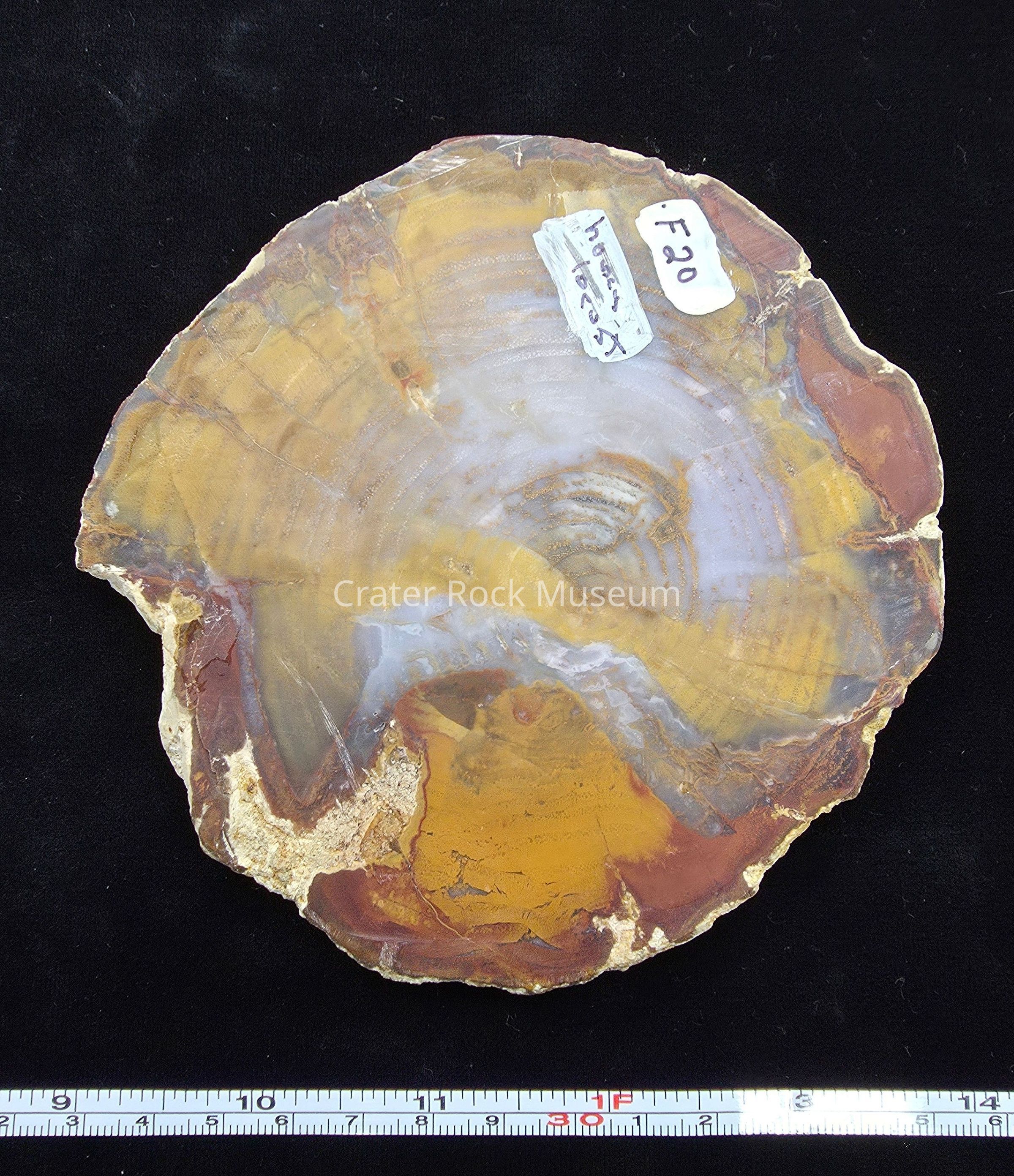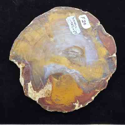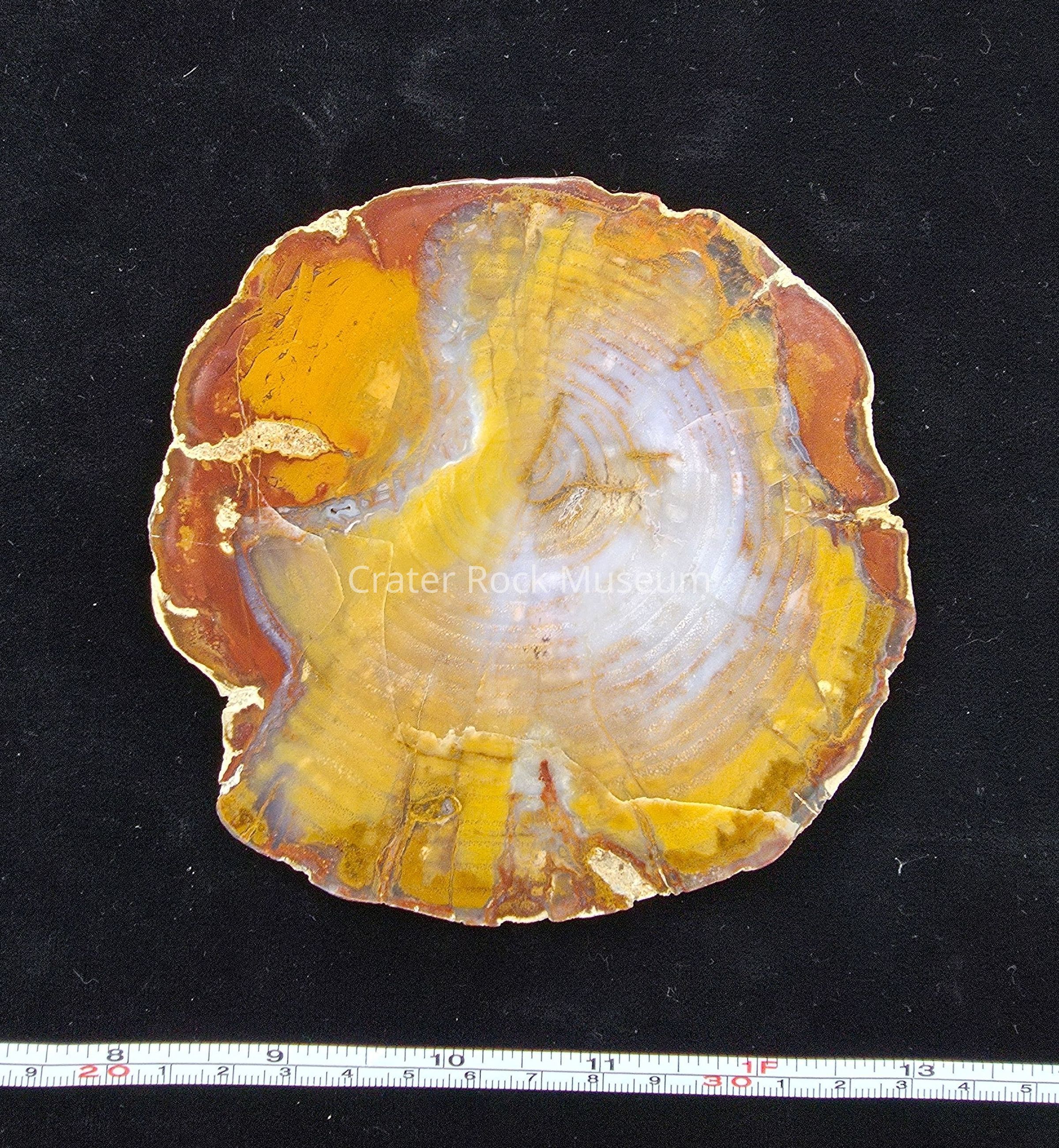 Complete round of yellow and blue-white material with brown-orange around the edge. Exterior is thin chalky grey matrix. Polished on one side.