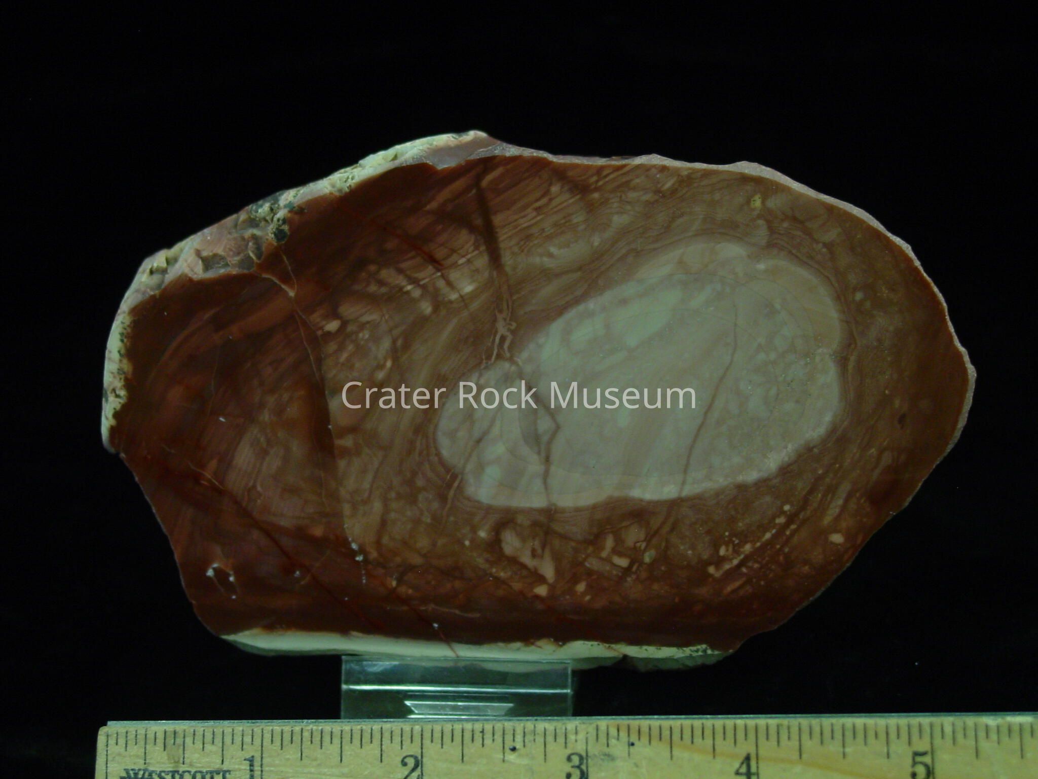 Description: Rough, rounded slab with polished face. Some banding with dark browns, to light to creamy beige in the center.