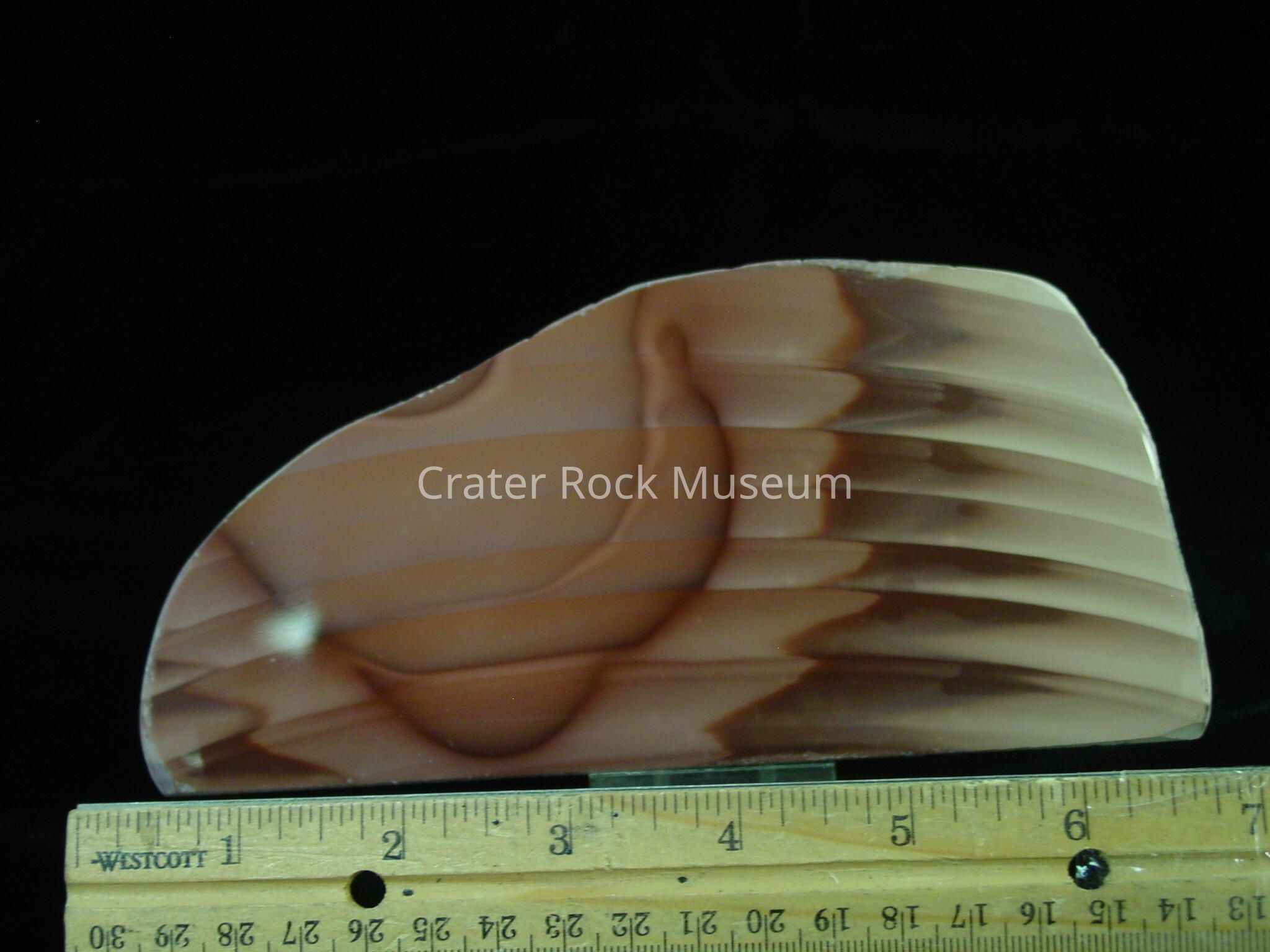 Description: Irregular, rounded back with polished face. Orbicular banding, dark, medium, and light beige, thick bands.Collection