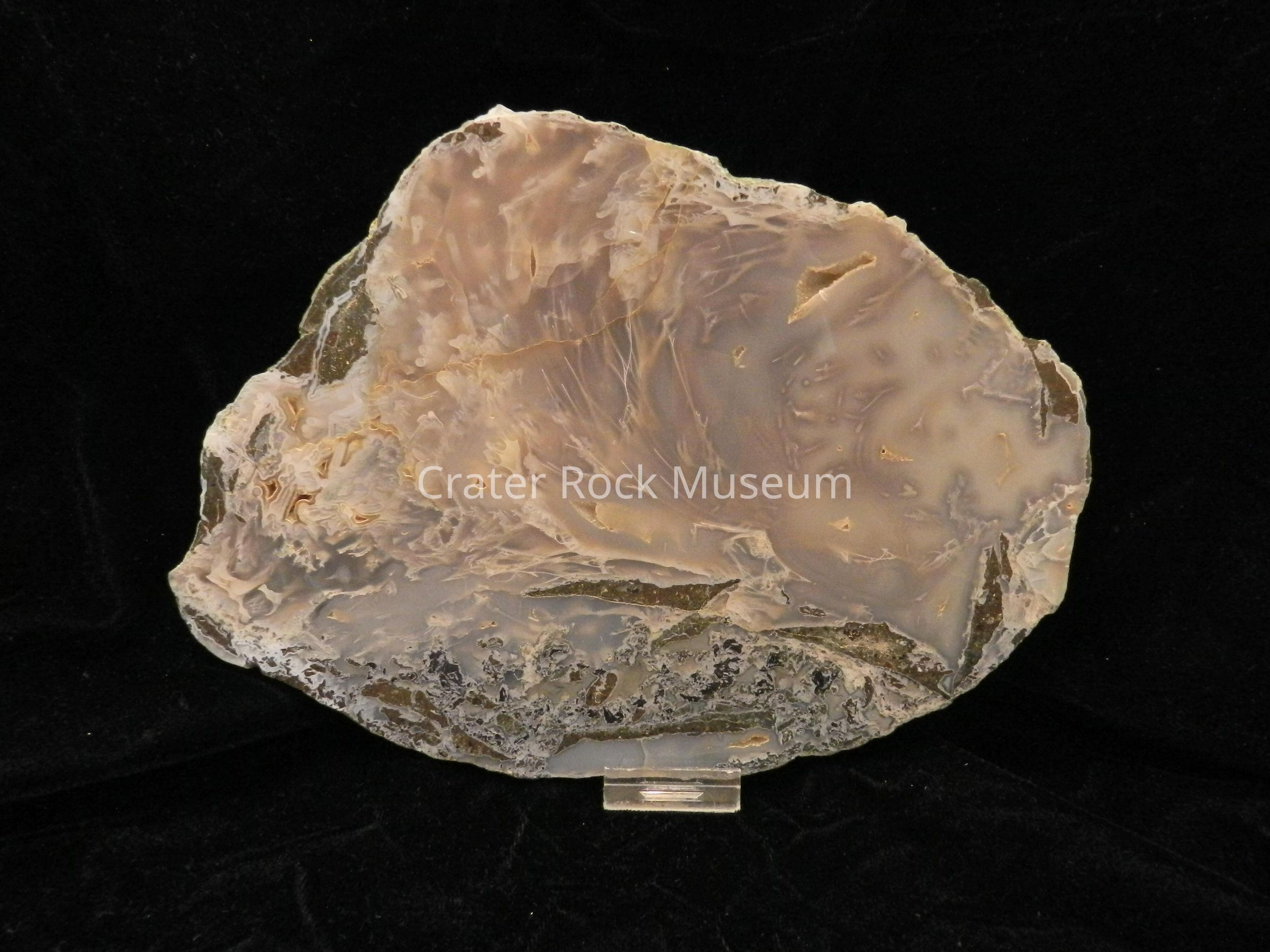 Description: (Delmar) Limbcast . Polished side shows gray and pinkish agate with gray and blue moss inclusions, some drystalline holes, and opaque green, brown, and black rock seen. Some cracks.