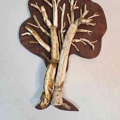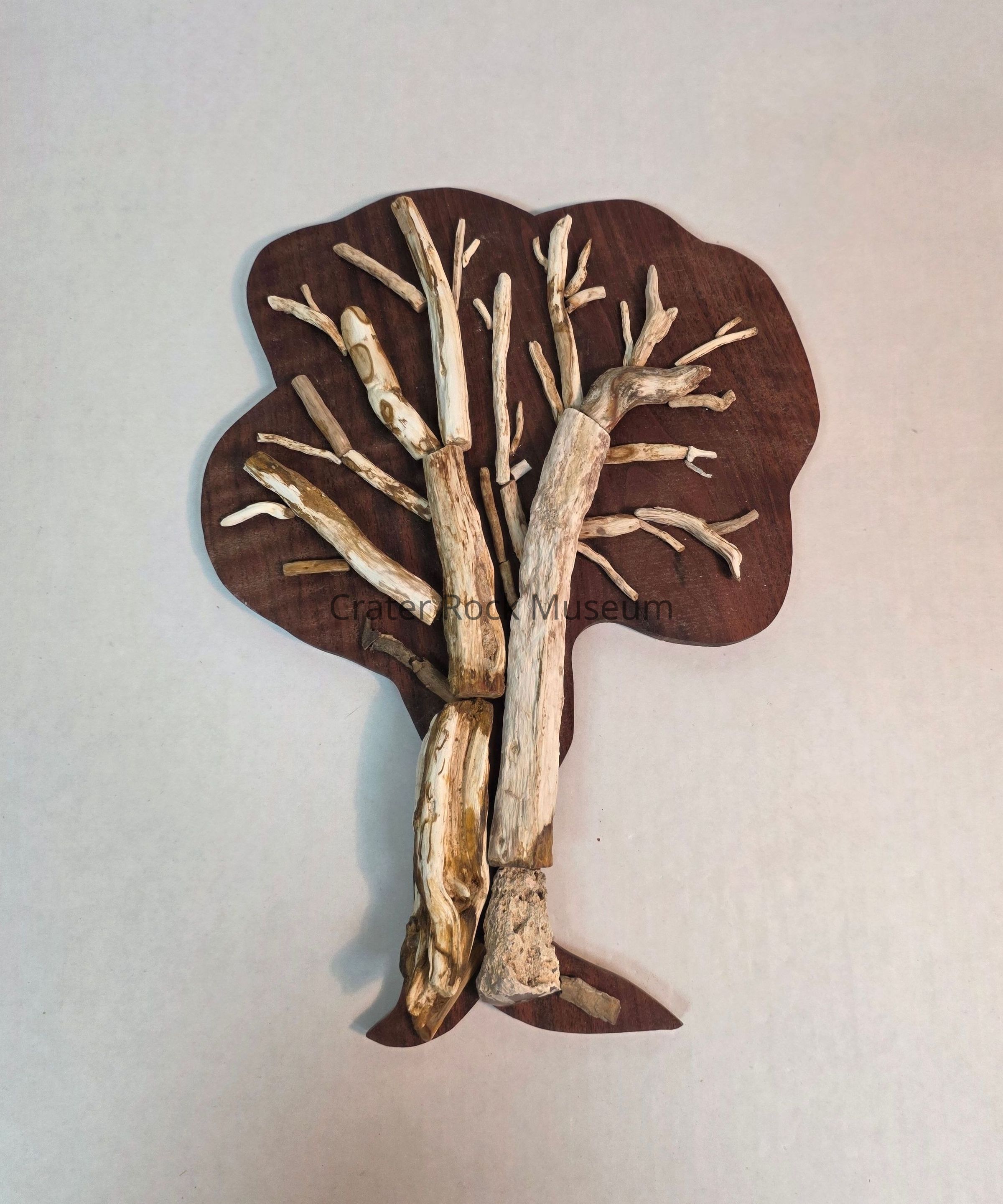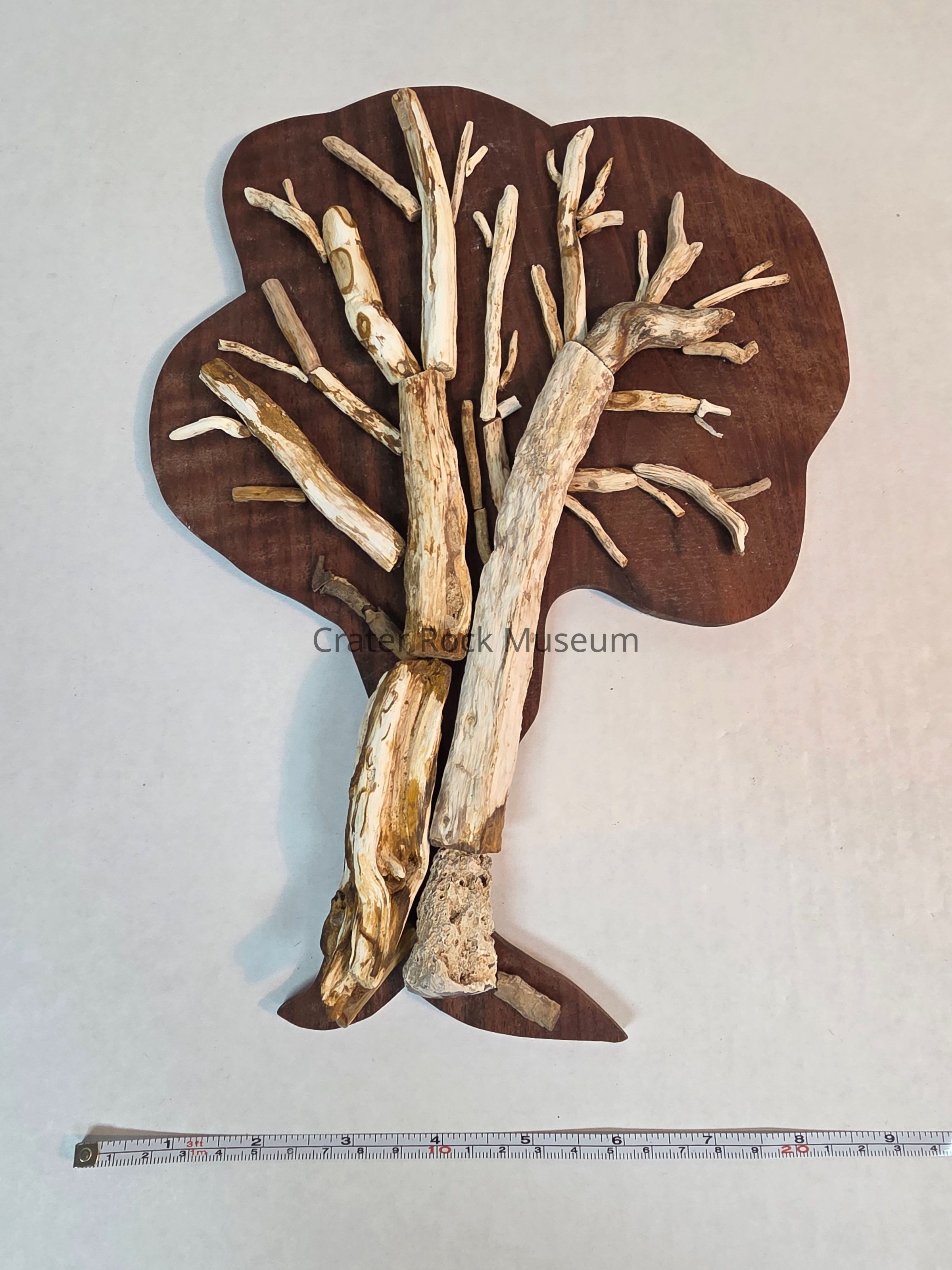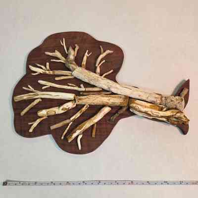 Multiple limb casts articulated into the shape of a tree, mounted to a dark wooden backboardLocation