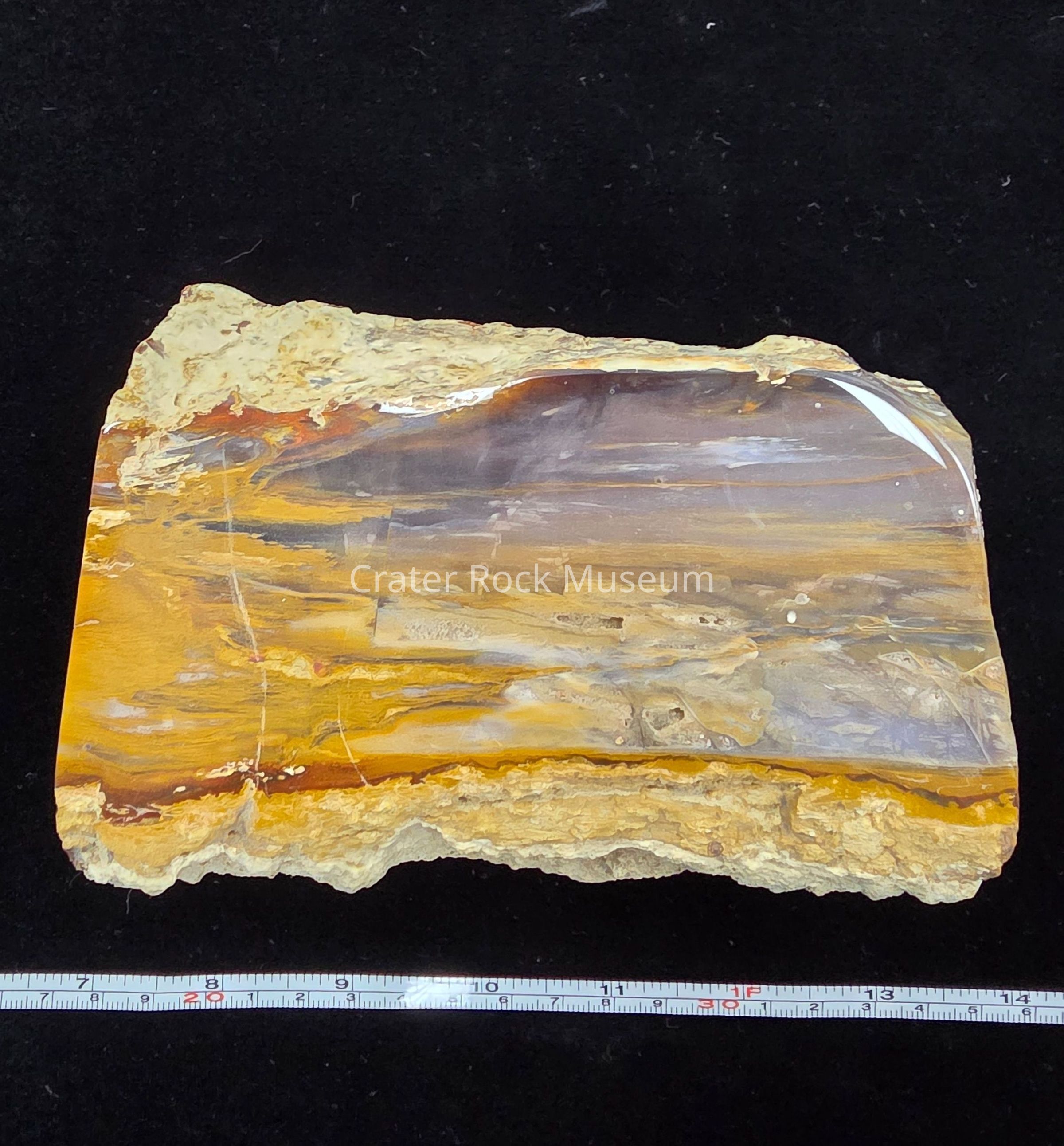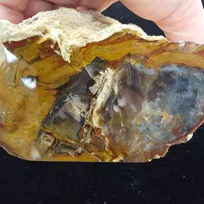 A rectangular faced wedge, polished on the face and one side of yellow-orange, blue-grey, brown, and grey in broadly straight lines across the face. A rough grey-tan matrix lines the long sides of the face and covers the entire reverse side.