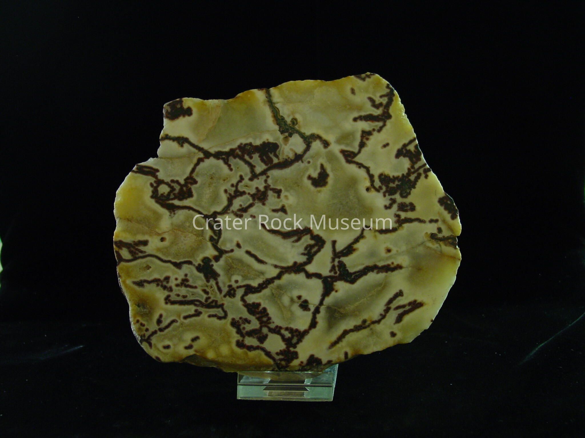 Description: Thin slab with polished face. Creamy white, tan and greenish-gray infused with brown dendritic veins throughout.Collection