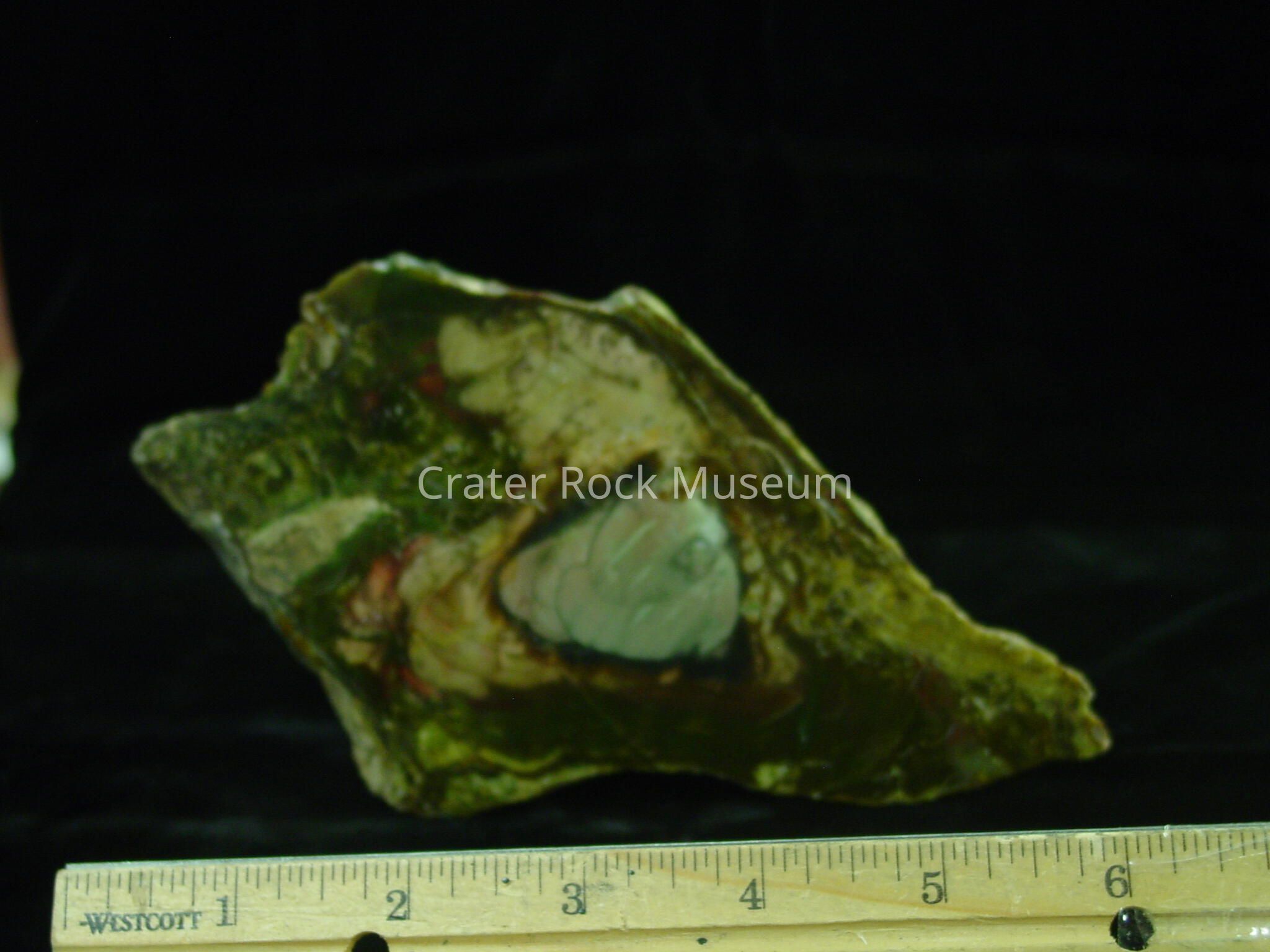 Description: Thick, irregularly-shaped back with polished face. Highly irregular olive green, beige, tan, pink, and gray patterns with some slight banding.Collection