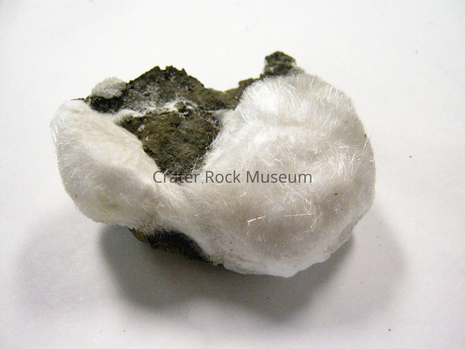 Description: Dark green/gray base with white, almost hair like crystals on top.