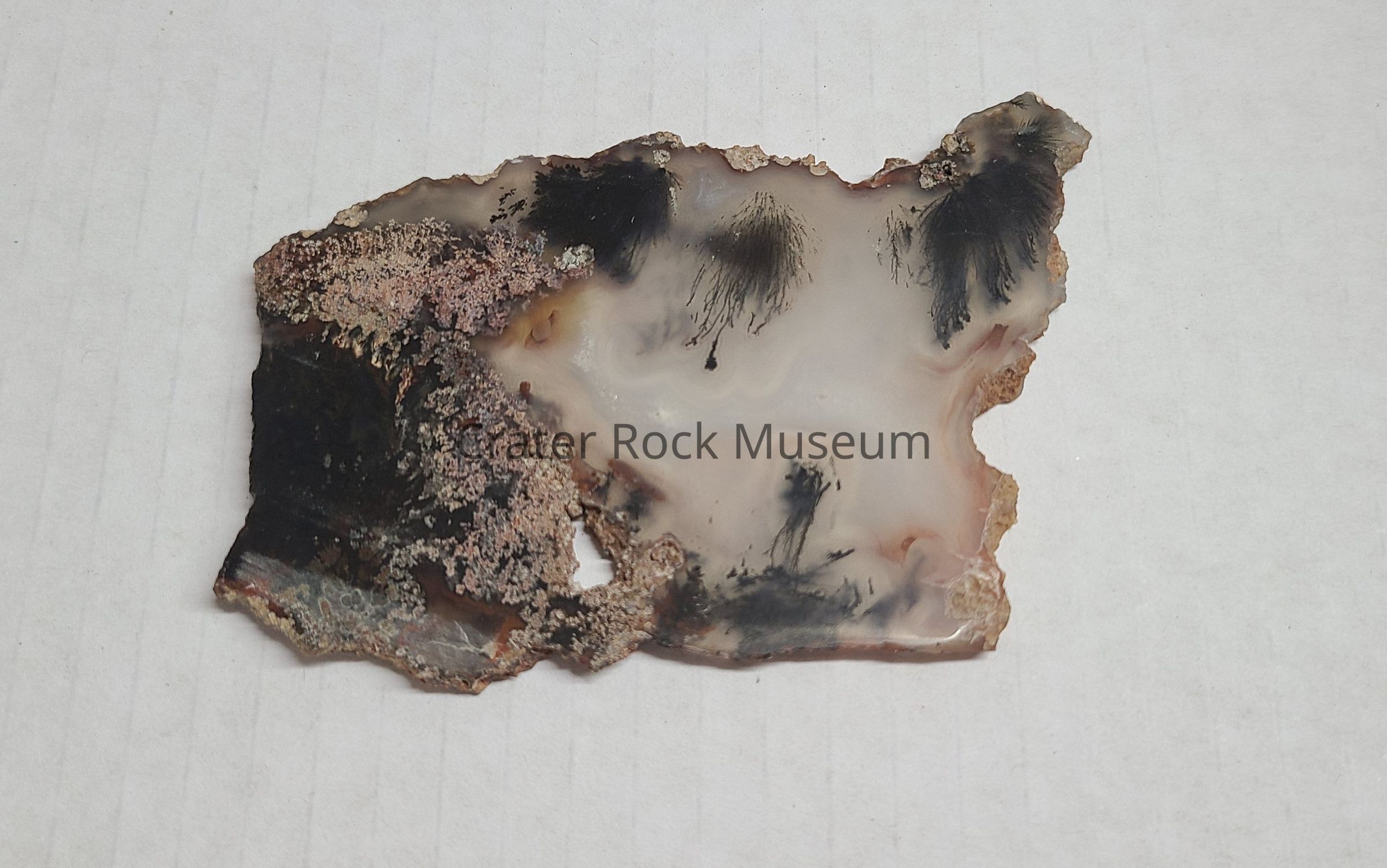 Two 1/8" (.3 cm) thick slices of Plume Agate from NM varying in size. Pieces are polished on both sides (one more than the other). Colors: Clear and Milky Agate, some Crystalline with Red and Black Plume. One contains some Pink.Collection