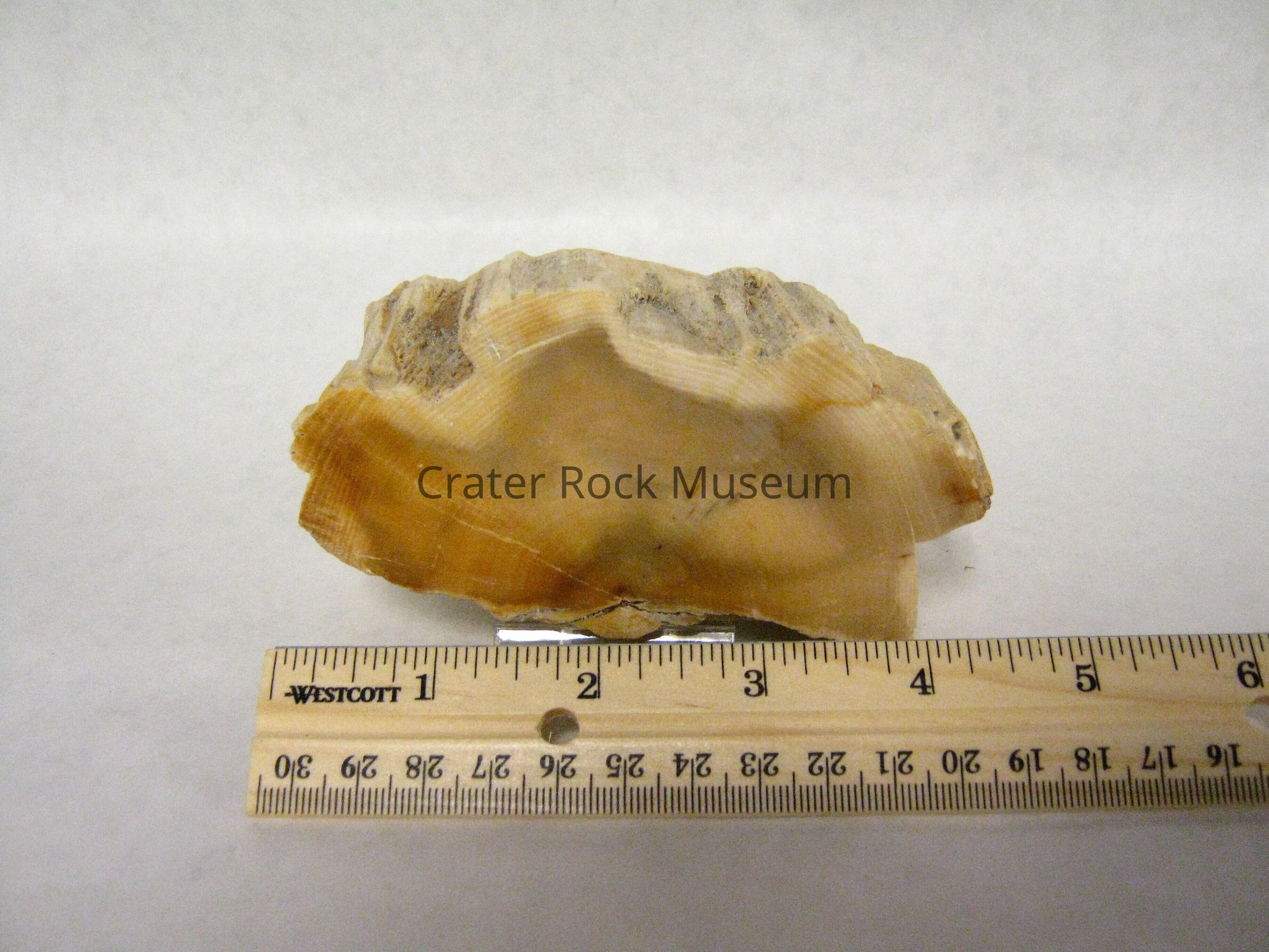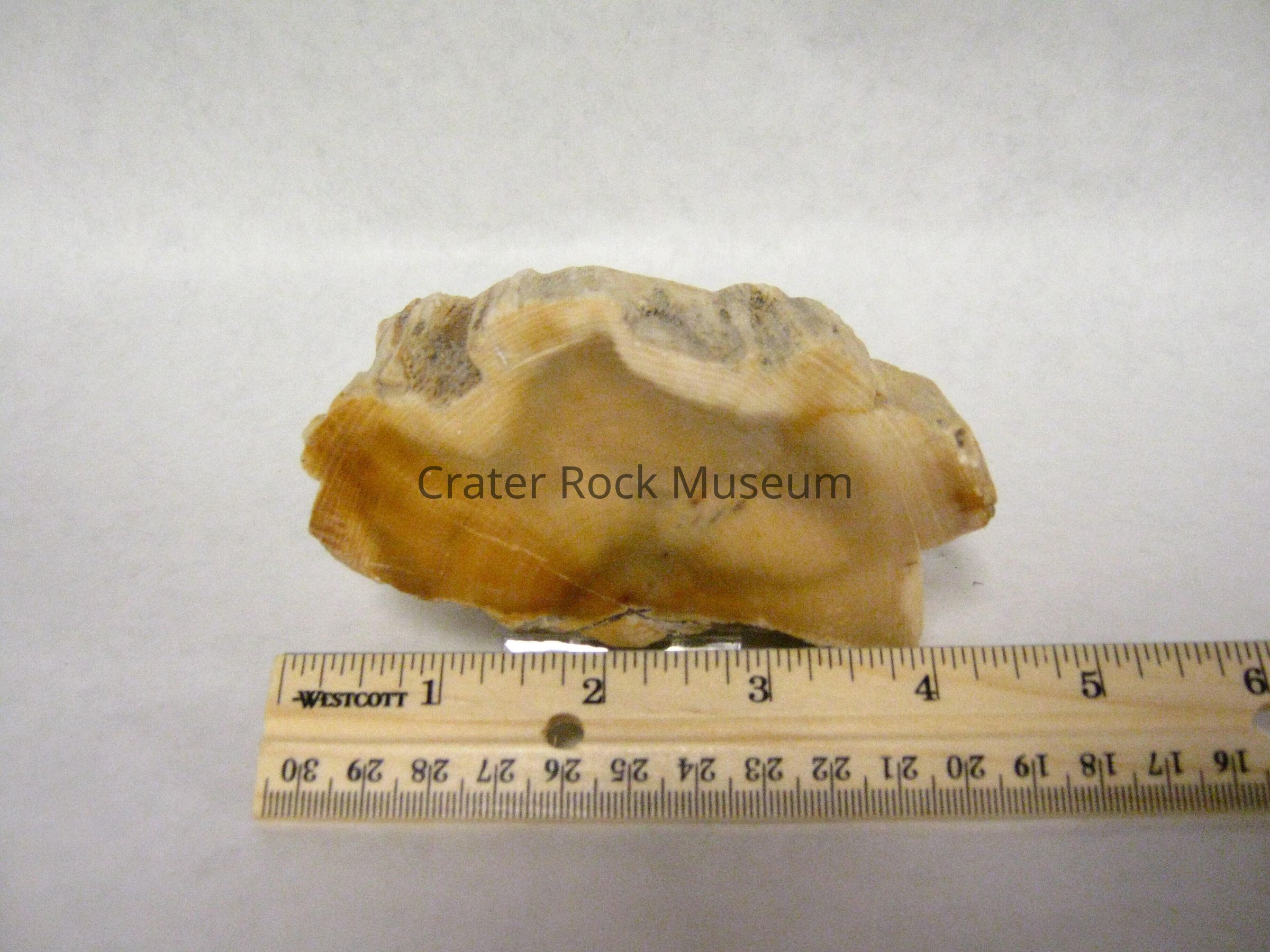 Description: Thick slab with polished face. Primarily white on the bark side with white, tan,orange, grey and reddish-brown. Growth rings are visible.Collection