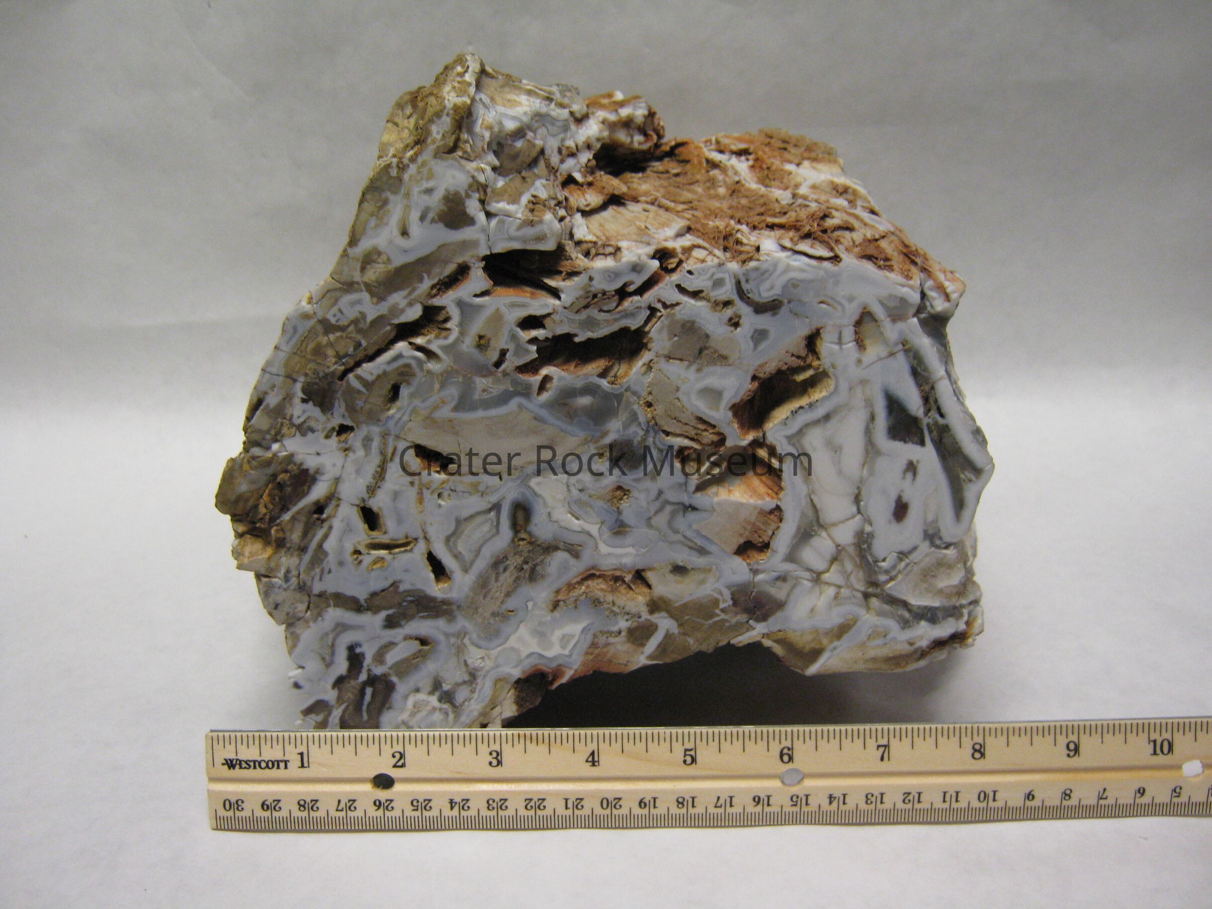 Description: Roxy Ann wood, multi-color white, tan & clear, several holes throughout this piece with crystalline on the outer surface and holes, outer tan & rust. Fluoresces orange under shortwave ultraviolet light