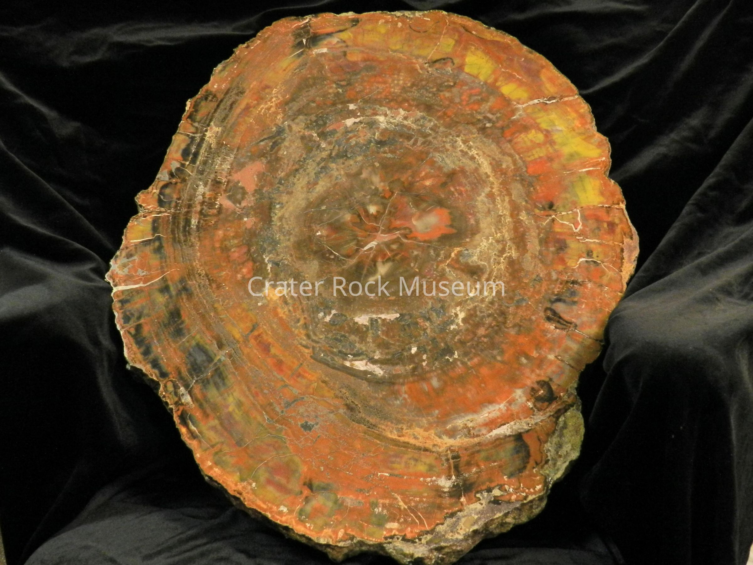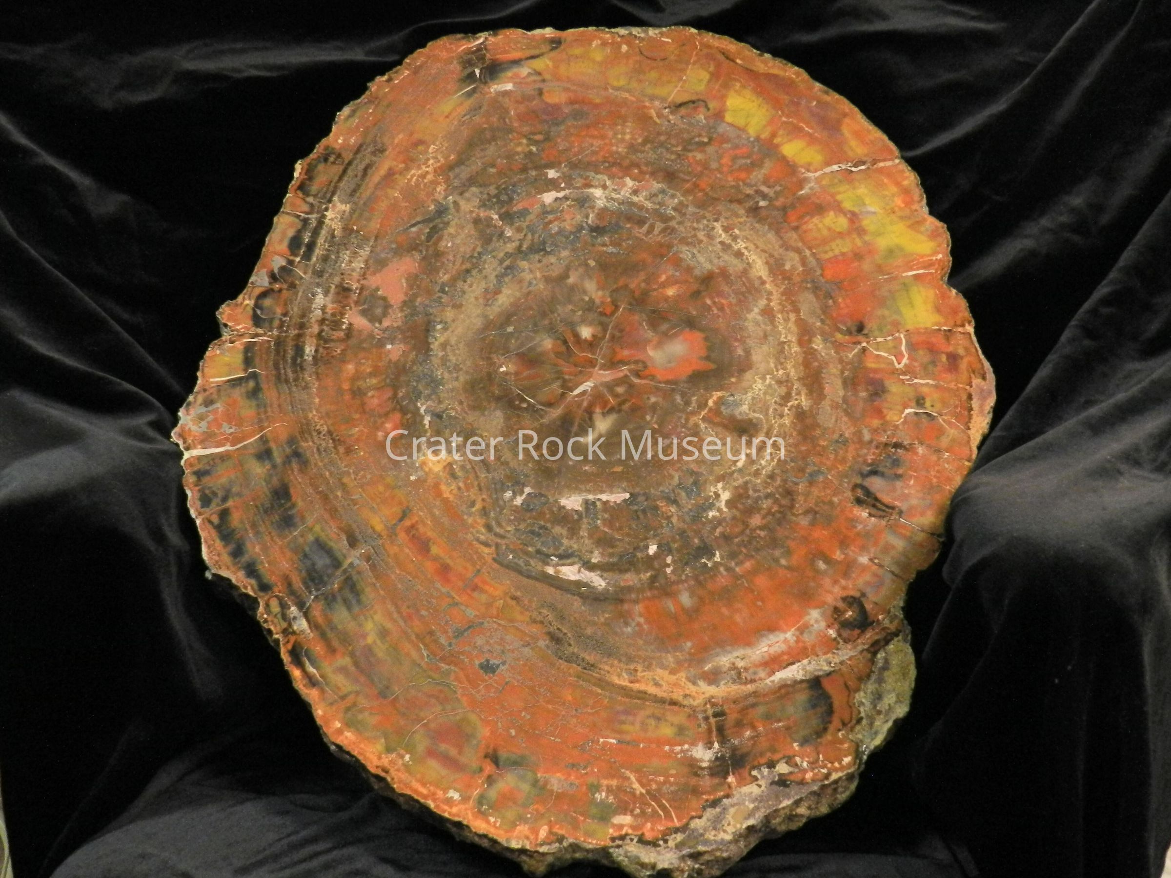 Description: Slab is a complete round with the polished face colored red, golden-yellow, brown, black, some white