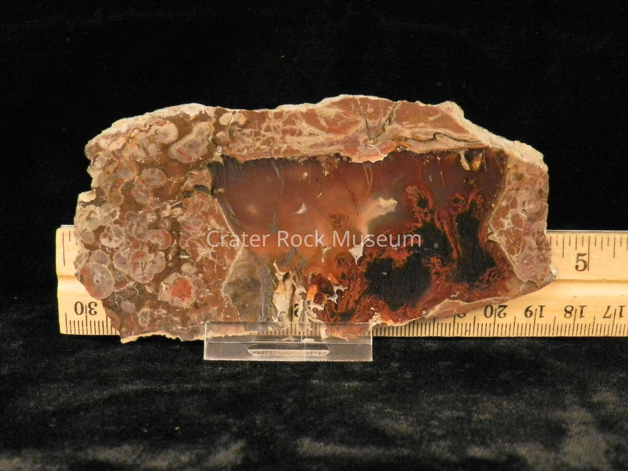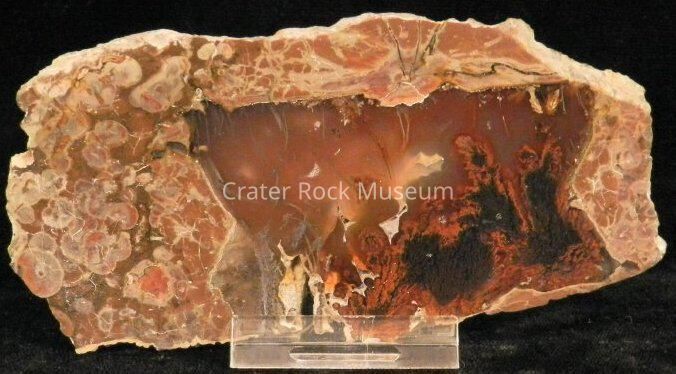 Description: Semi-rectangular thin slab (slightly beveled) with polished face. Outer regions are a conglomerate of reddish-brown, olive green and gray with a transparent orange and dark red center area with black and red plumes.