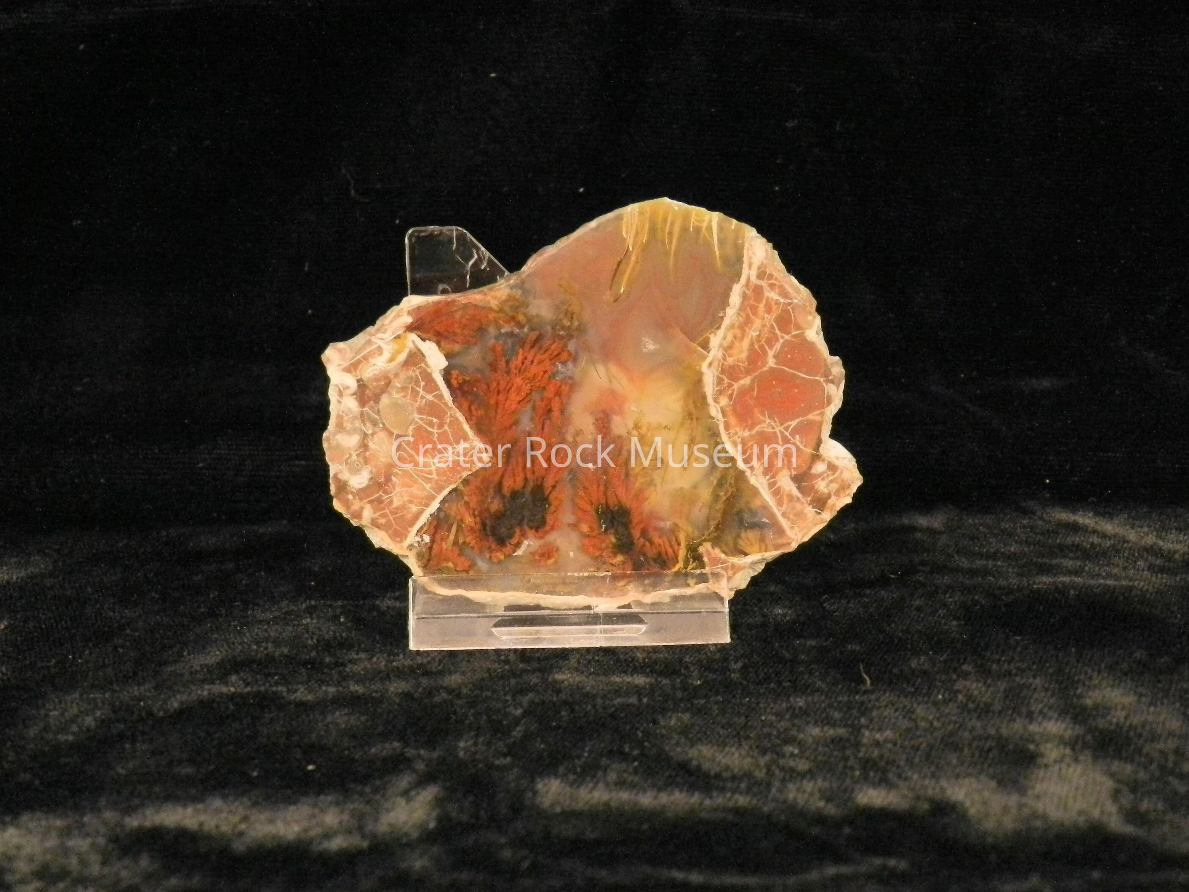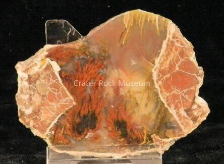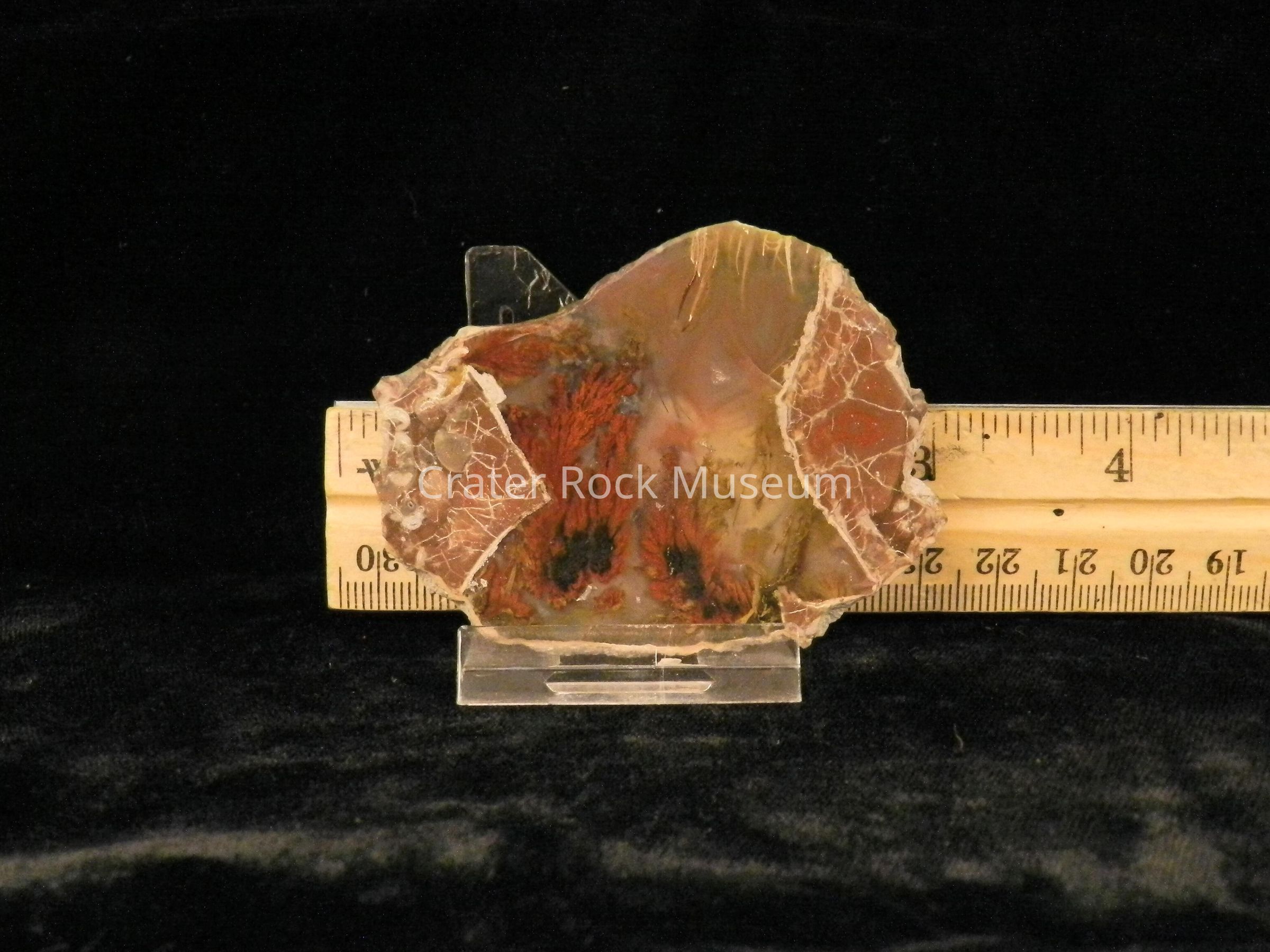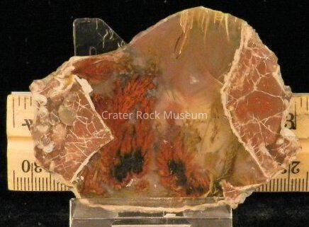 Description: Thin slice with polished face. Reddish-brown with white fracturing on (2) outer areas and transparent tan and brown with red and black fractures.
