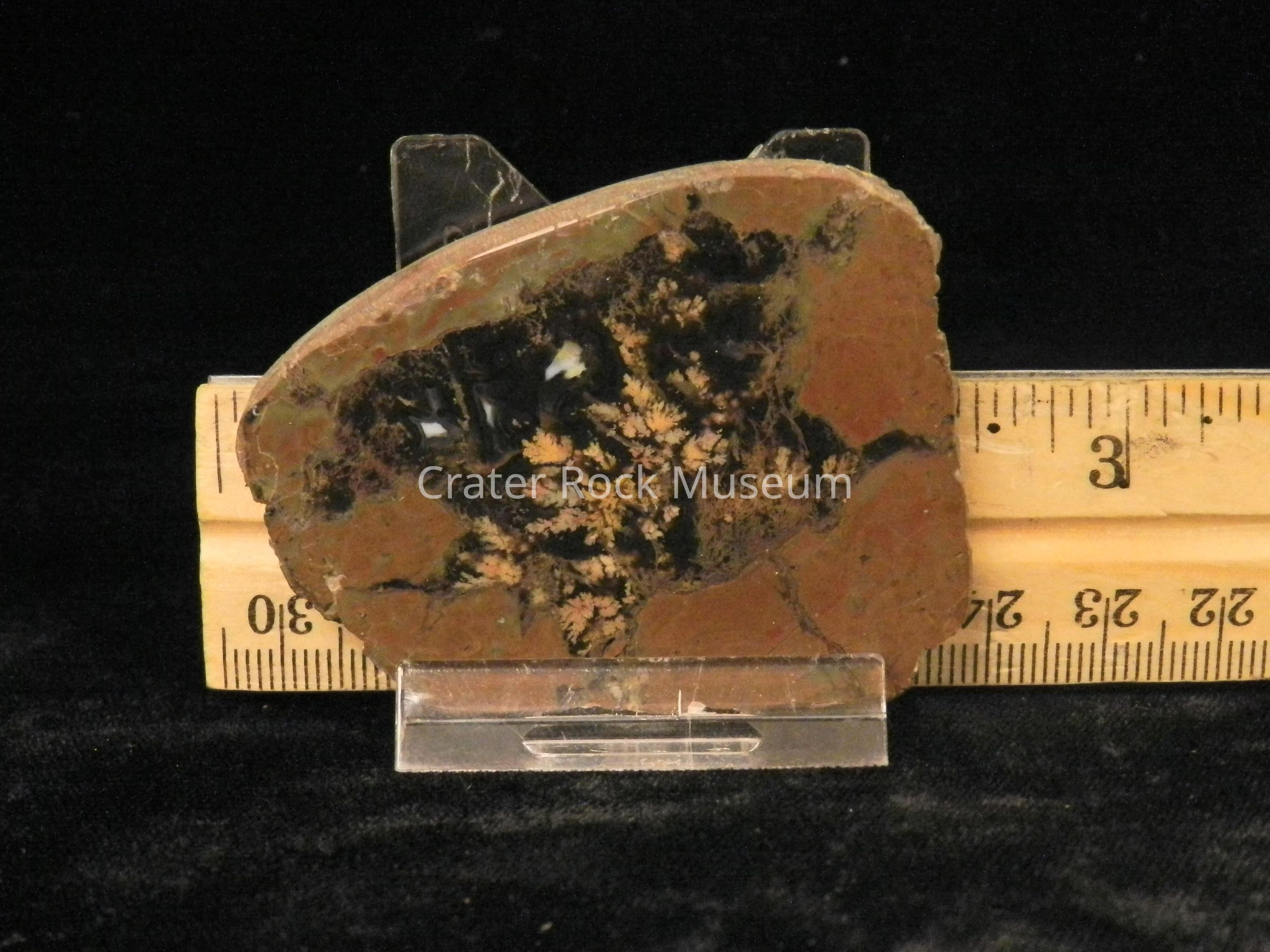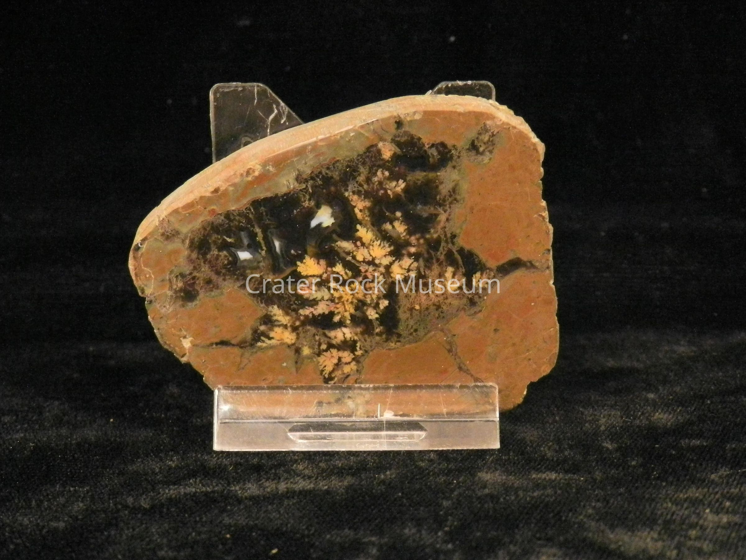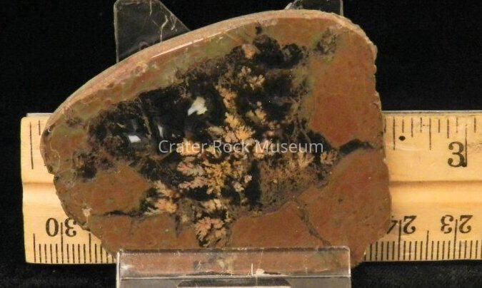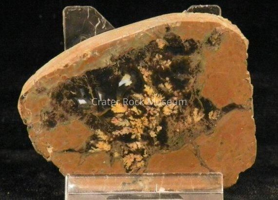 Description: Thin, wedge shape with polished face. Reddish-brown on outer areas with black inner area and dull yellow plumes.