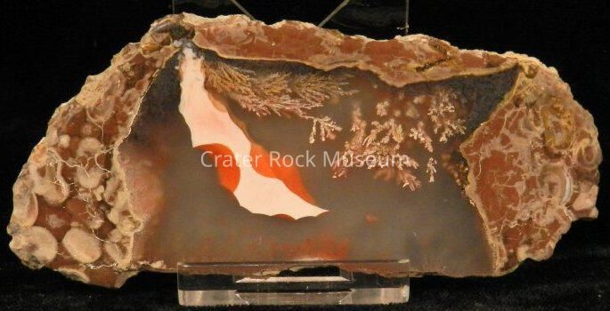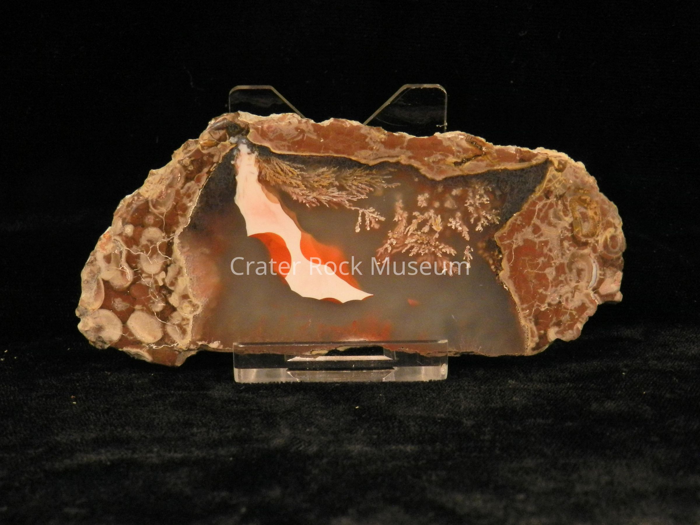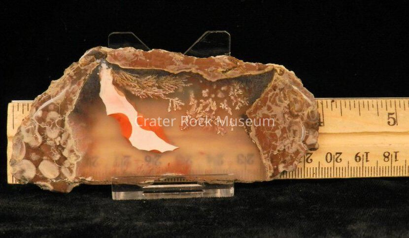 Description: Thin slice with polished face. Outer regions are reddish-brown and gray with some orbicular structures. The inner area is transparent smokey brown and white with a red and white elongated spot. The plumes are small.