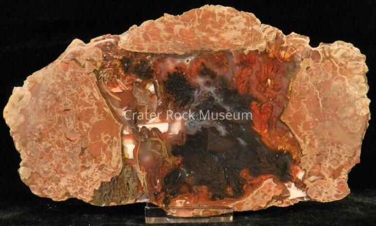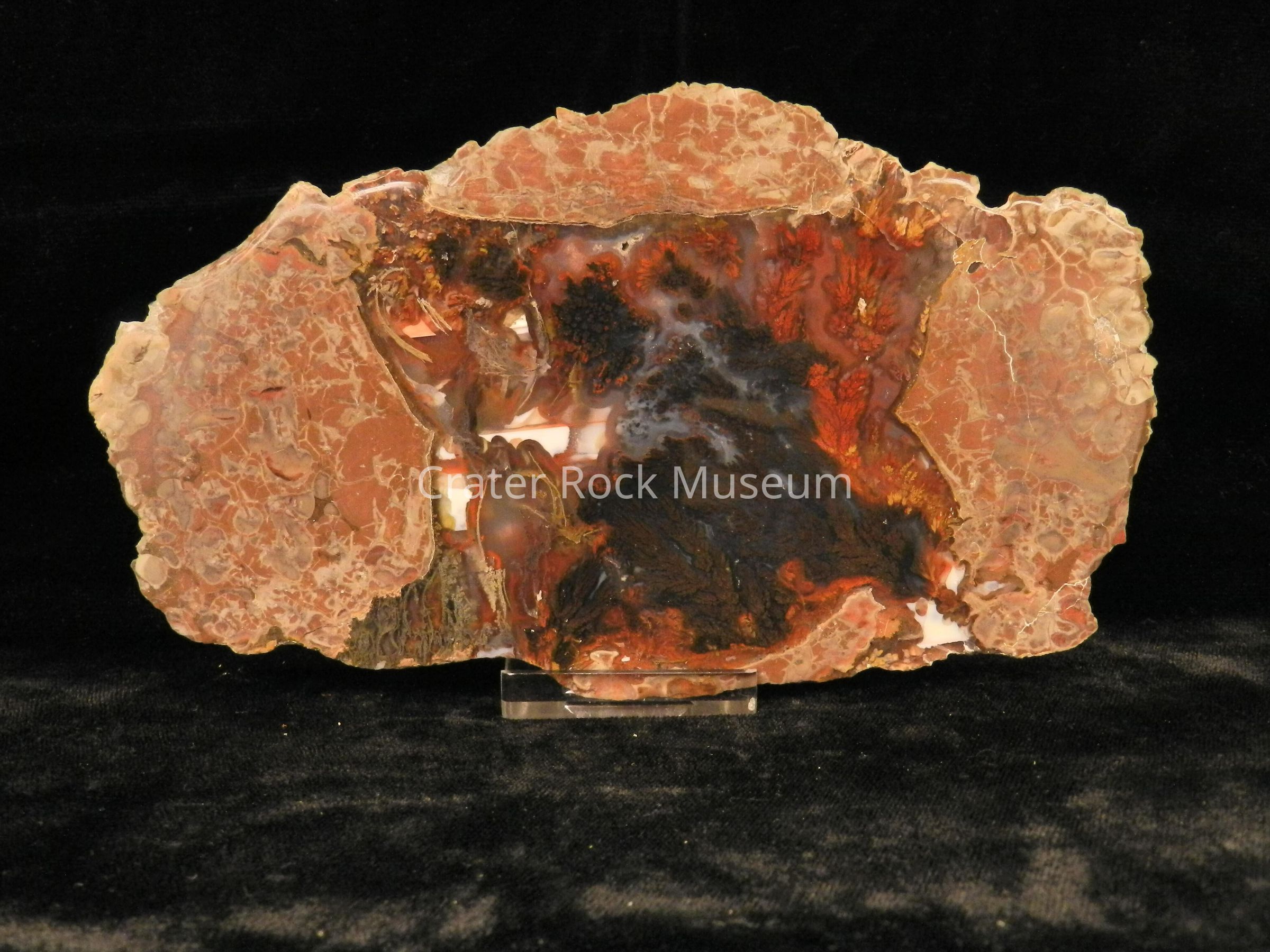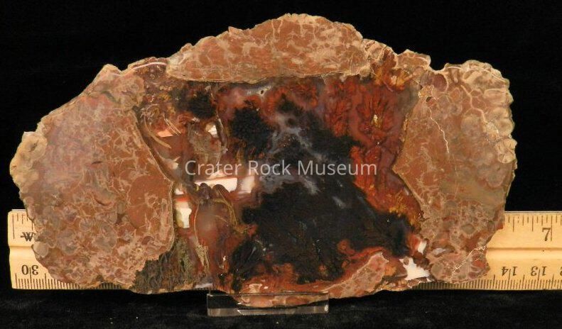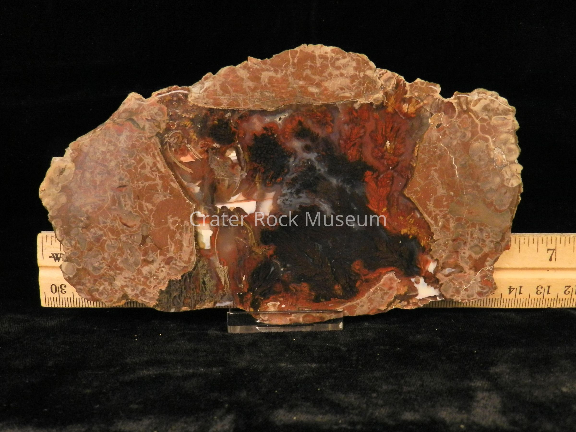 Description: Thin slice with polished face. Outer areas are reddish-brown and gray while the inner area is translucent red, black and some blue-gray with some white spots. Plumes are red and black.