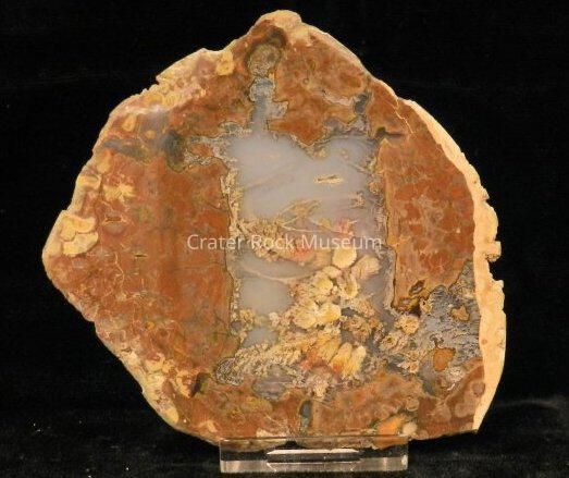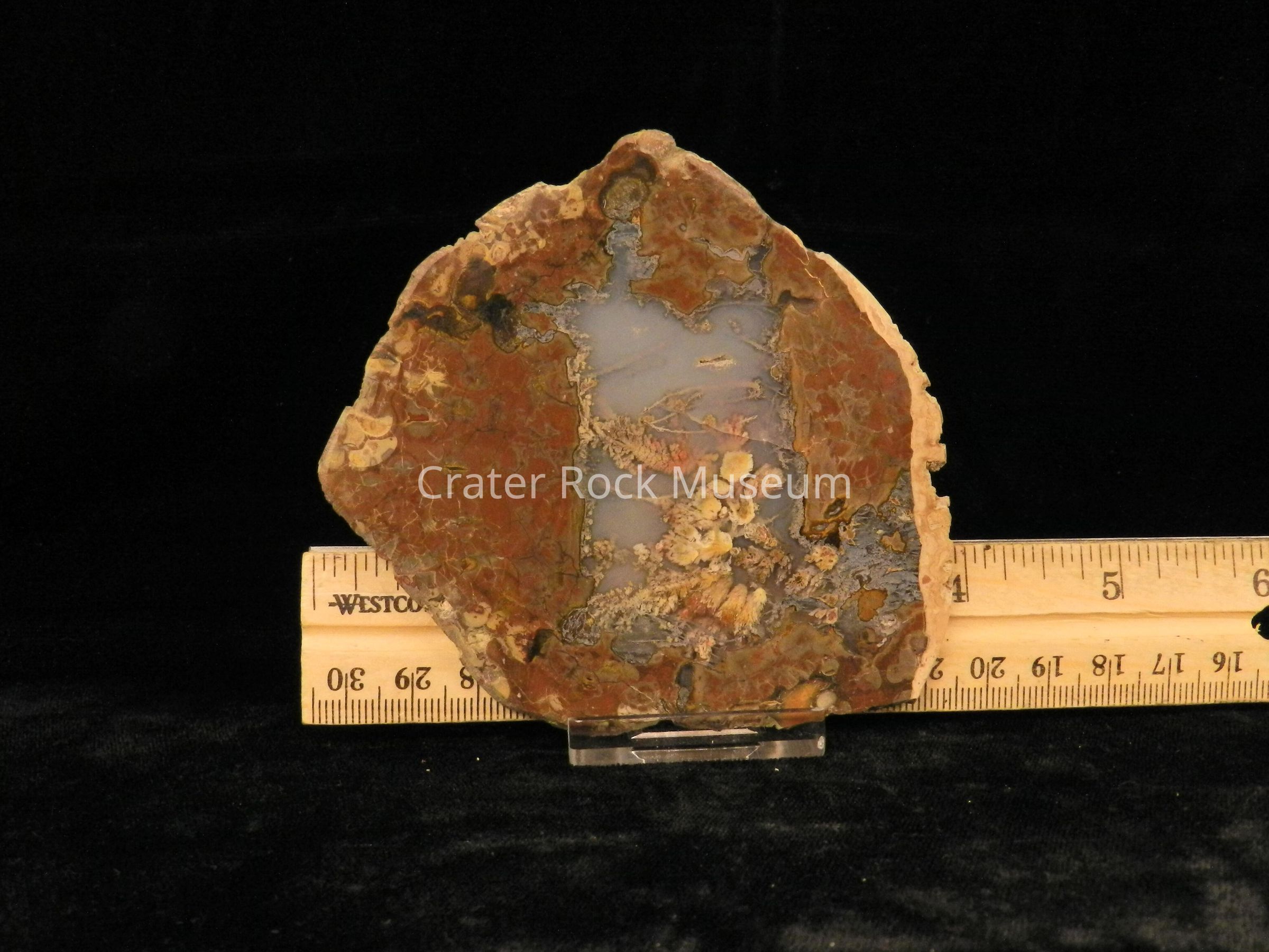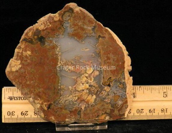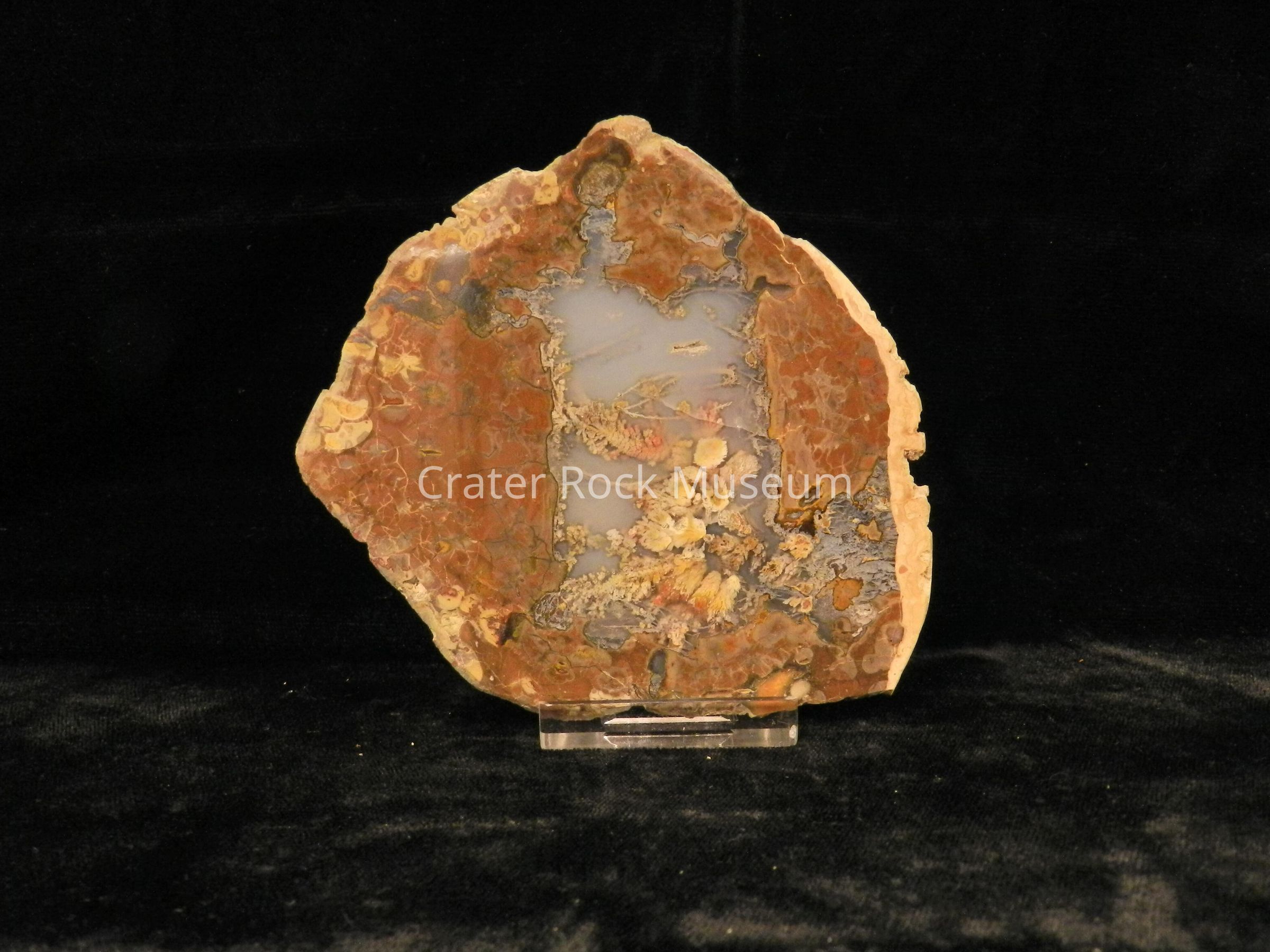 Description: Thin slice with polished face. Outer areas are reddish-brown and dark beige and some blue-gray. The center is transparent smokey gray. The plumes are yellow and dull green.
