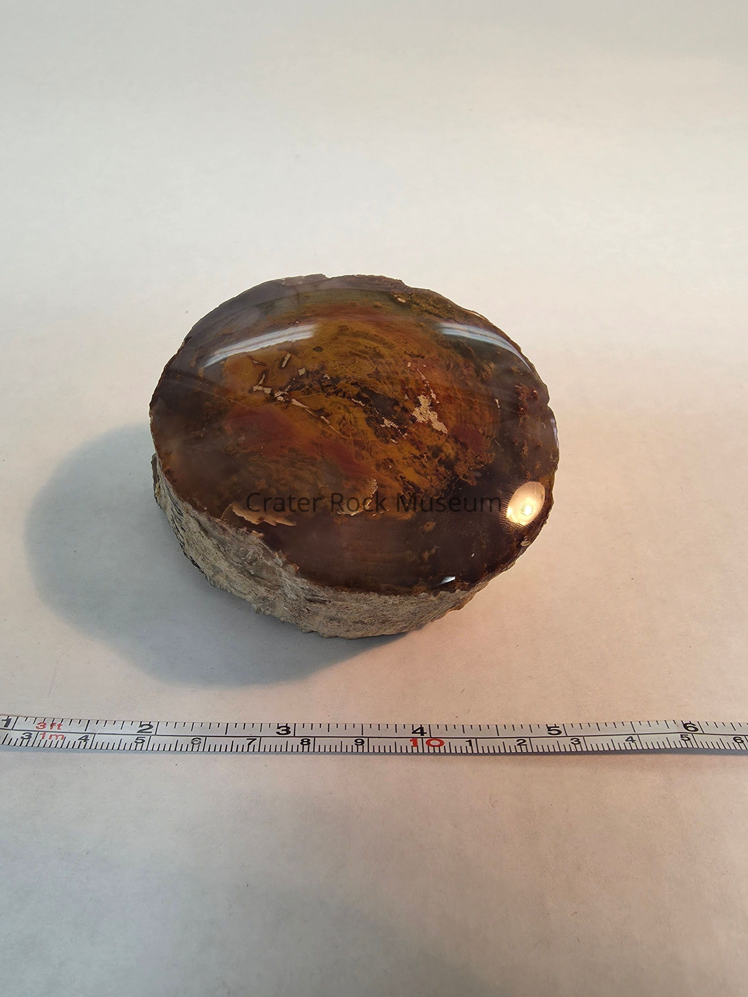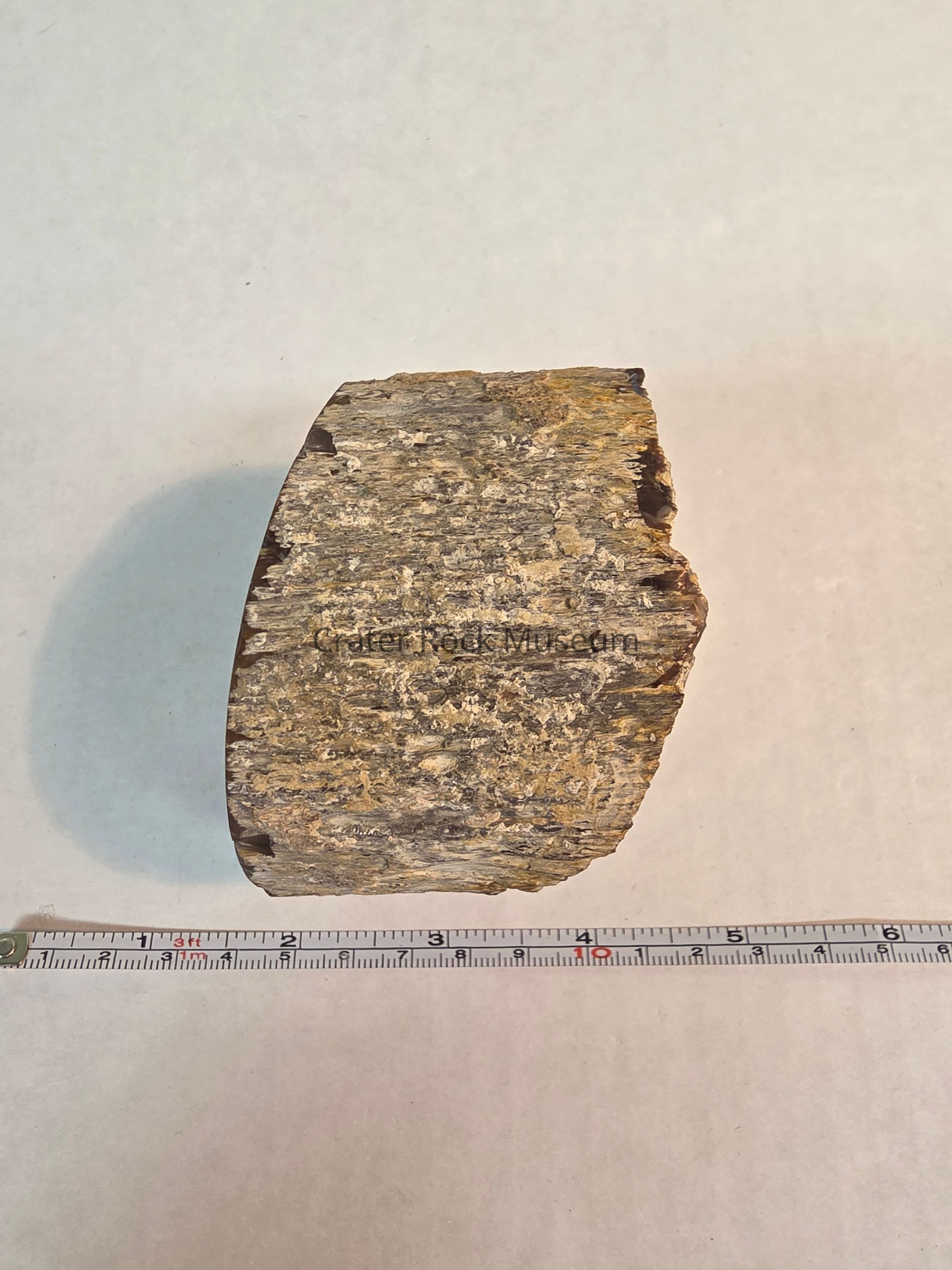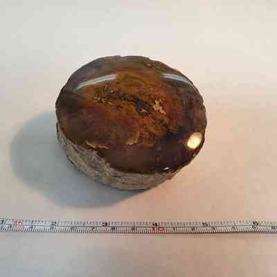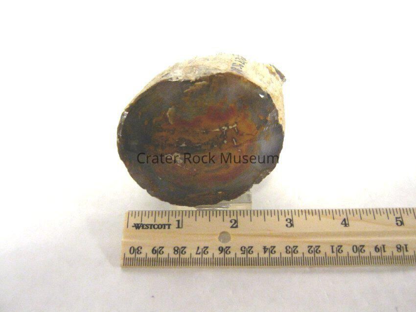 Description: Polished end shows wood in golden brown, yellow, grey and red, some black. Growth rings are visible.