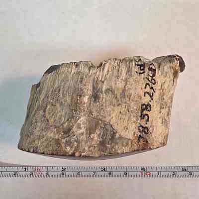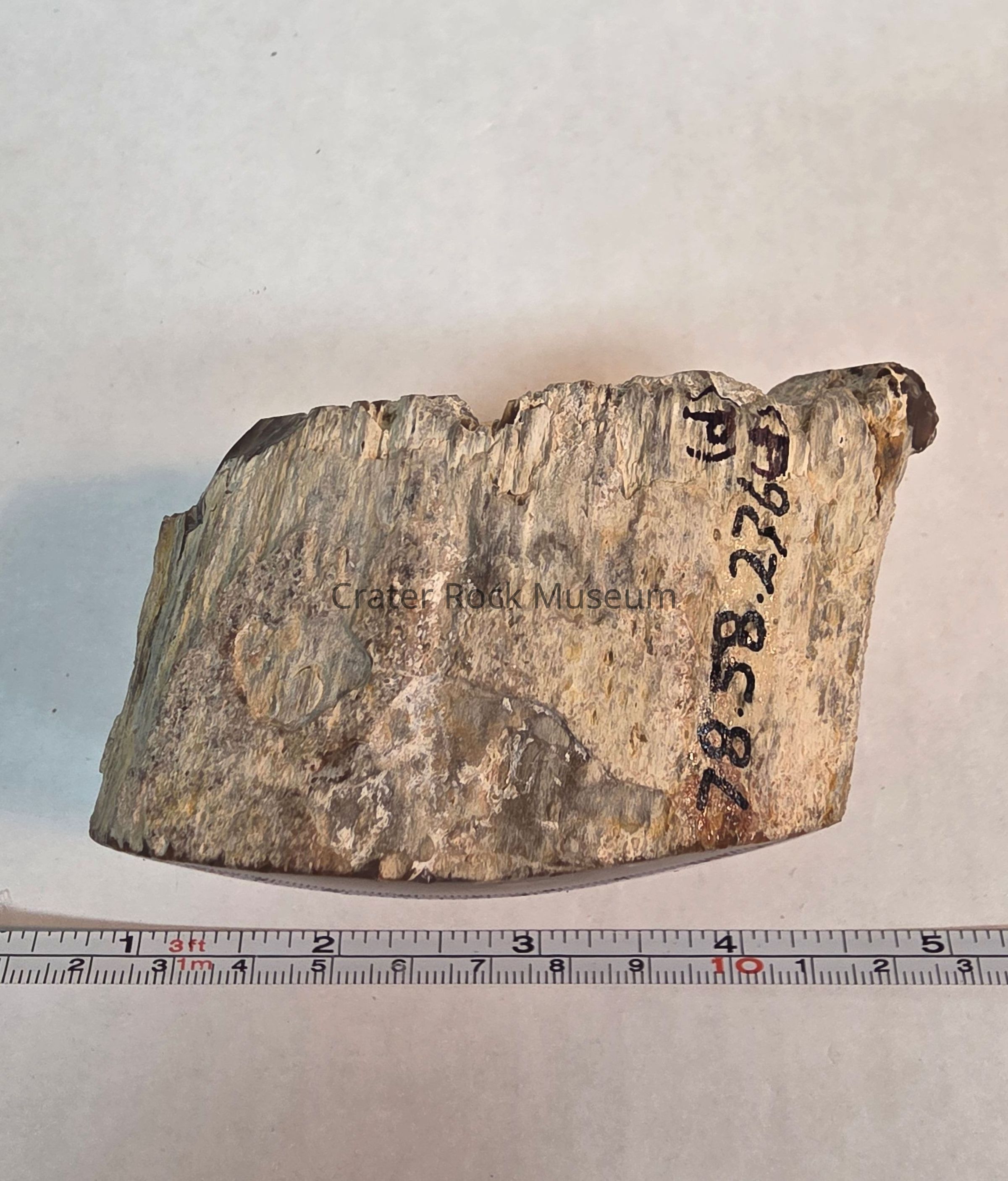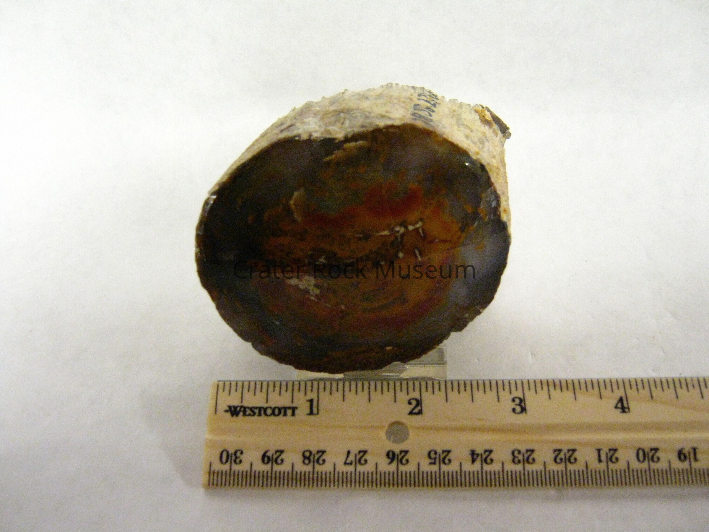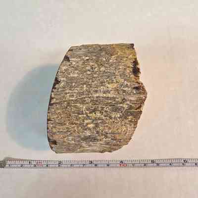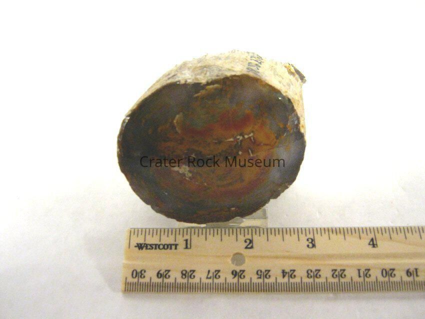 Description: Polished end shows wood in golden brown, yellow, grey and red, some black. Growth rings are visible.