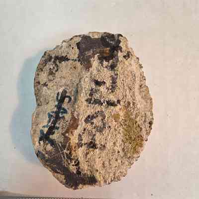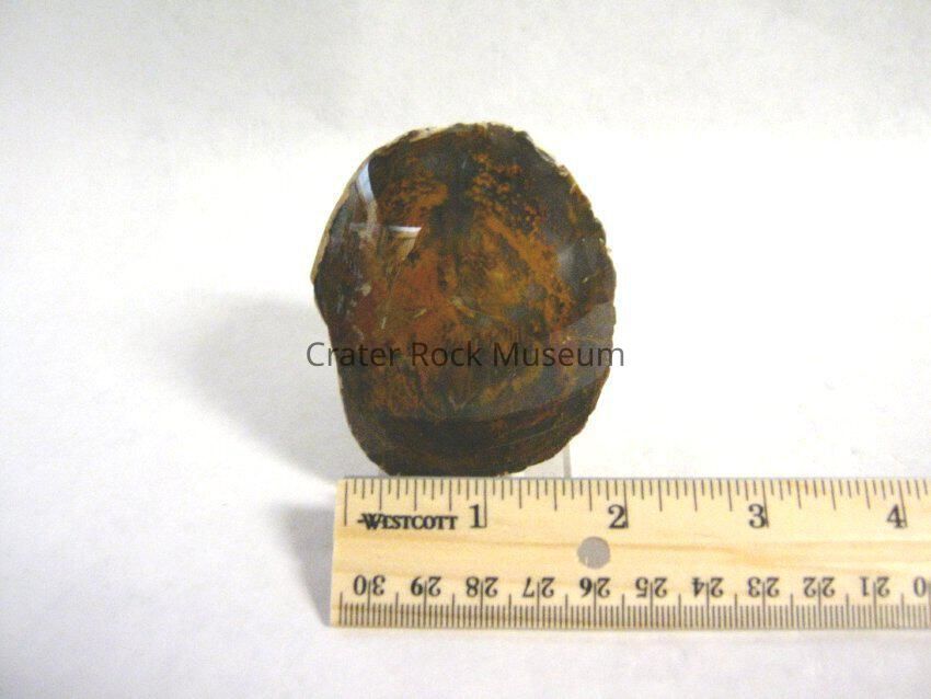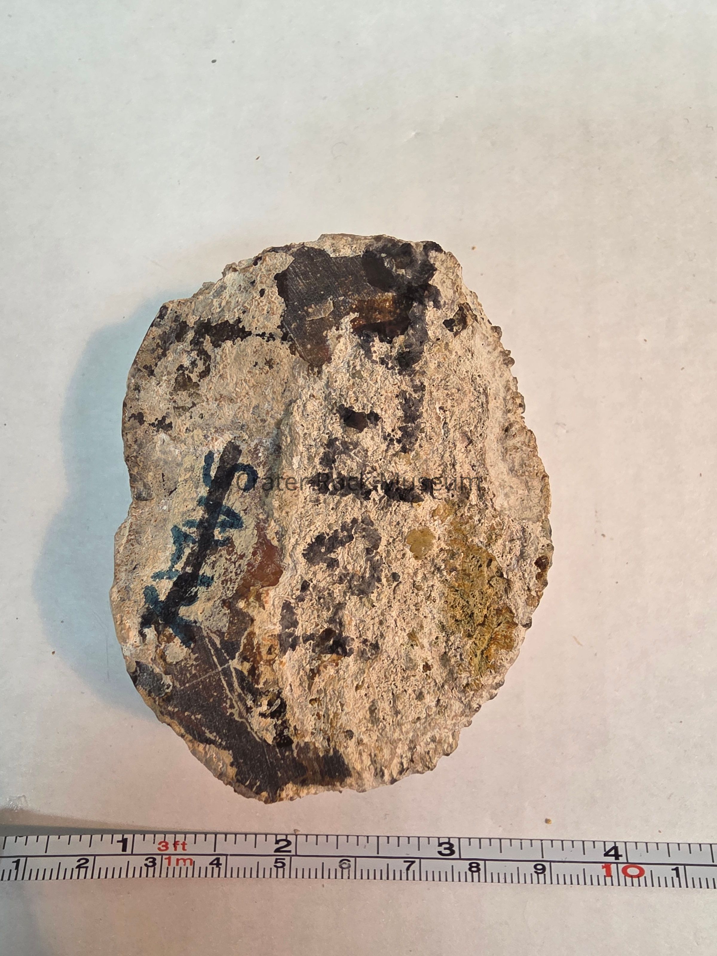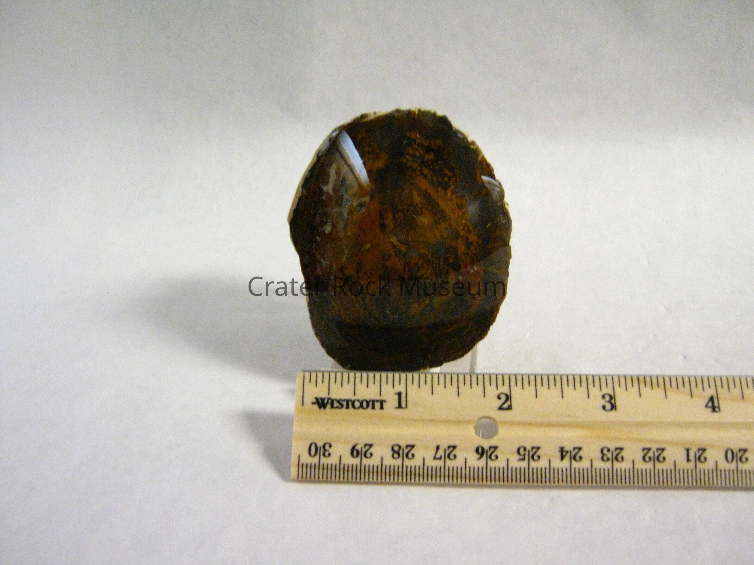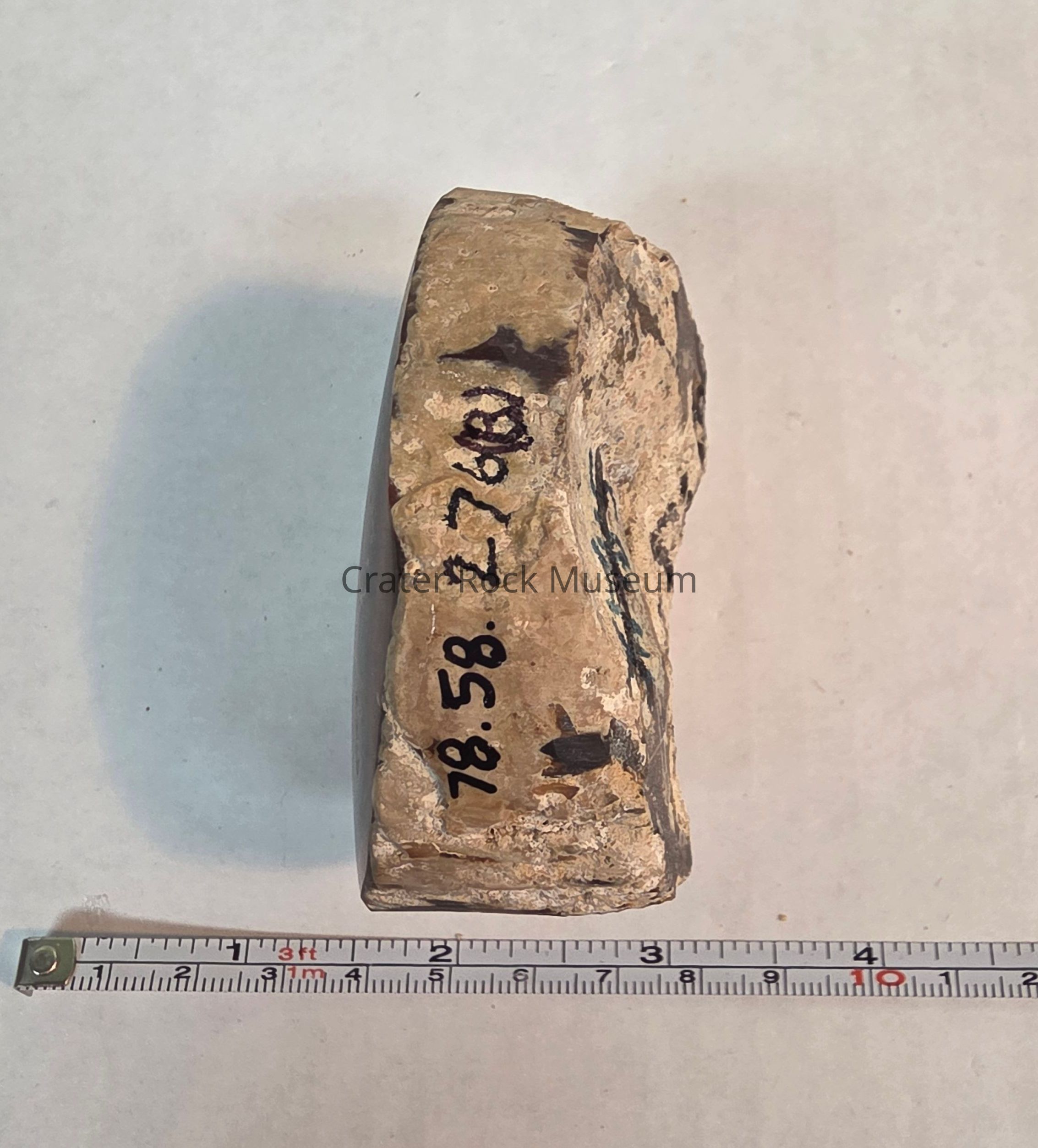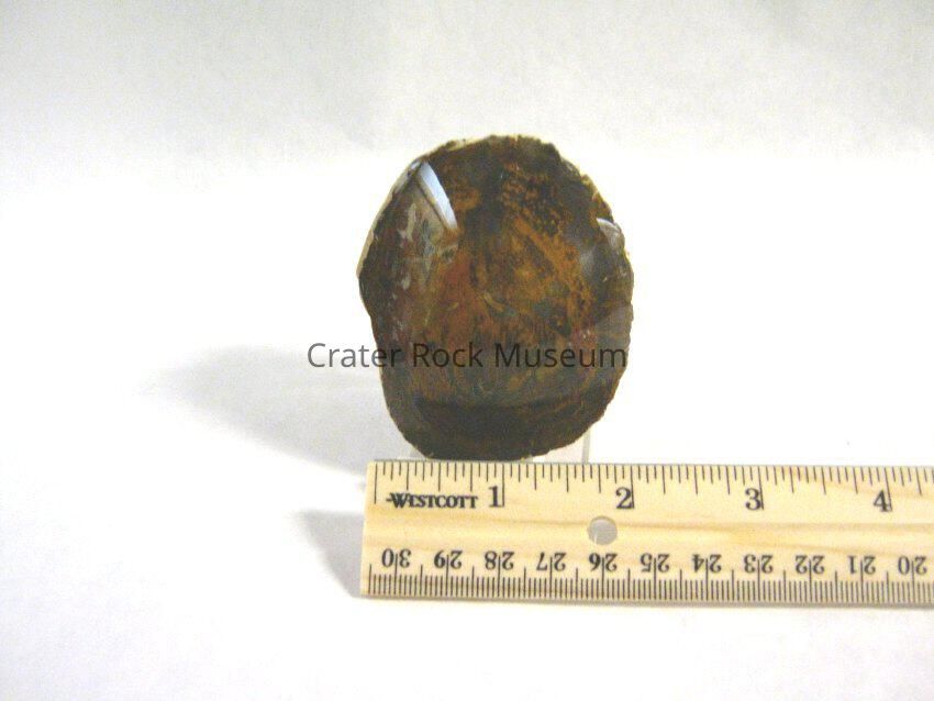 Description: Polished end shows wood in golden brown, yellow, grey and red, some black. Growth rings are visible.