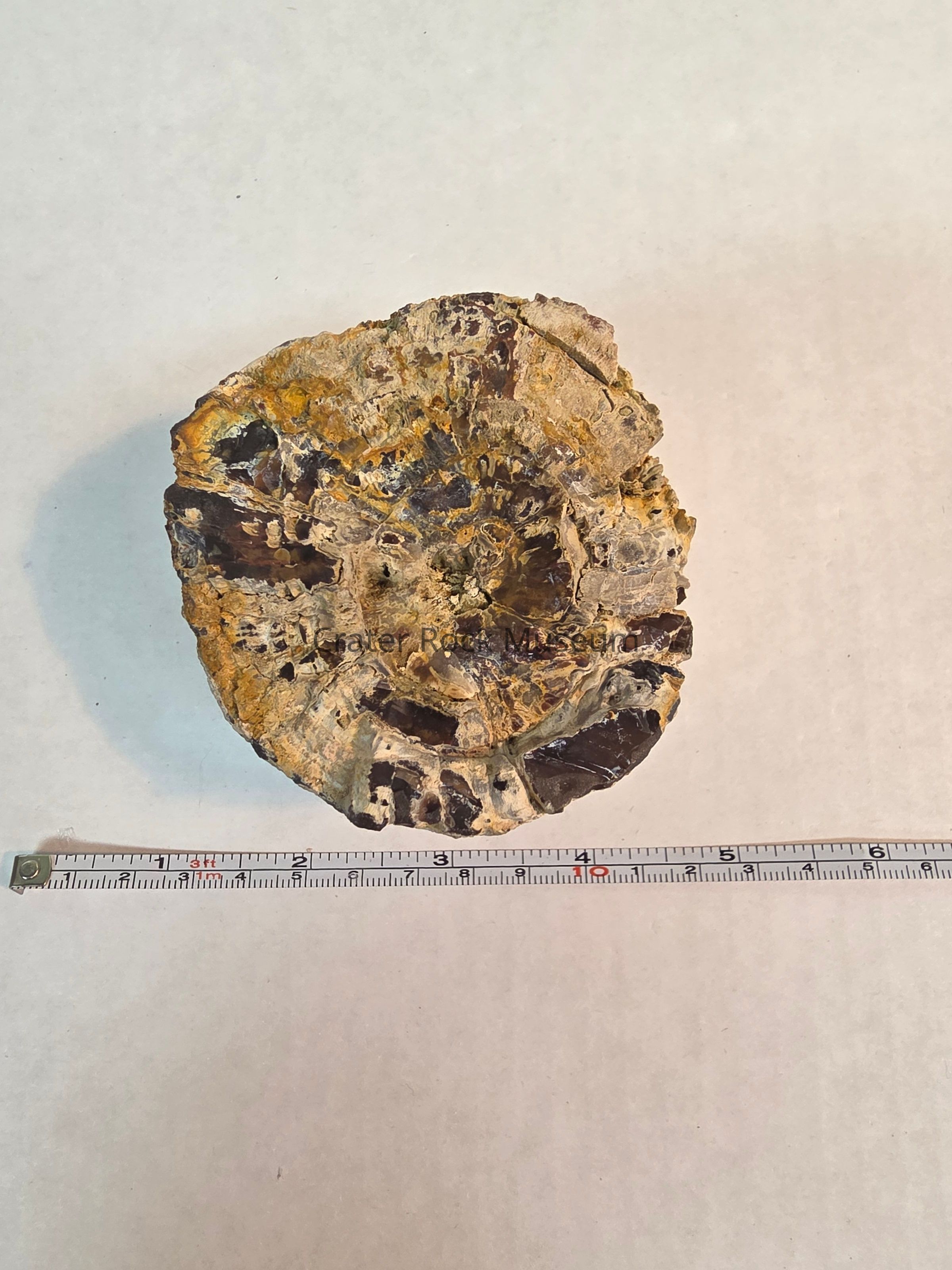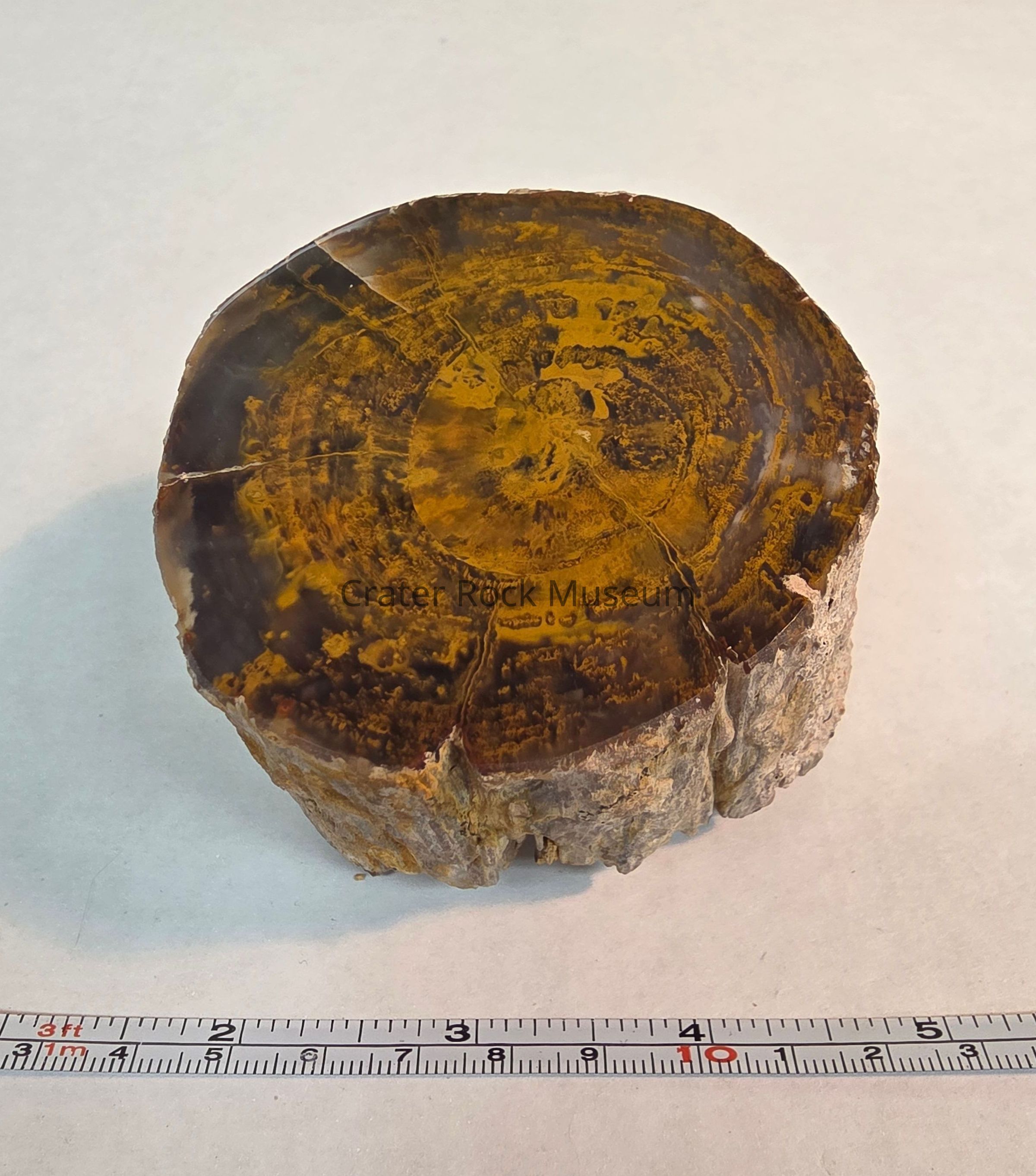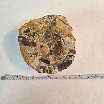 Description: Polished end shows wood in golden brown, yellow, grey and red, some black. Growth rings are visible.