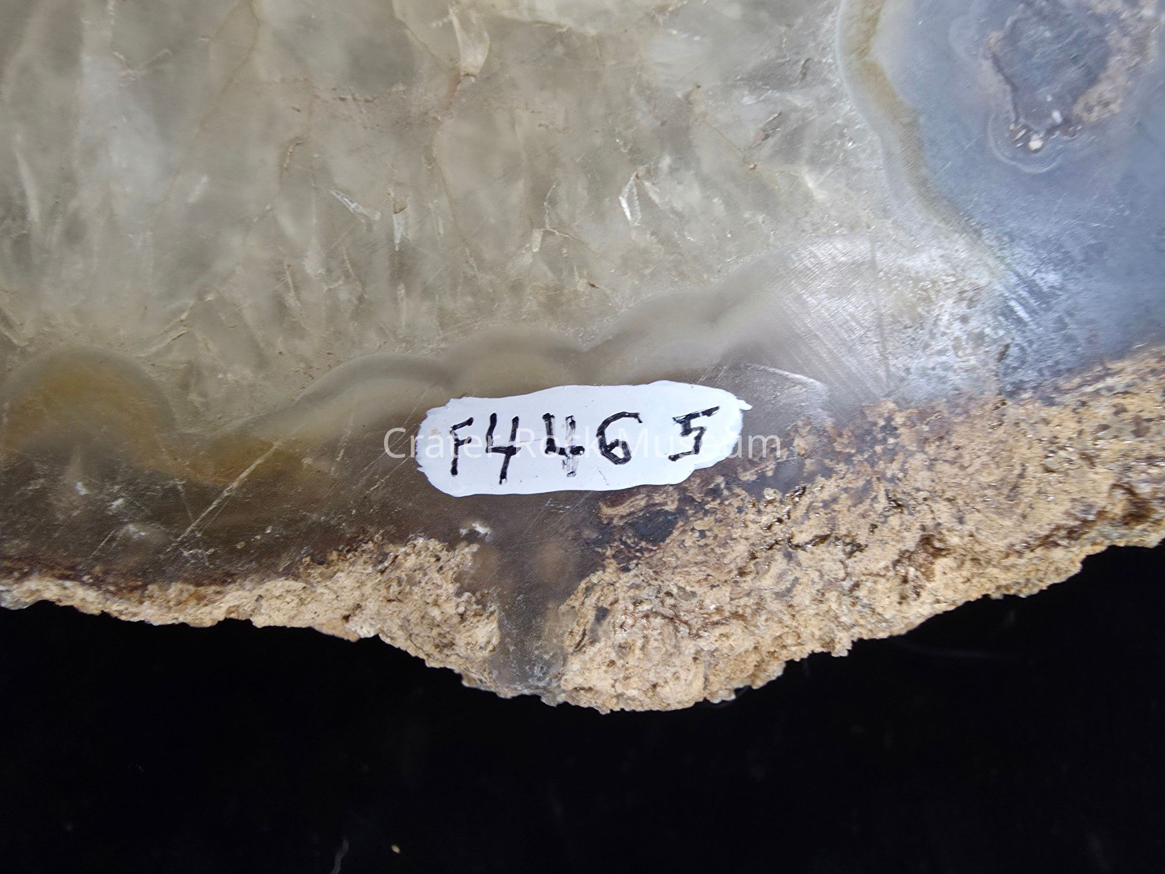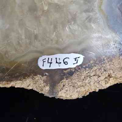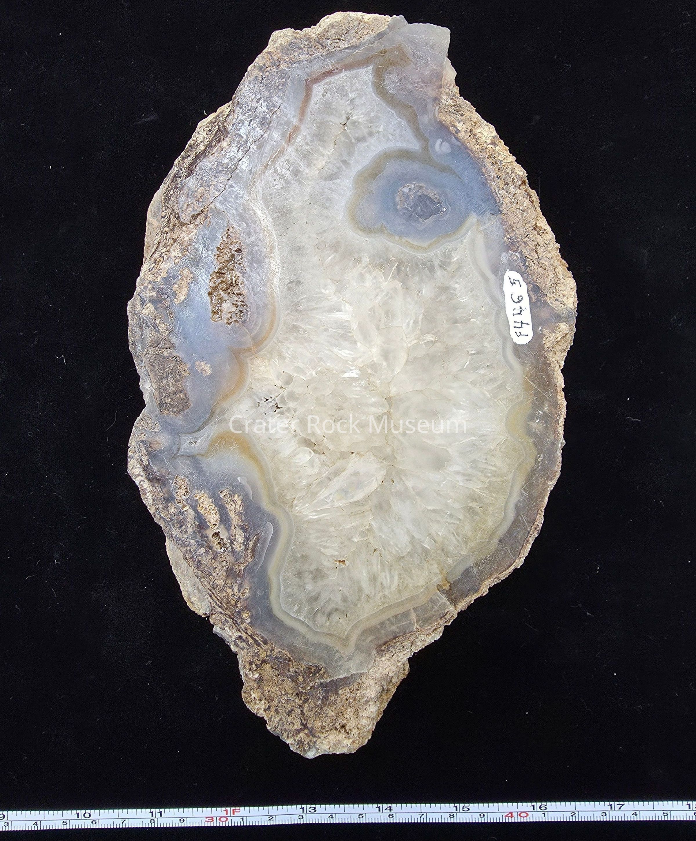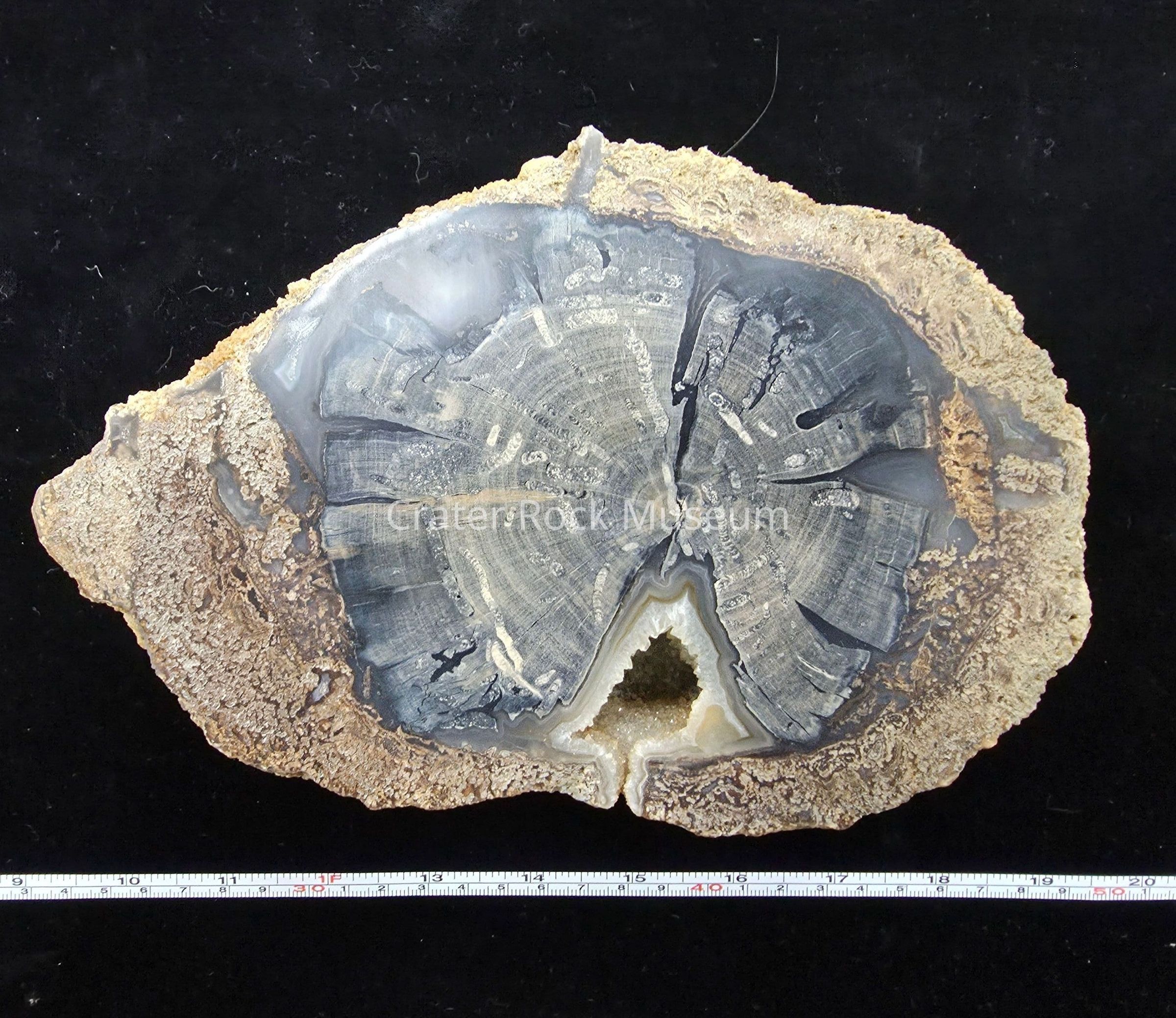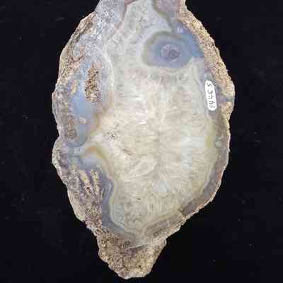 A somewhat compressed round with petrified algae on the exterior, blue grey center with many beetle larvae tunnels filled with petrified frass. One large triangular druzy pocket on the polished face while reverse side is predominantly quartz replacement.Collection