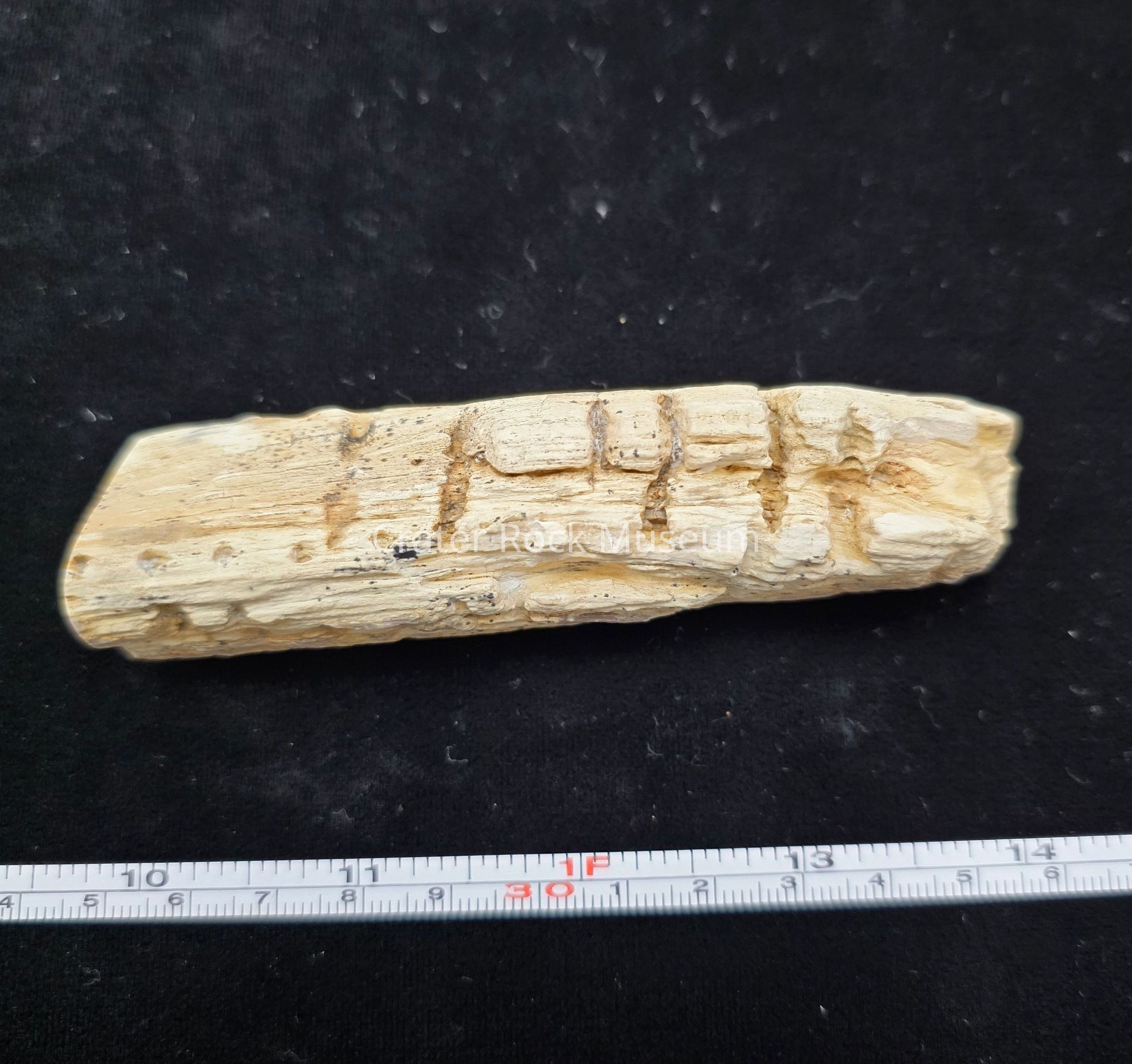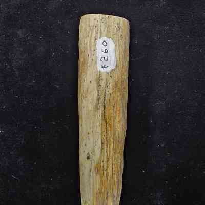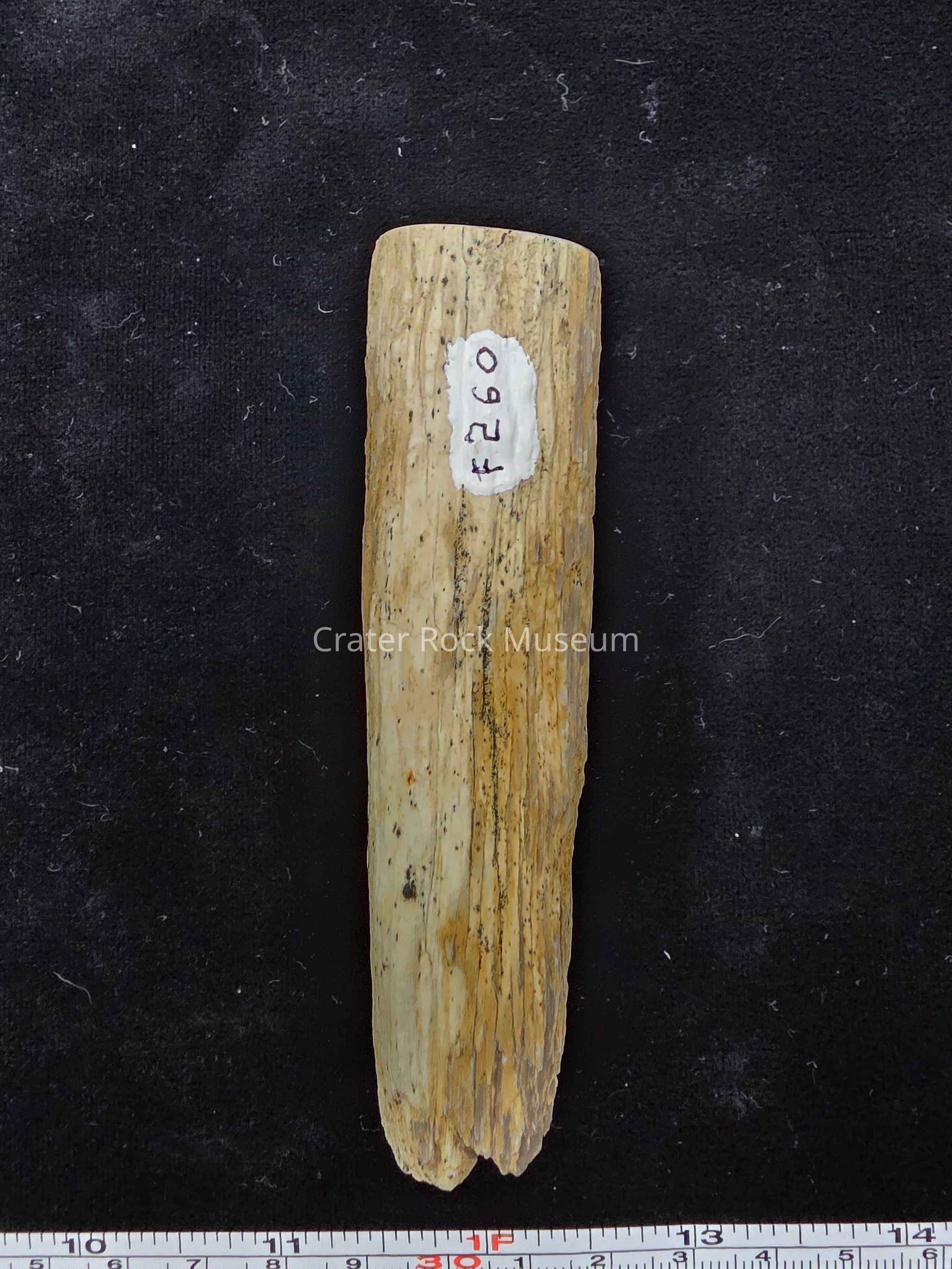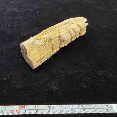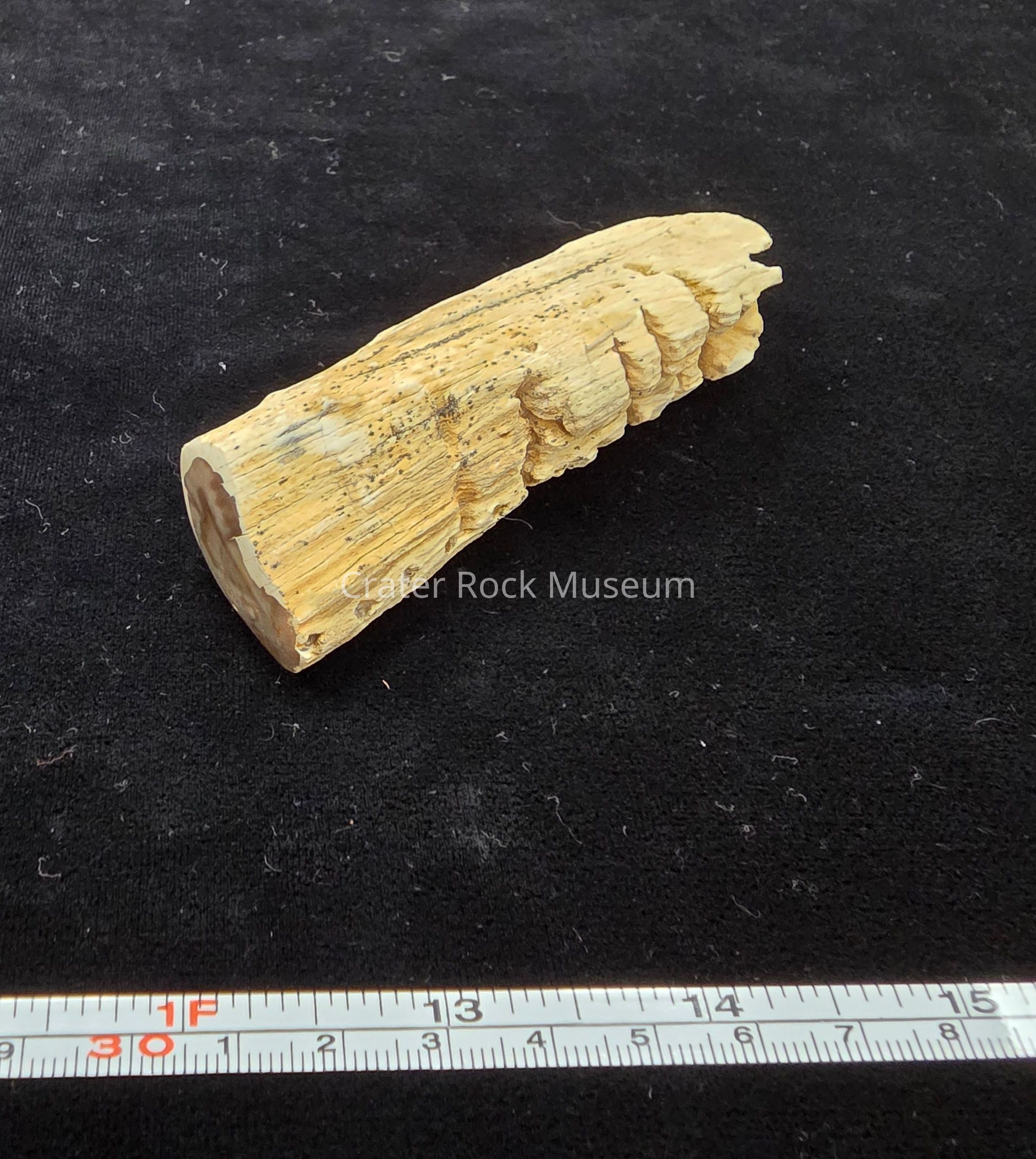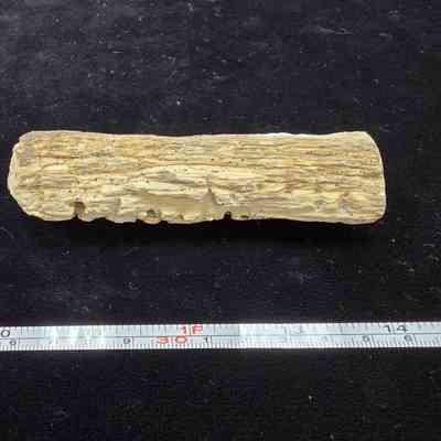 A partial round with four parallel groves and evenly spaced channels caused by woodpeckers or saps suckers. Polished end is tan with red-brown streaks.