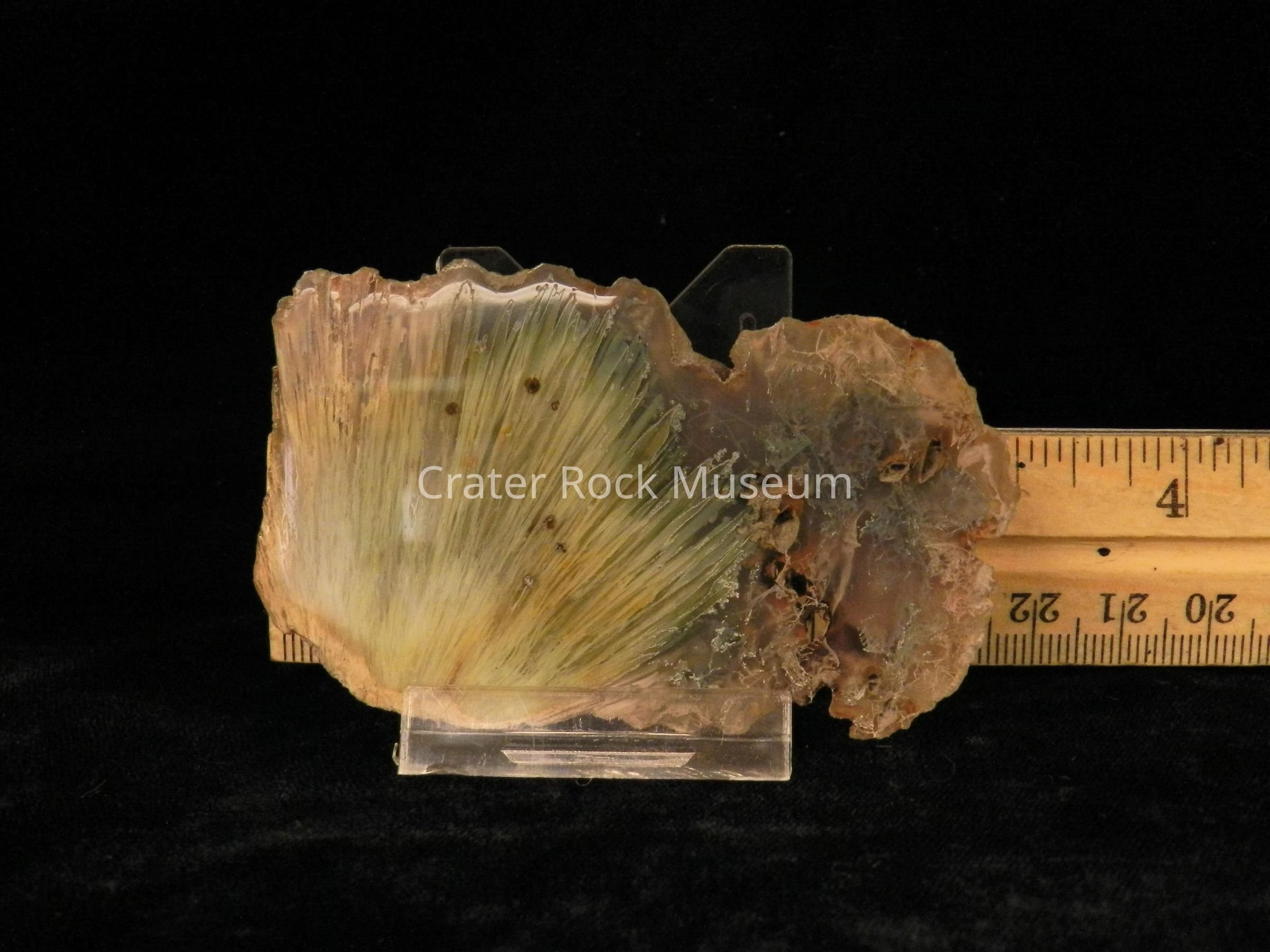 Description: Rough, rounded back with polished face. Translucent tan and beige with one large light and dark lime-green splay covering most of specimen.Collection