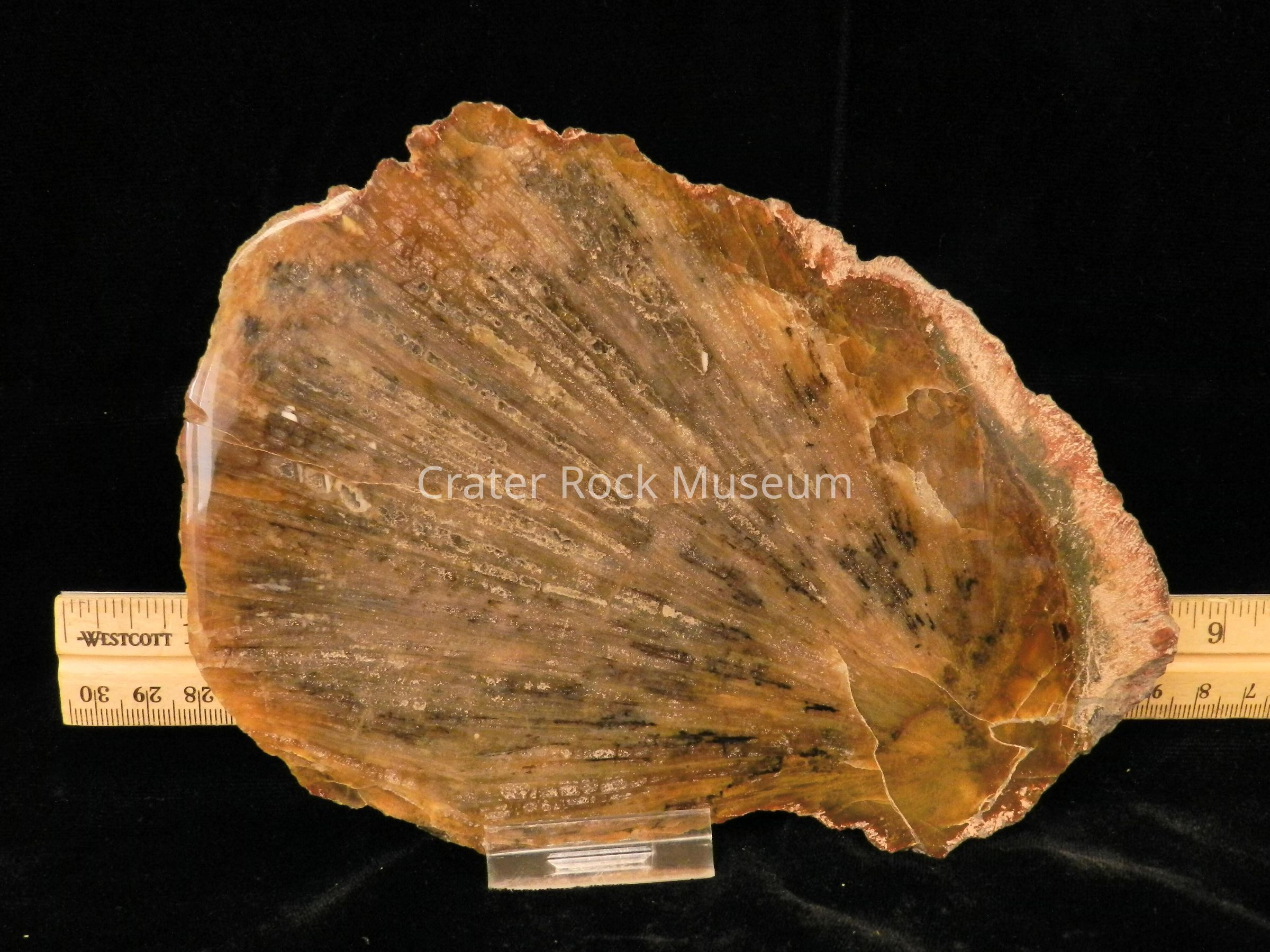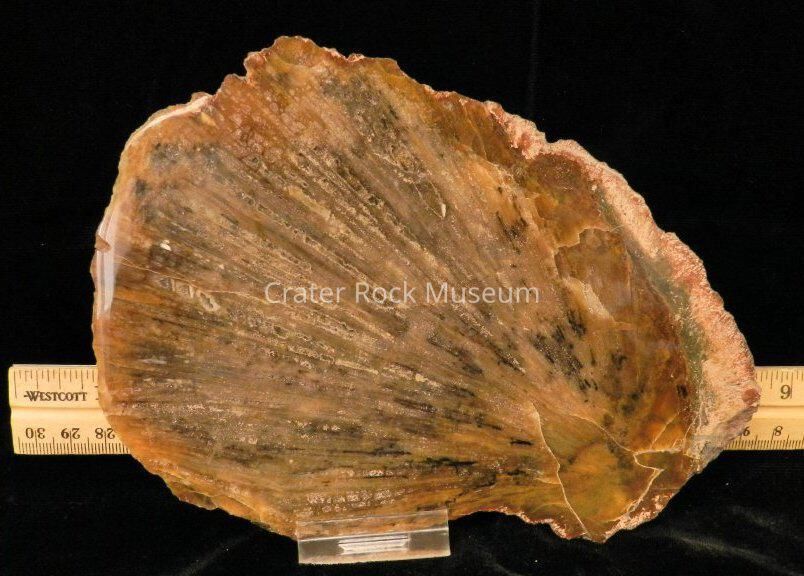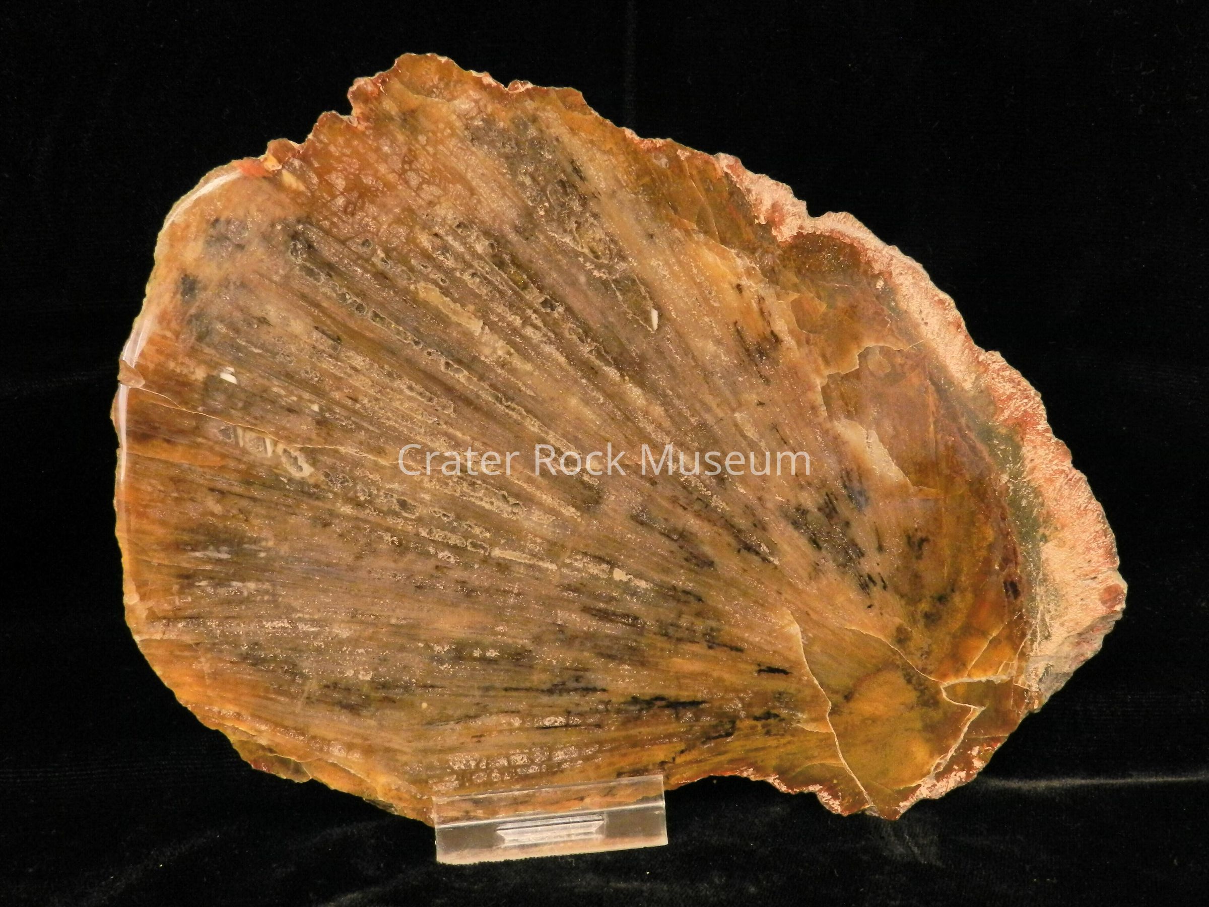 Description: Rounded back with polished face. Scalloped shape and look with translucent browns and tans with some black splaying.Collection