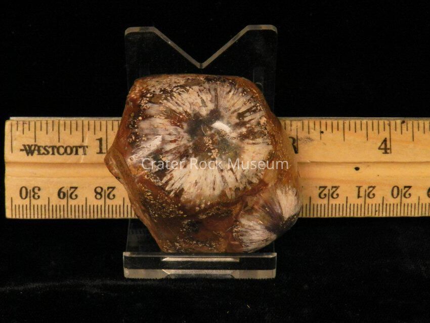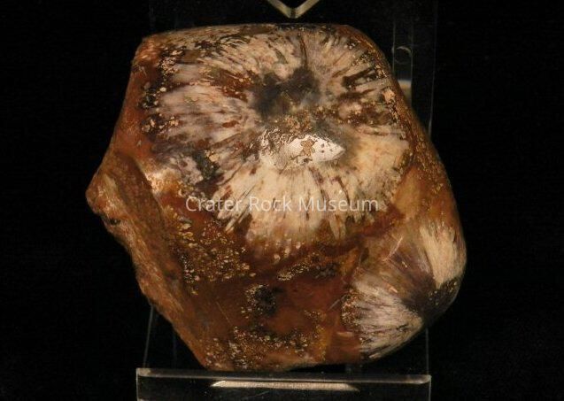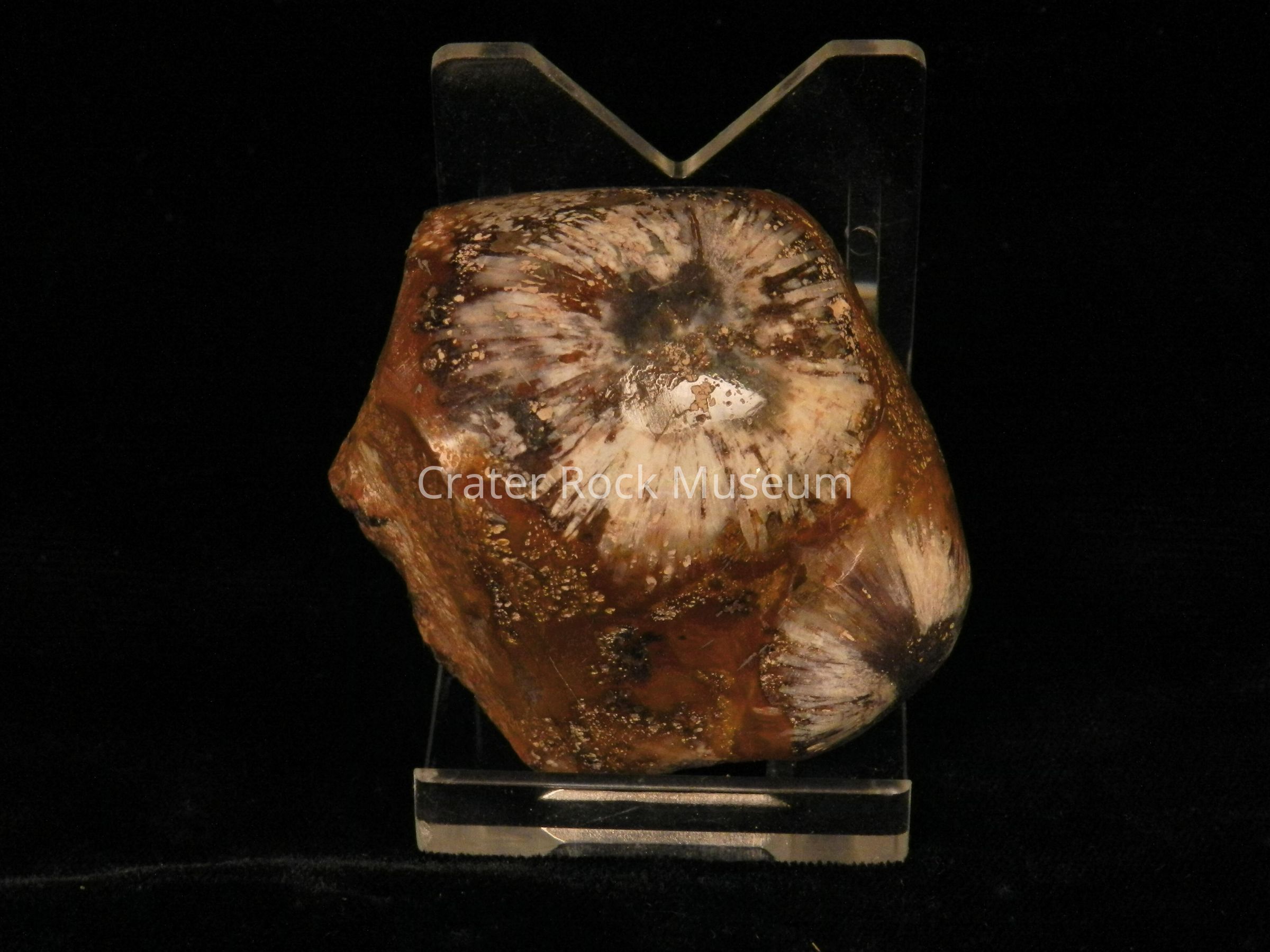 Description: Rough, semi-flat back with rounded convex face. Dark tans and light browns with two round , white and gray splayed spots.Collection