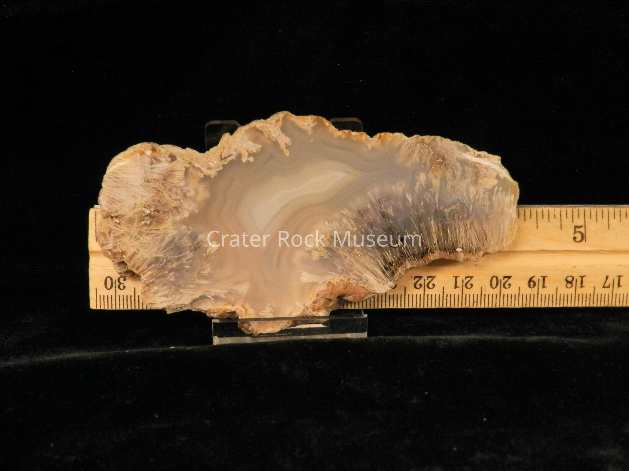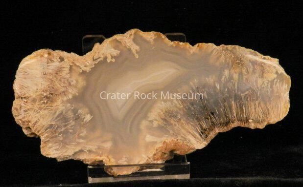 Description: Thin, beveled slice with flat back and polished face. Translucent, slightly banded creamy tan in center with beige and black splaying on outer regions.Collection