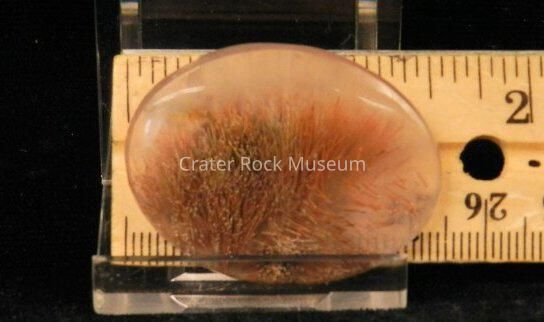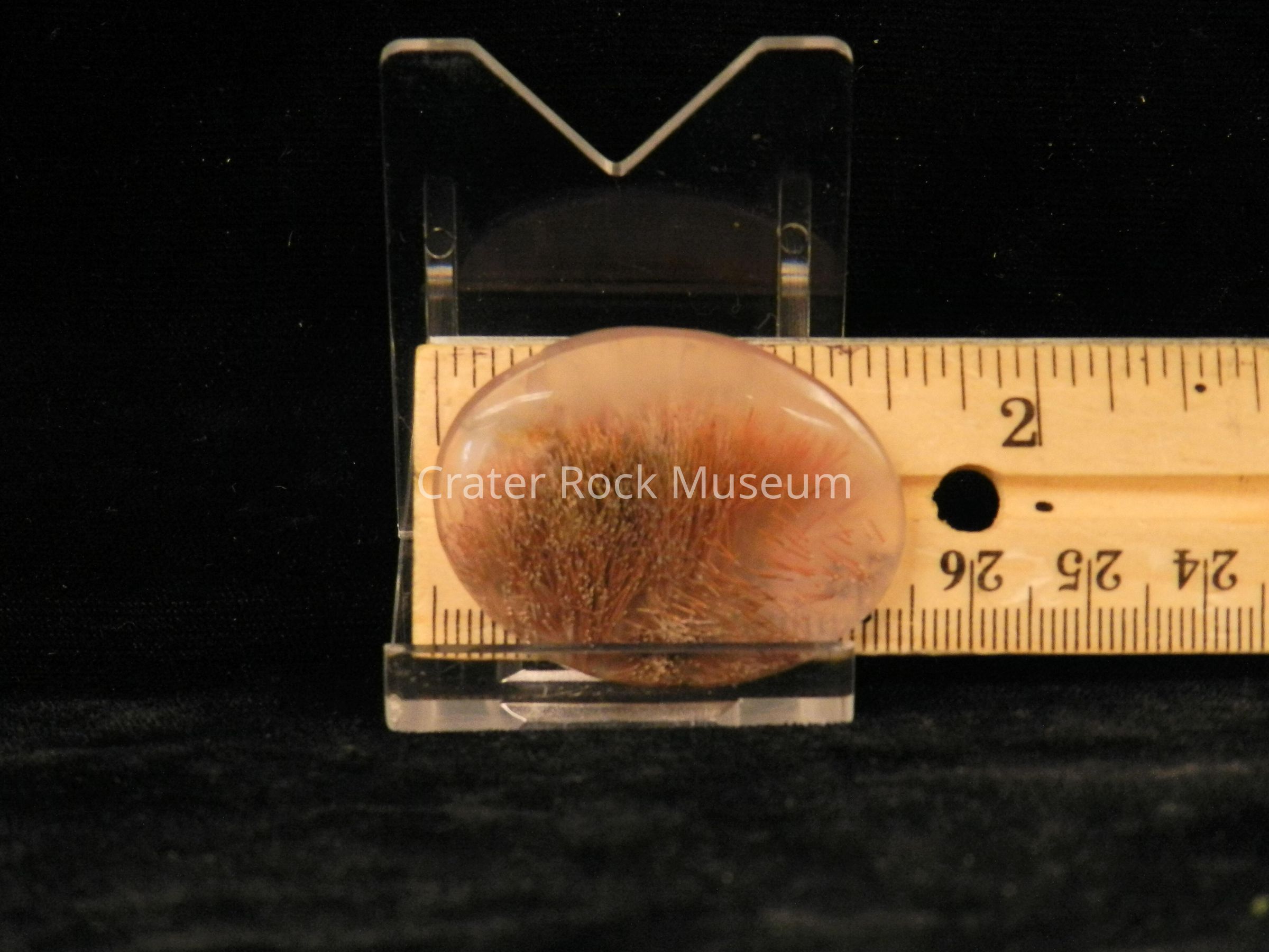 Description: Small oval with polished convex face. Transparent creamy white with reddish-brown and yellow splaying with some black in center.Collection