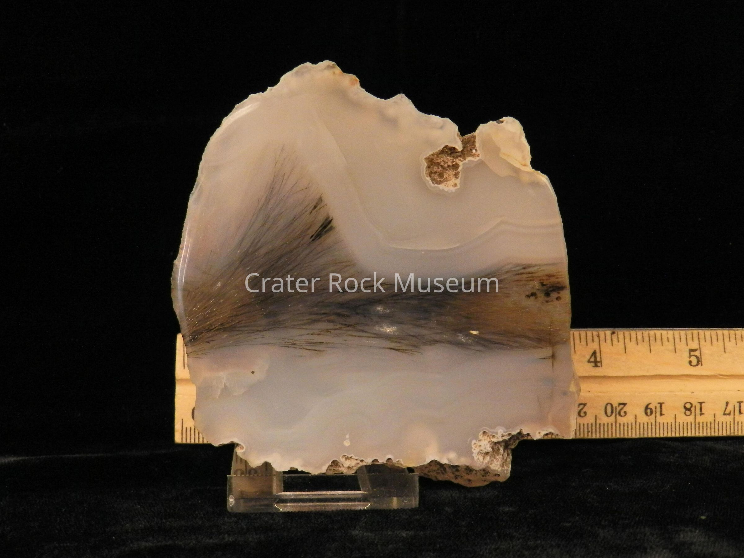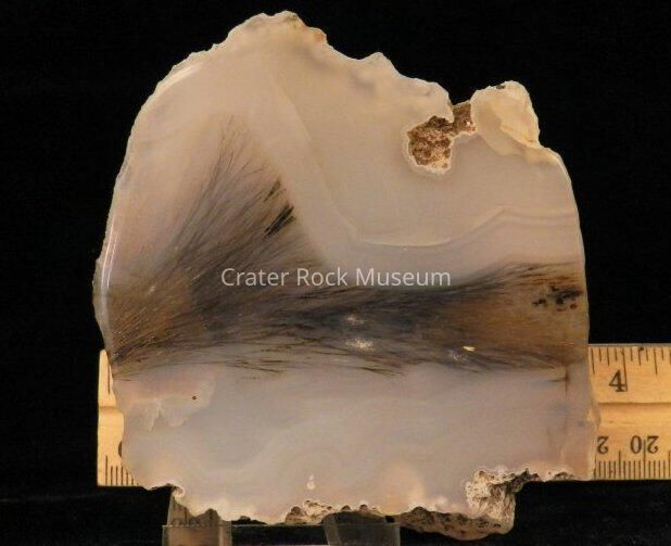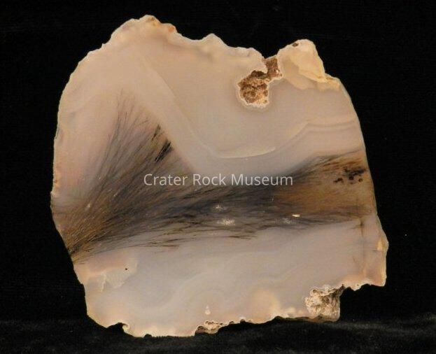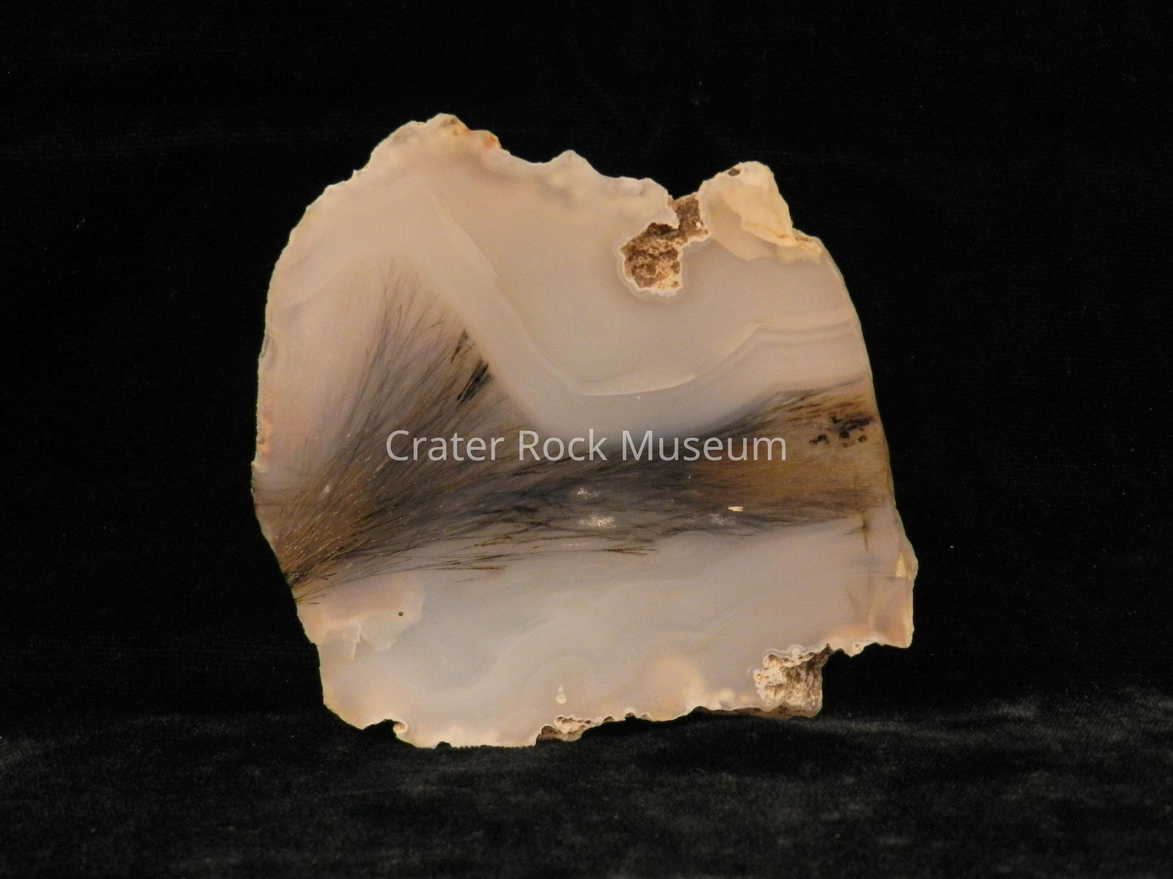Description: Thick slab with rough, concave back and polished face. Translucent creamy white with a band of black hair-like splaying in the center area.Collection