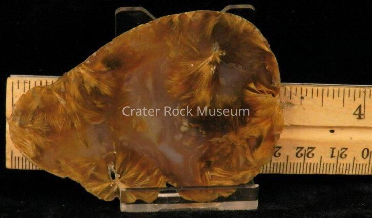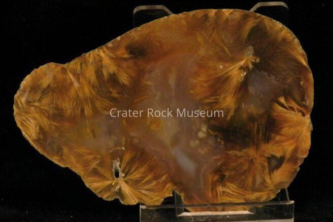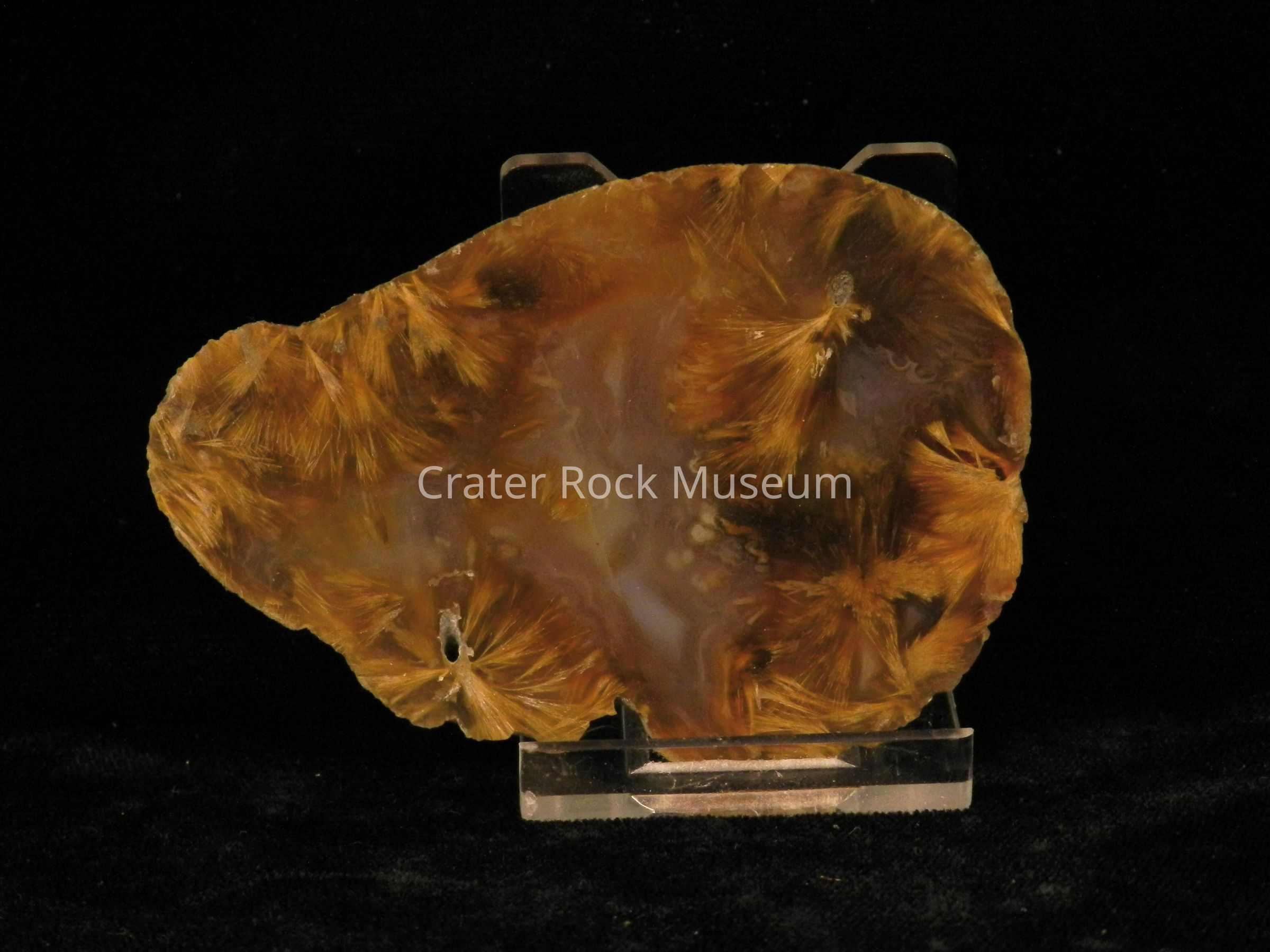 Description: Smooth, rounded back with polished face. Translucent reddish-brown and tan. Hair-like "flowers" surrounding a common center.Collection