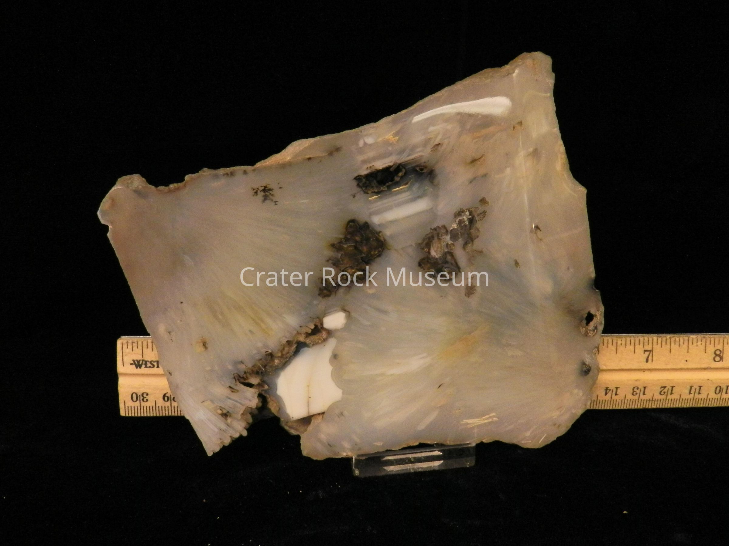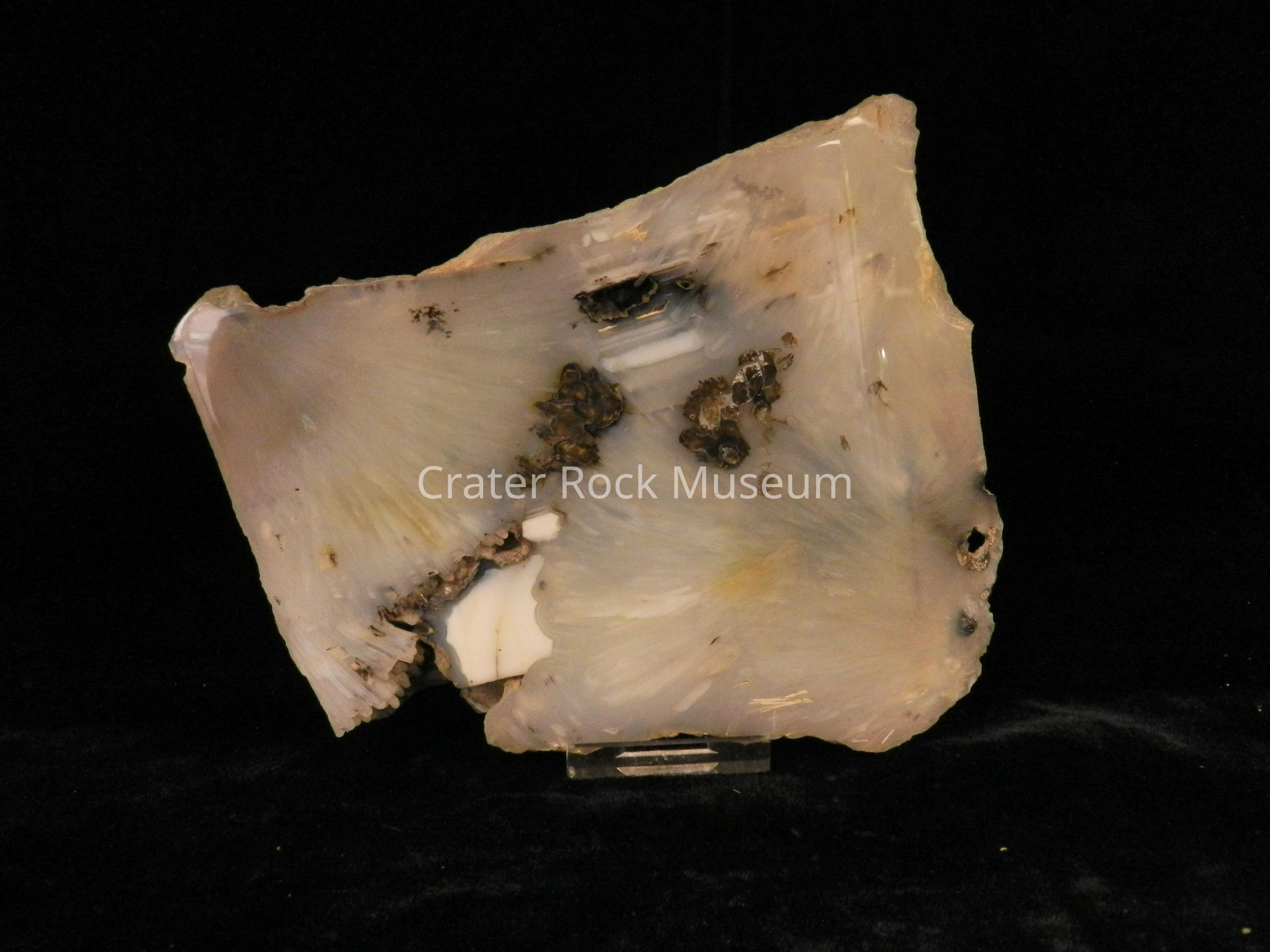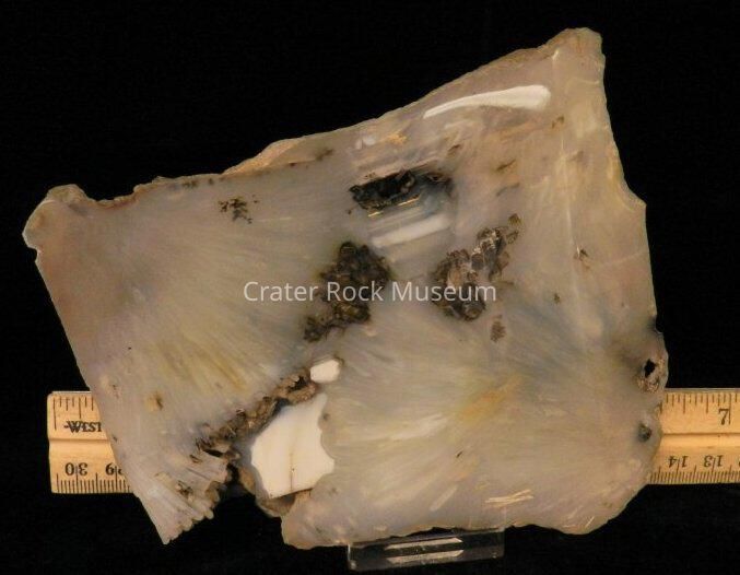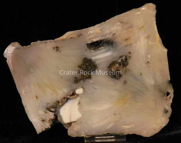 Description: Thick slab with rough, porus back and polished face. Translucent creamy whites, greens and yellows in multi-directional splaying with black spots in center.Collection