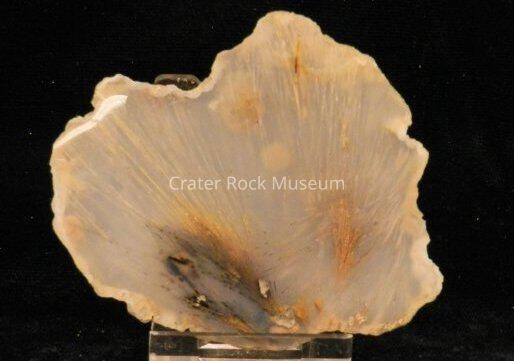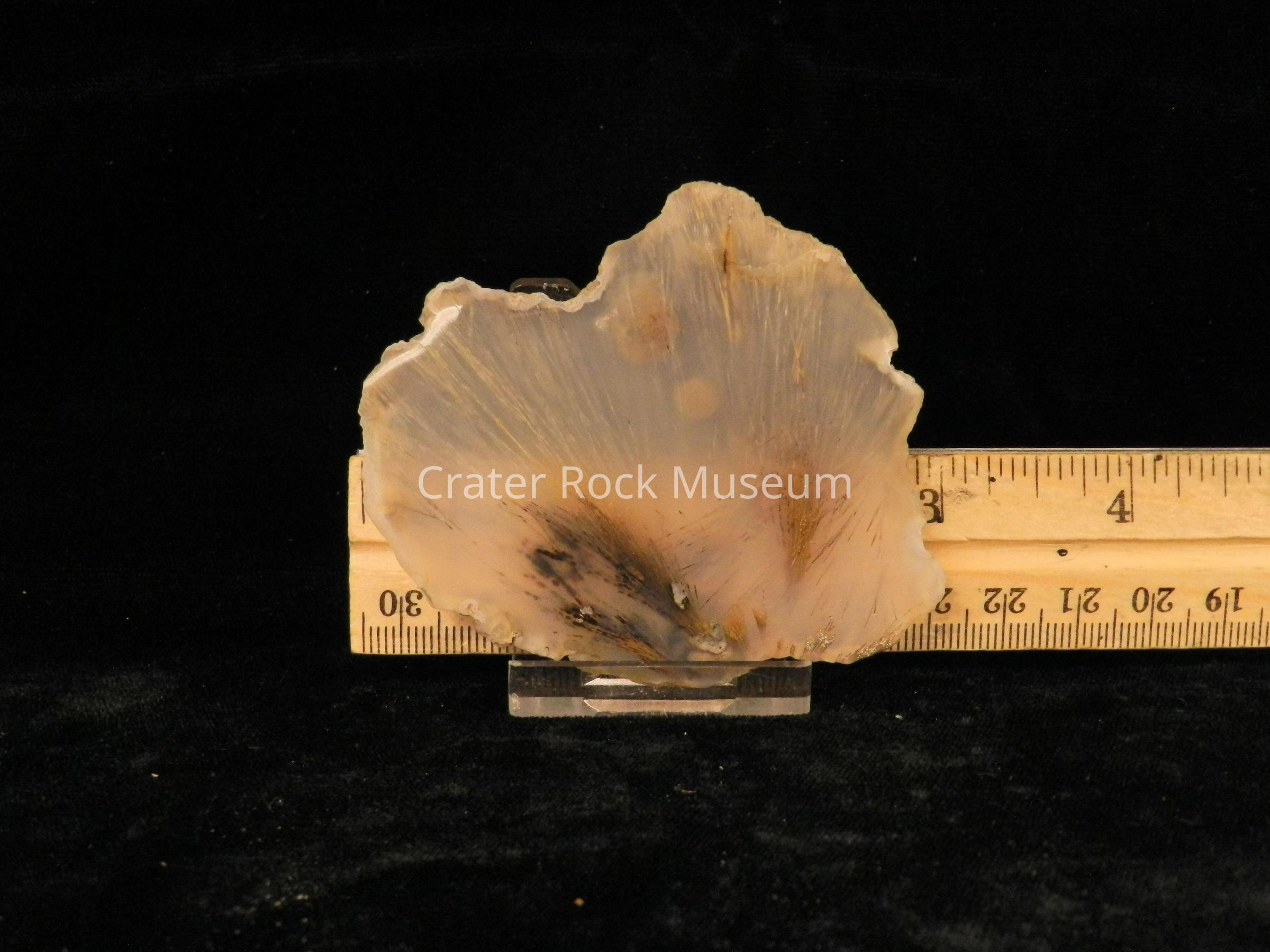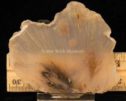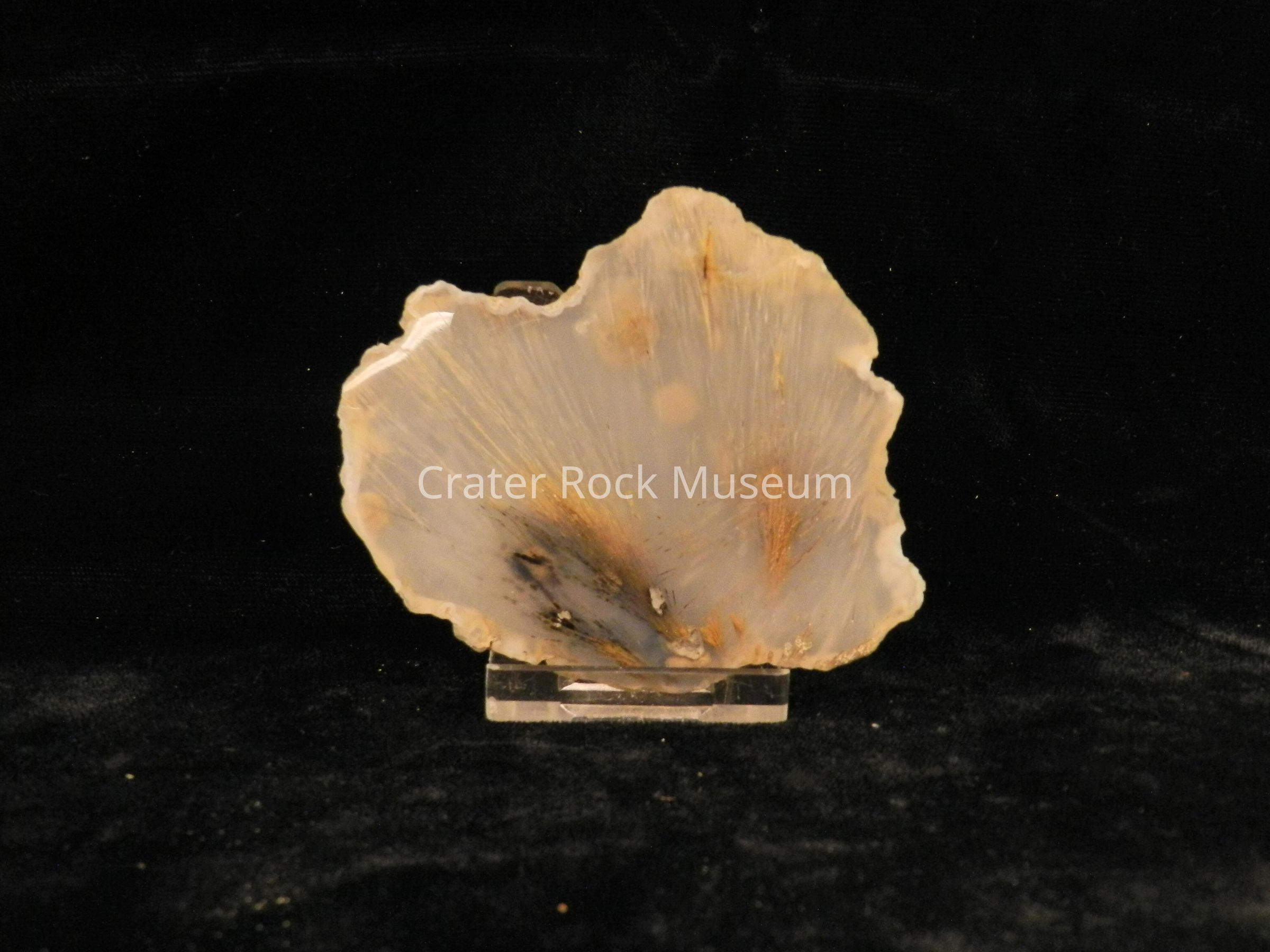 Description: Thin slice with polished face. Translucent creamy white and tan with a light and dark brown splay throughout, with one black area.Collection