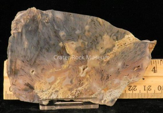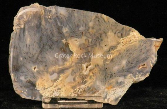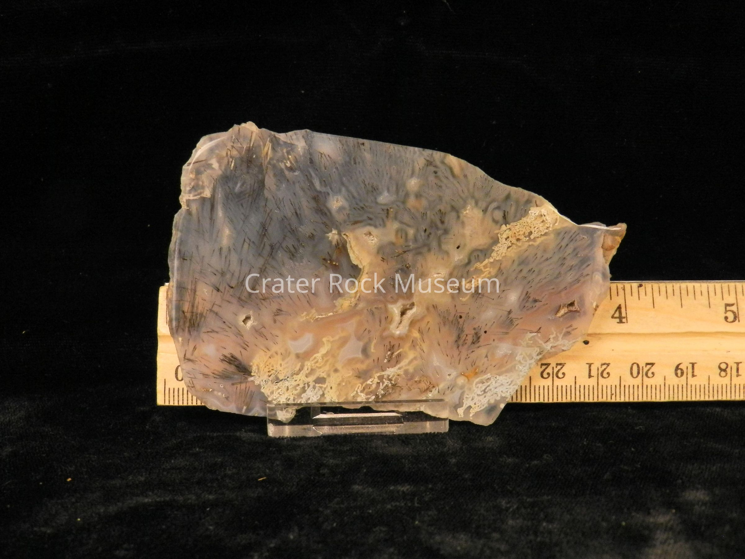 Description: Thin slice with polished face. Transparent smoky blue and tans with numerous "needle-like" black splays with some slight dull lime green present.Collection