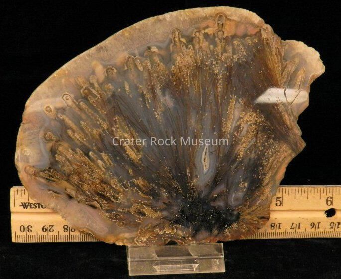Description: Thin slice with polished face. Transparent tan and blue-gray with brown and tan needle-like splaying.Collection