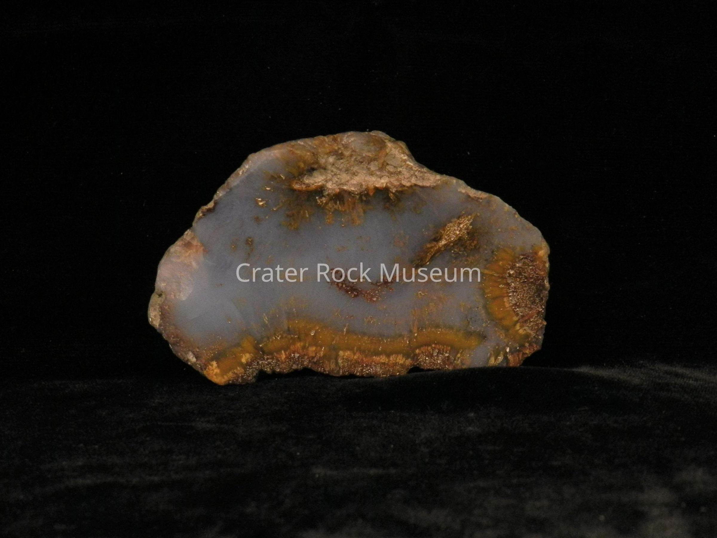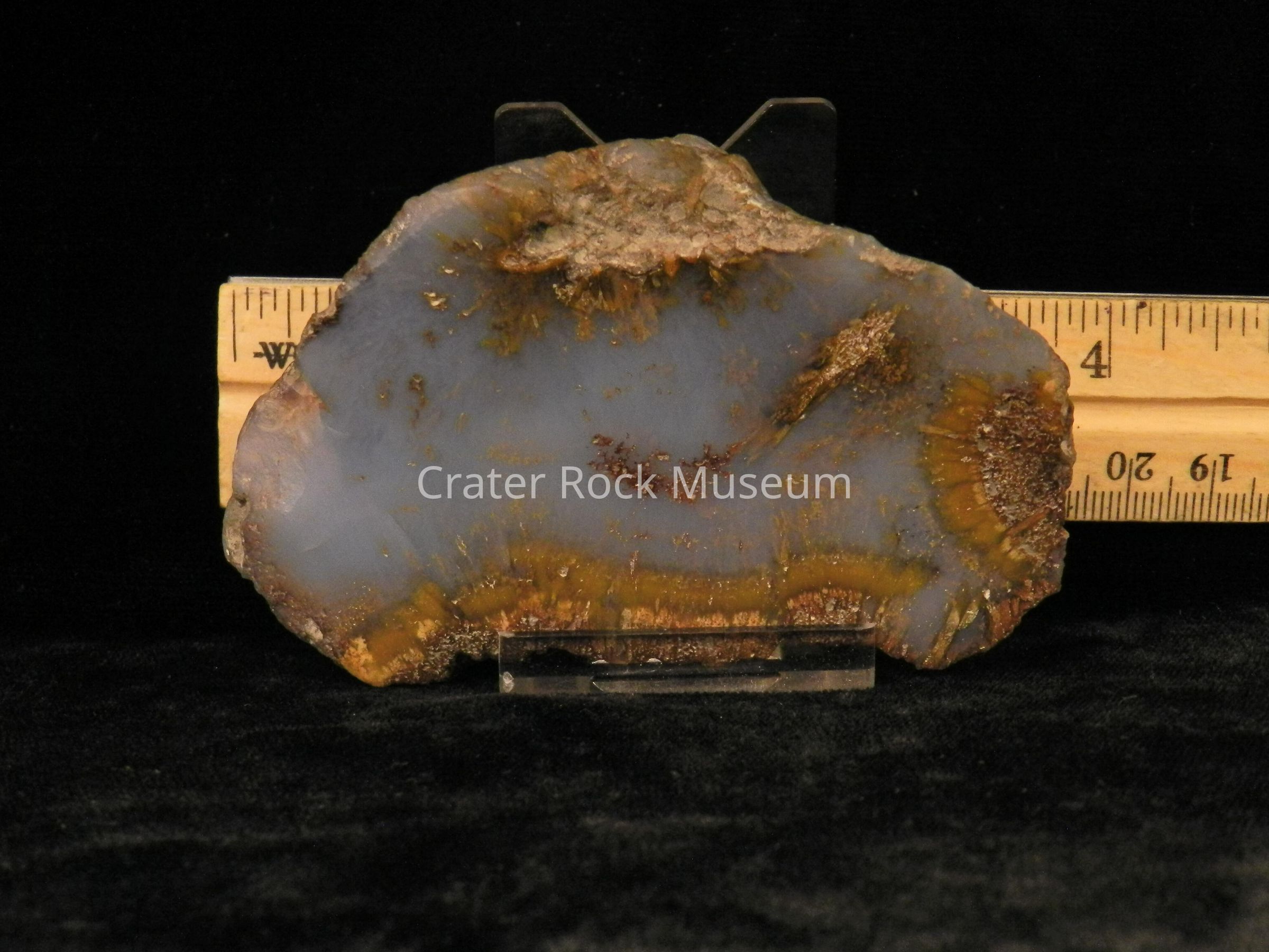 Description: Thick slab with rough back and polished face. Translucent blue-gray in the inner areas and some dull yellow and beige bands on the outer regions.Collection