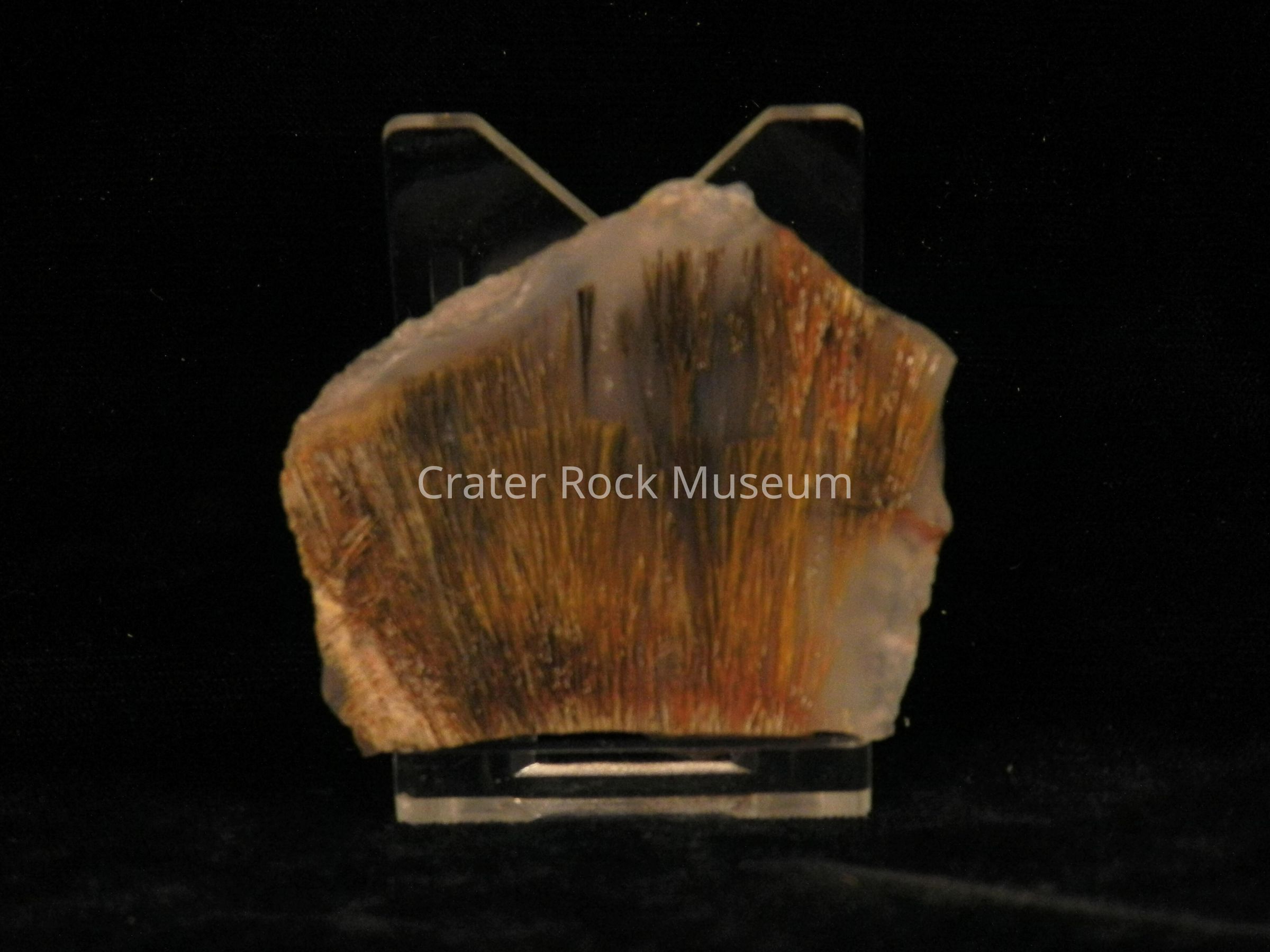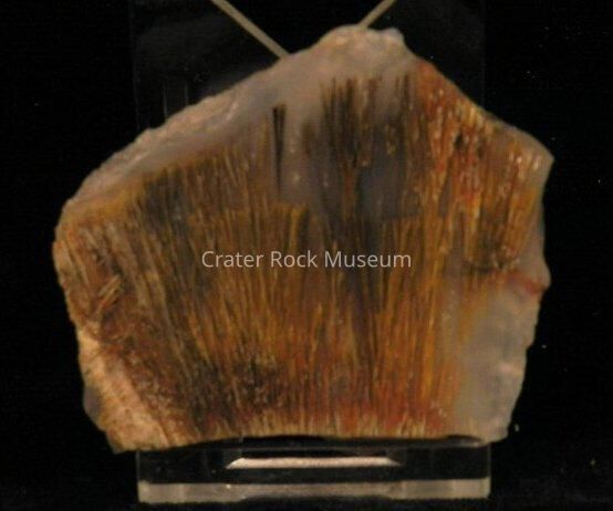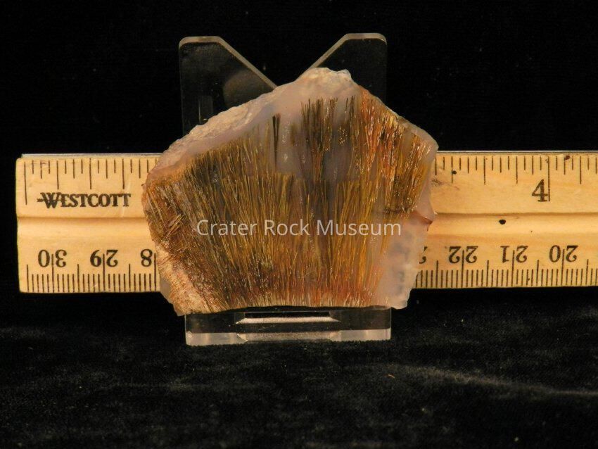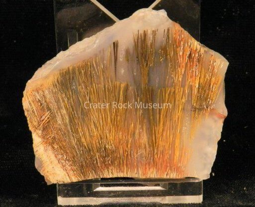 Description: Rough back with polished face. Translucent blue-gray on outer edges with gold, brown and black needle-like uniform splaying.Collection