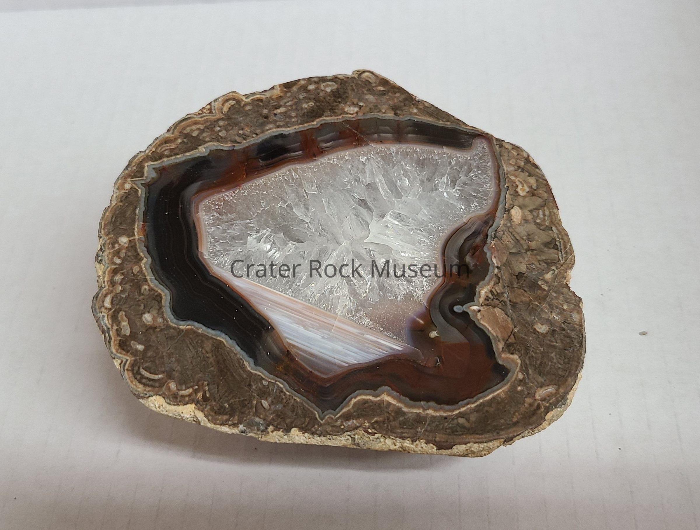 Description: (Delmar) Thunderegg with a large crystal center in white. Bedding lines on one side