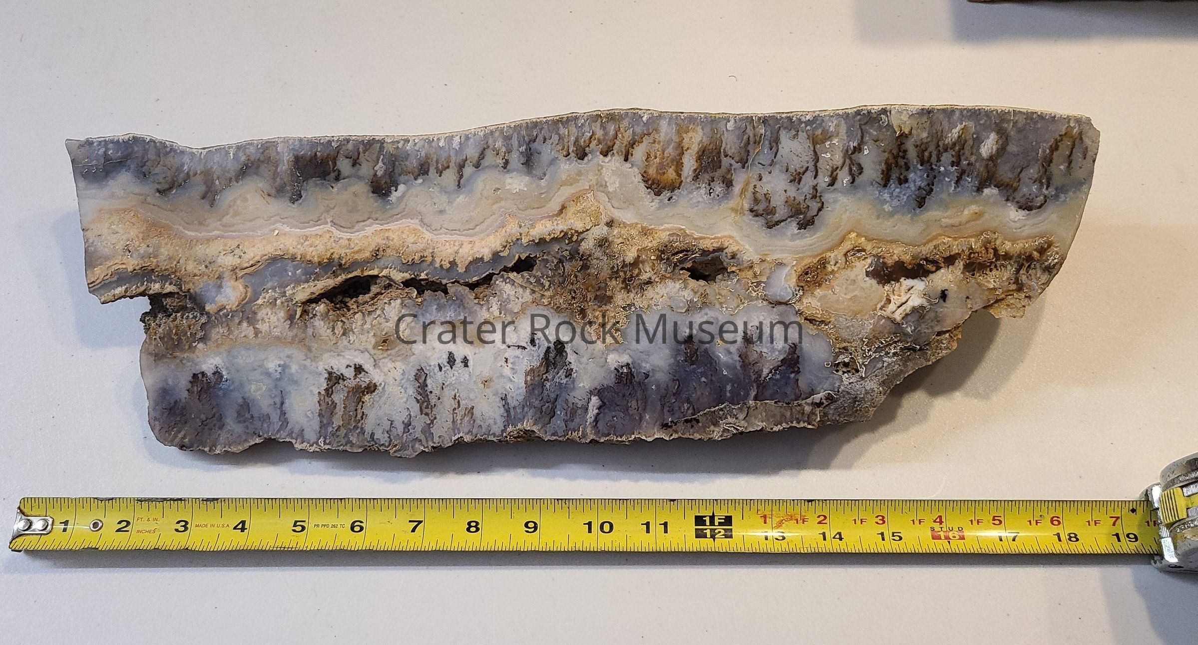 Description: Large course, elongated slab with polished face. Translucent blue, white and beige with "cascading" effect from outside edges towards the center section of the slab.