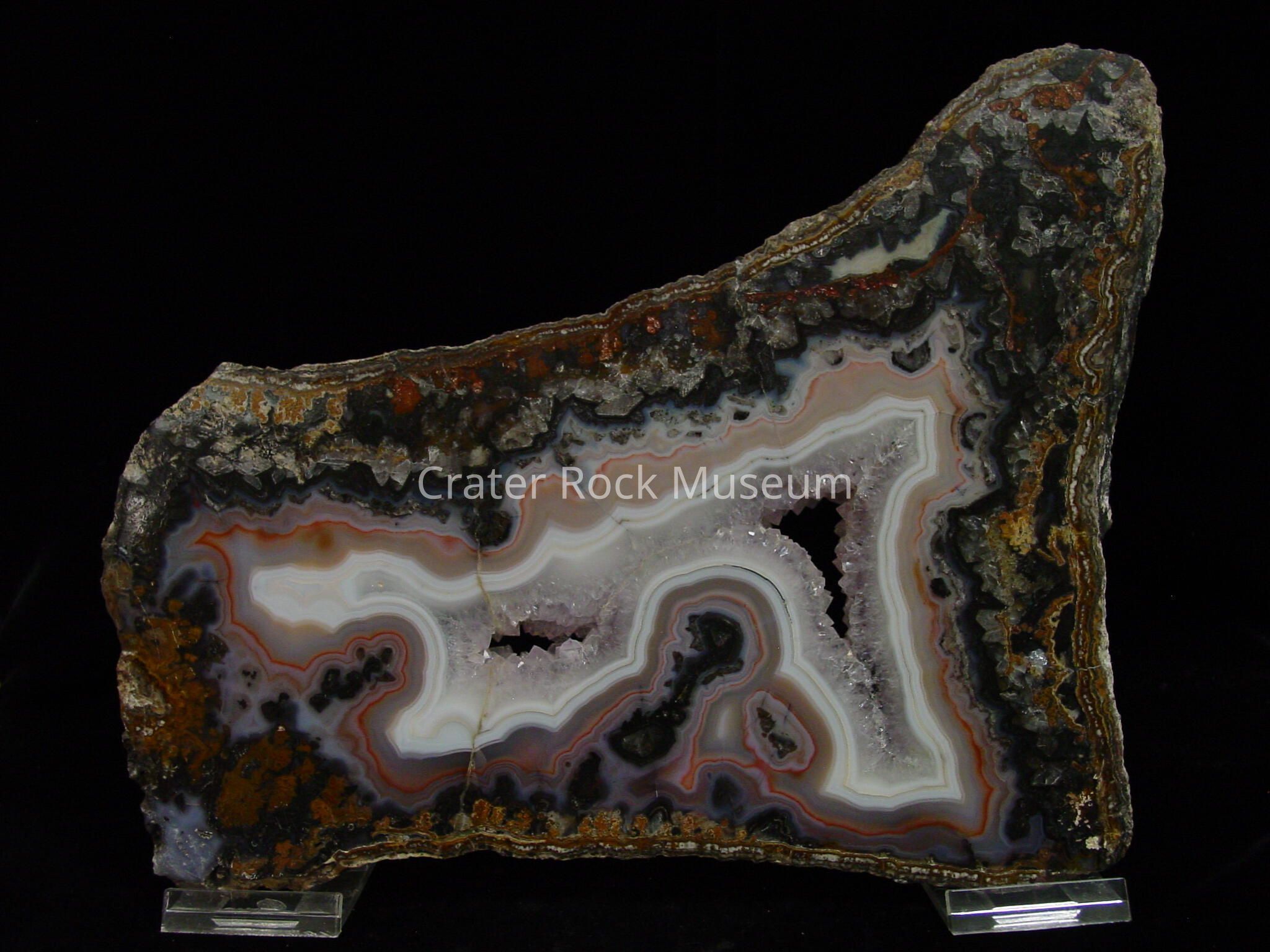 Description: Thick, rectangular slice with one corner that is extended. Piece has onyx and calcite mixture in a thick 'casing', surrounding agate in pink and white fortification lines in center. Mid-most mineral is quartz in a pale amethyst tone.Collection