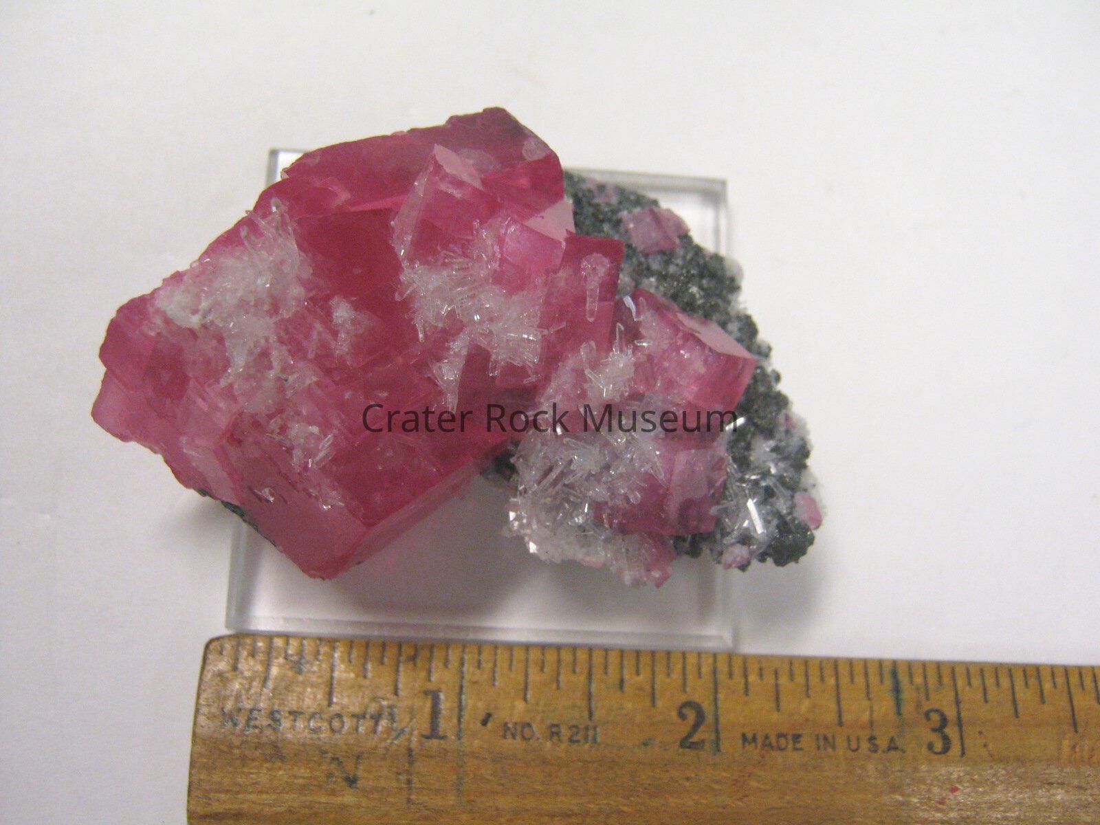 Description: Small specimen with a small grouping of light red to pink angular crystals on a dark gray and white matrix.