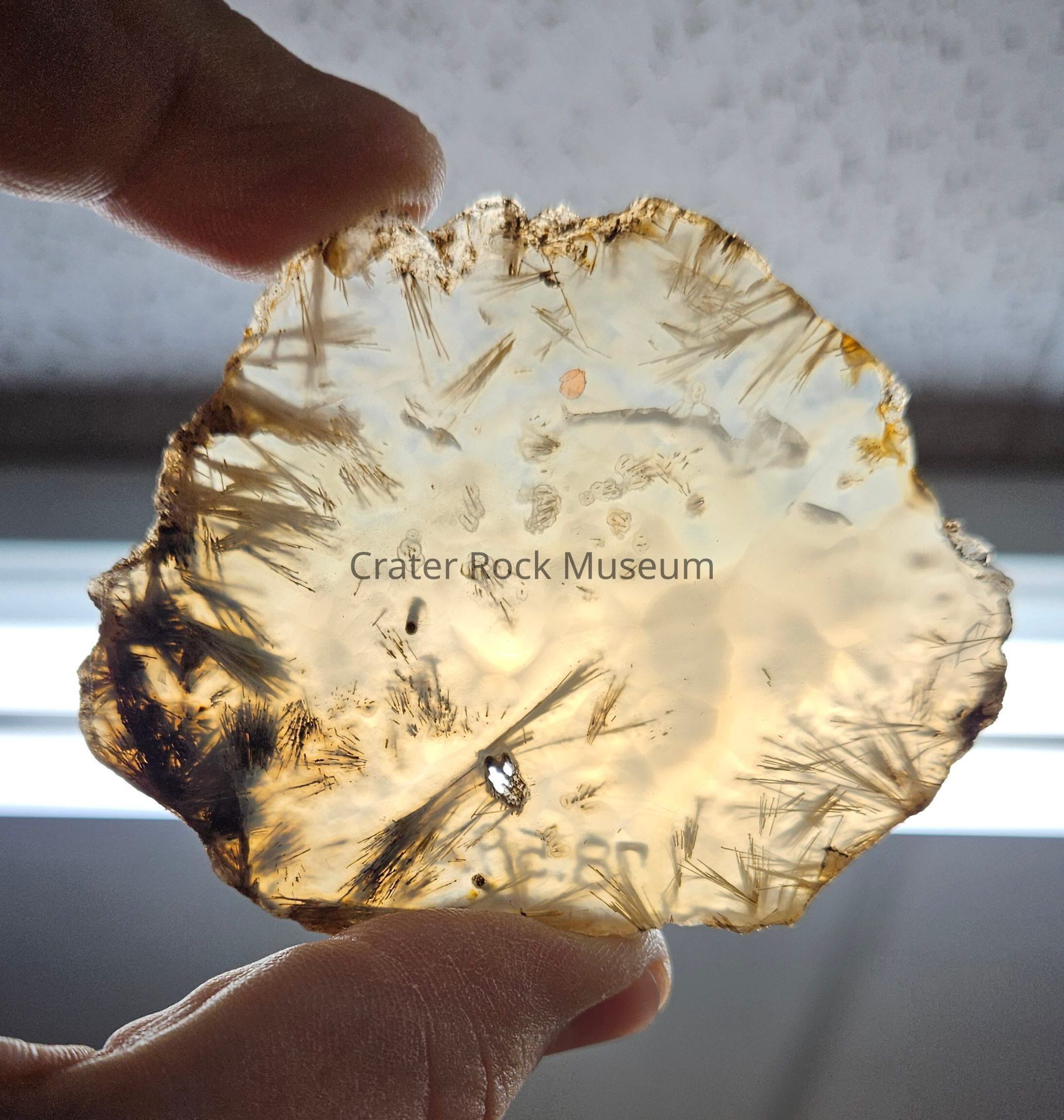 One slice of Agate, Sagenite meaning clusters of needle-like shapes with a matrix of nearly Clear Chalcedony. Probably from NM. Colors: Light and Dark Sagenite in White.Dimensions