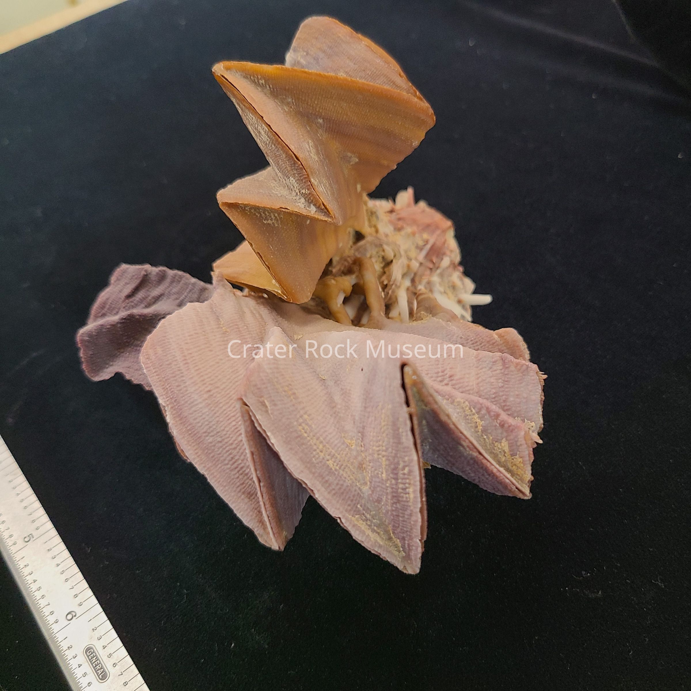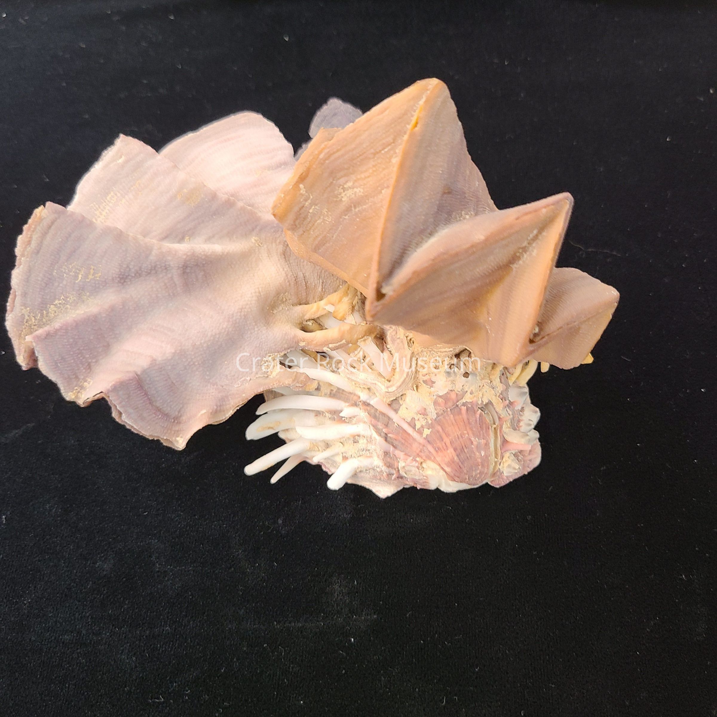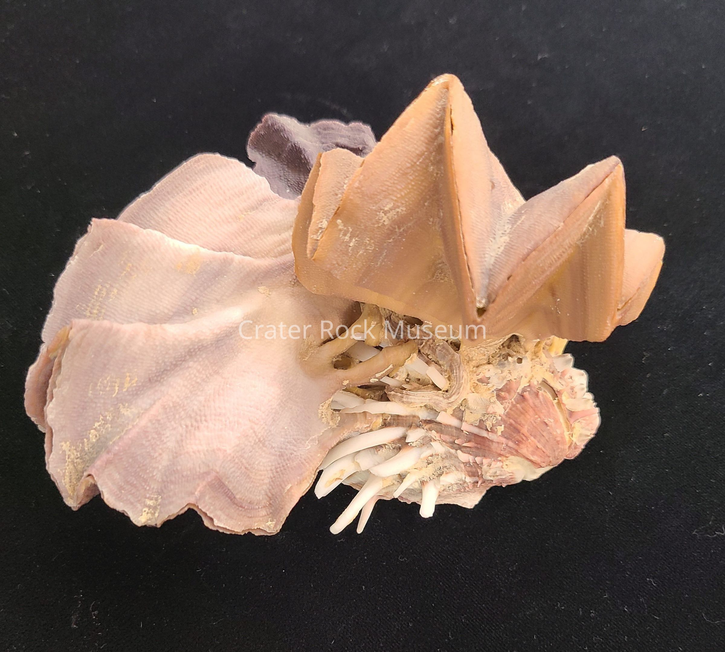 Three cockscomb oysters (Lopha cristagalli) congealed to a spiny oyster (Spondylus variety)Location