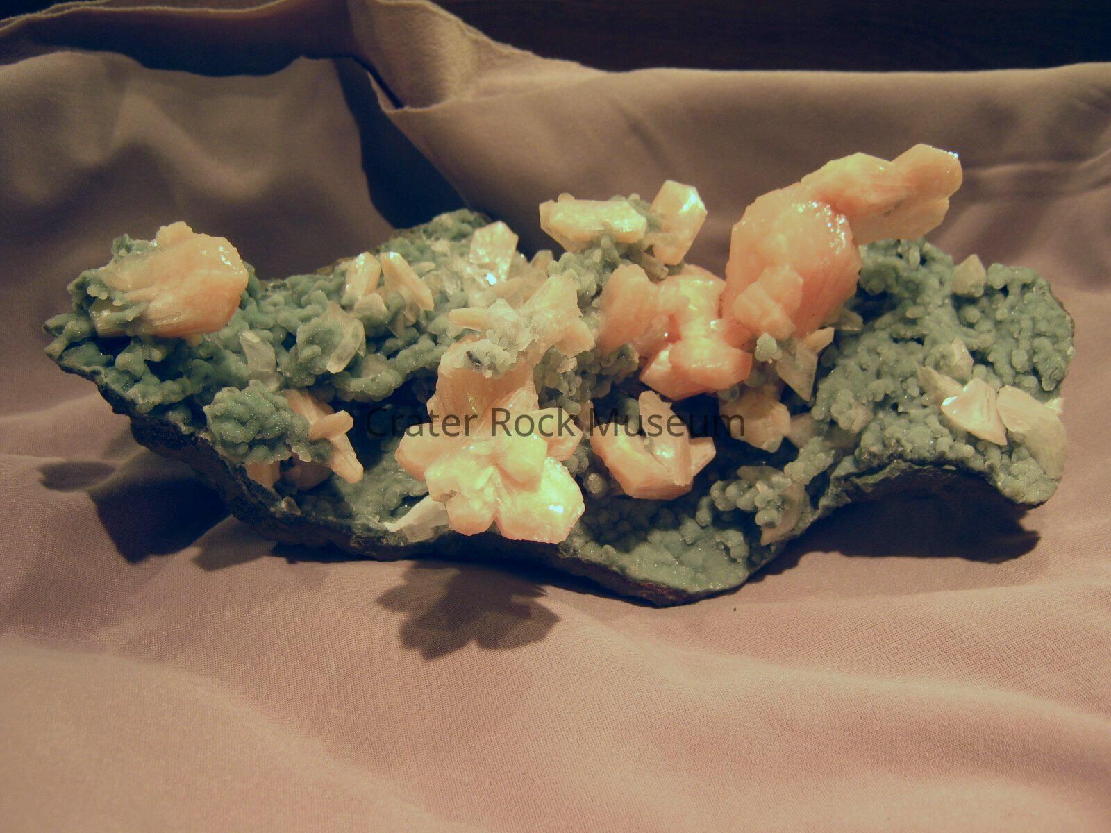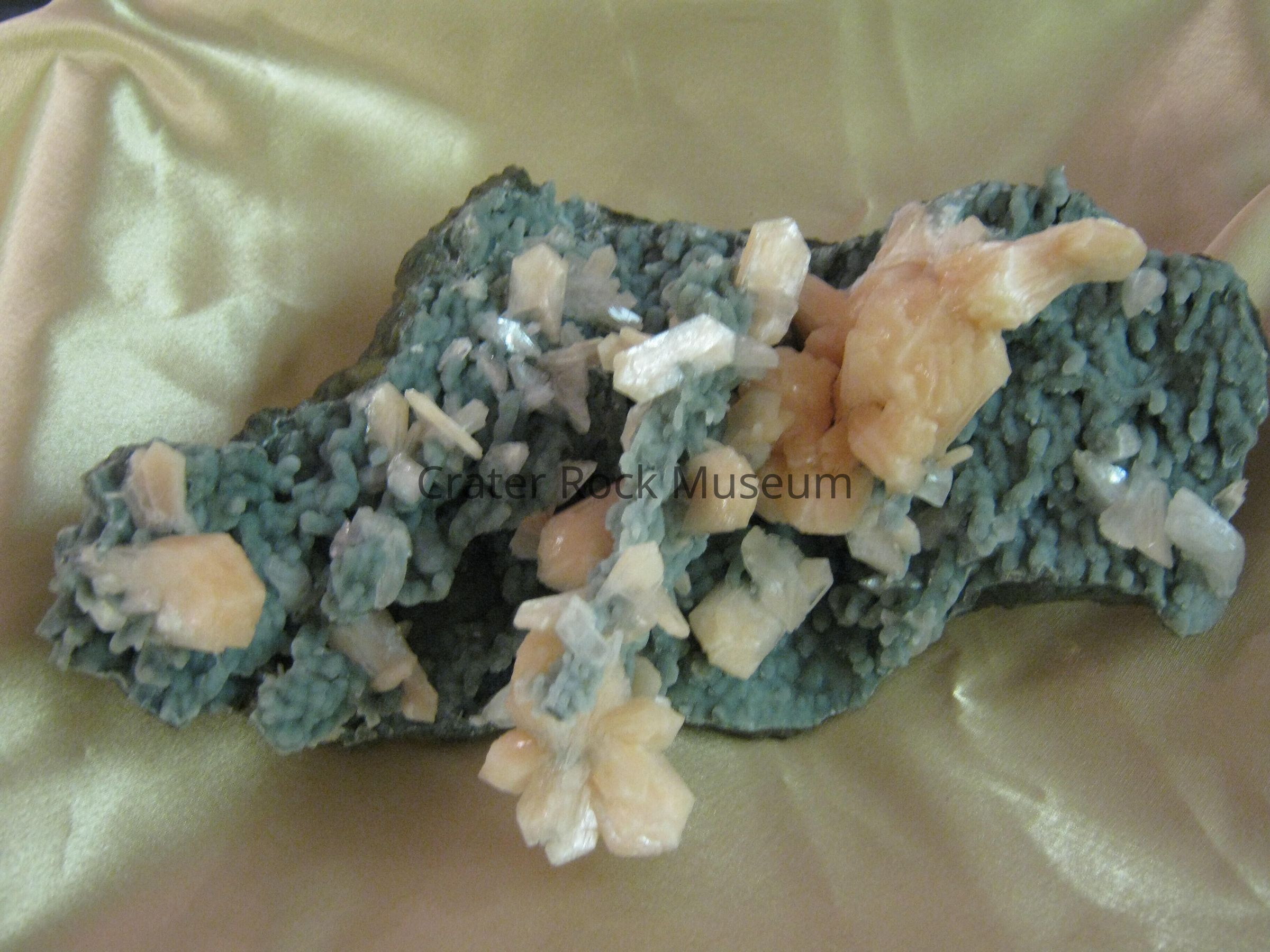Description: Peach colored crystals with greyish blue crystals gowing around it.