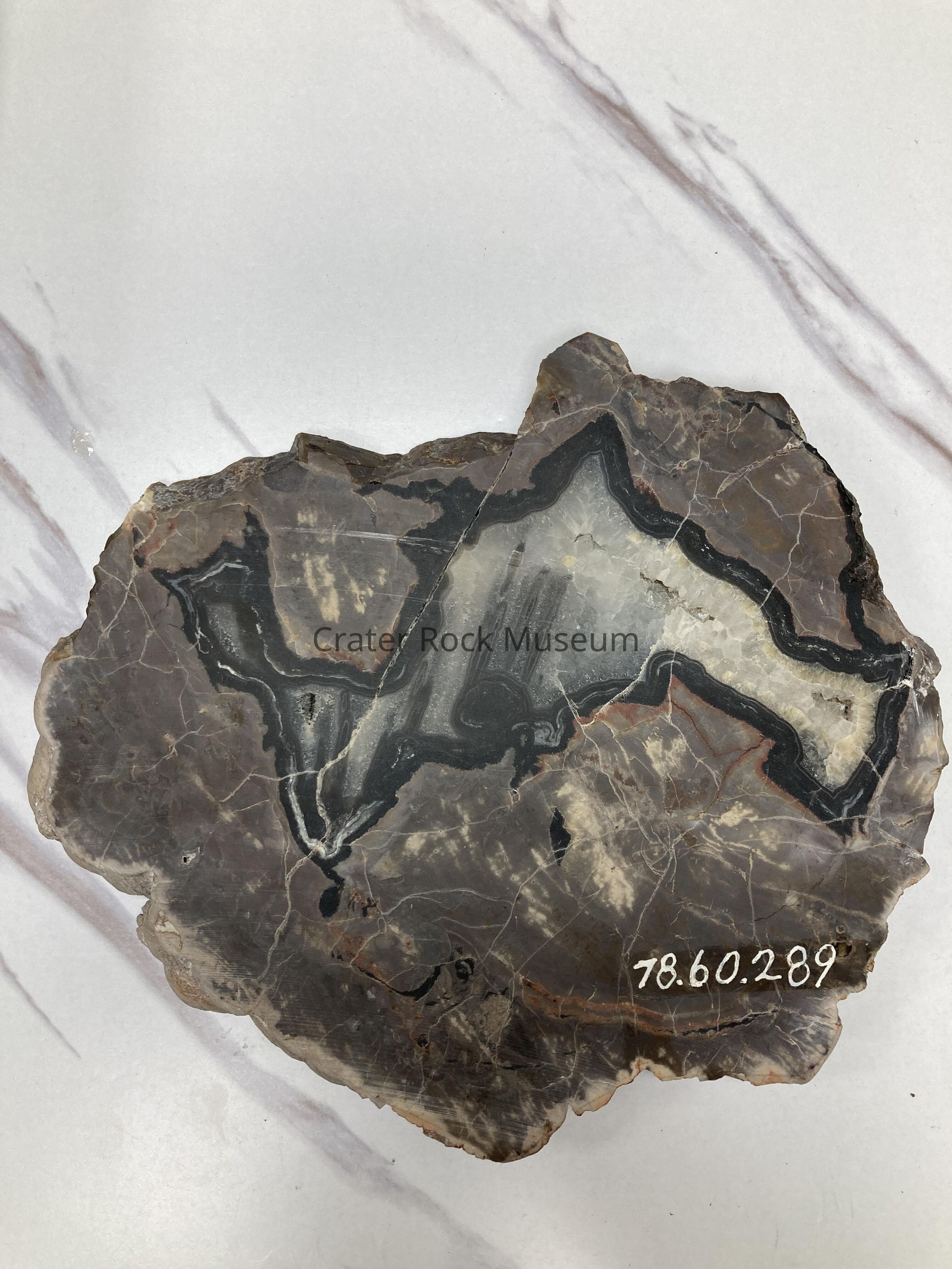An unpolished 5/8" (1.5 cm) thick slice of a Thunderegg from Oak Springs along the Deschutes River, Eastern OR. Colors: Grey and White Crystalline center is surrounded by Black contour line with some Black streaking in center (Stalactites). Surrounding rock is in Violet Grey with some Orange stains and Beige. Numerous Cracks.Dimensions