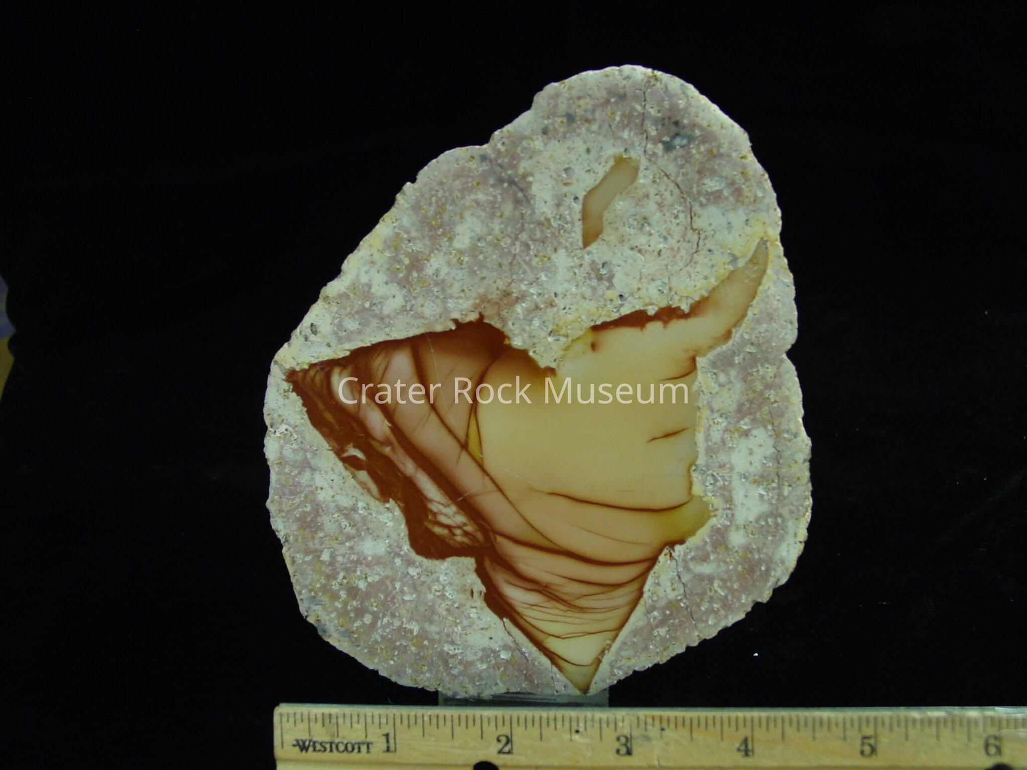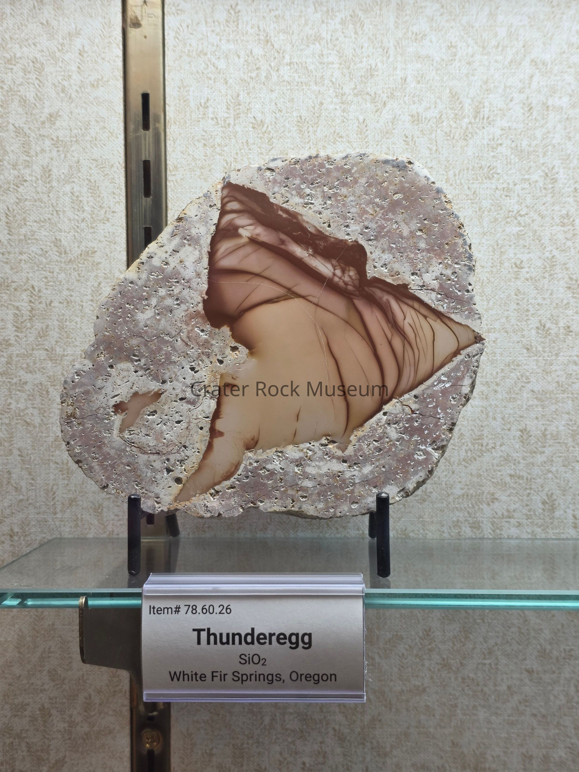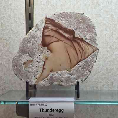 Description: A one of a kind thunderegg from Easter oregon, (White Fir Springs). Matrix is tan to pinkish and is poc marked. Center is triangular and is red-beige to dark tan with dark lines. It looks similar to Bruneau Jasper.Collection