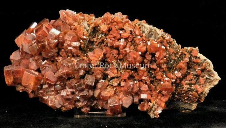 Variety: Vanadinite is part of a chemical series with two other minerals; Pyromorphite (Pb5(PO4)3Cl) and Mimetite (Pb5(AsO4)3Cl). This series is a little different than most chemical series which involve substitution of cations such as calcium for magnesium. Instead, this series substitutes its basic chemical units the anion groups; phosphate (PO4), arsenate (AsO4) and vanadate (VO4). Vanadinite is usually red which the other members of this series and apatite group usually are not. Vanadinite's classic crystal habit is short hexagonal prisms terminated by a pinacoid, or flat basal face. These crystals are wider than they are long and are more blade-like than the barrel shaped crystals so common to the Apatite Group minerals. The high luster and deep red color give vanadinite a nice appeal to mineral collectors.Collection