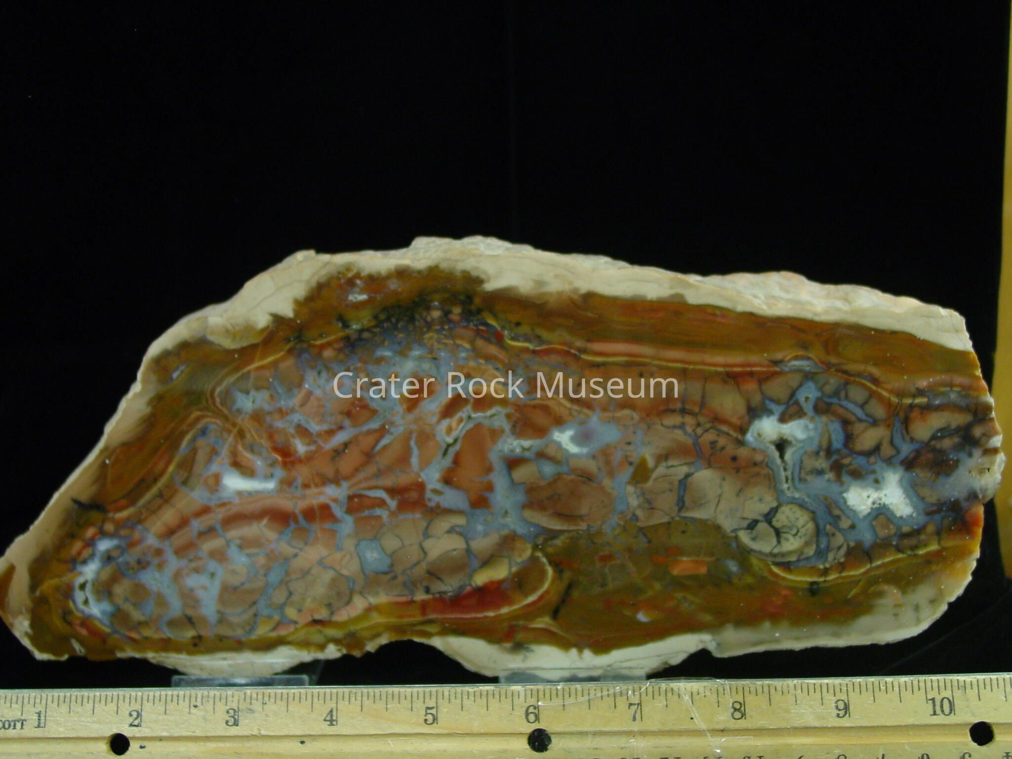 Description: Thin slab with polished face. Beige outer edge with brown band surrounding a brecciated center with blue-gray, light and dark browns, burnt reds, and some white crystalline hollow areas.Collection