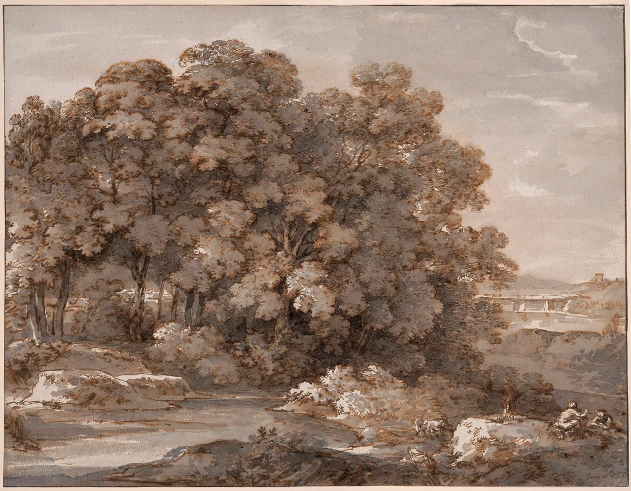 Brown and grey wash with graphite underbracing on paper,